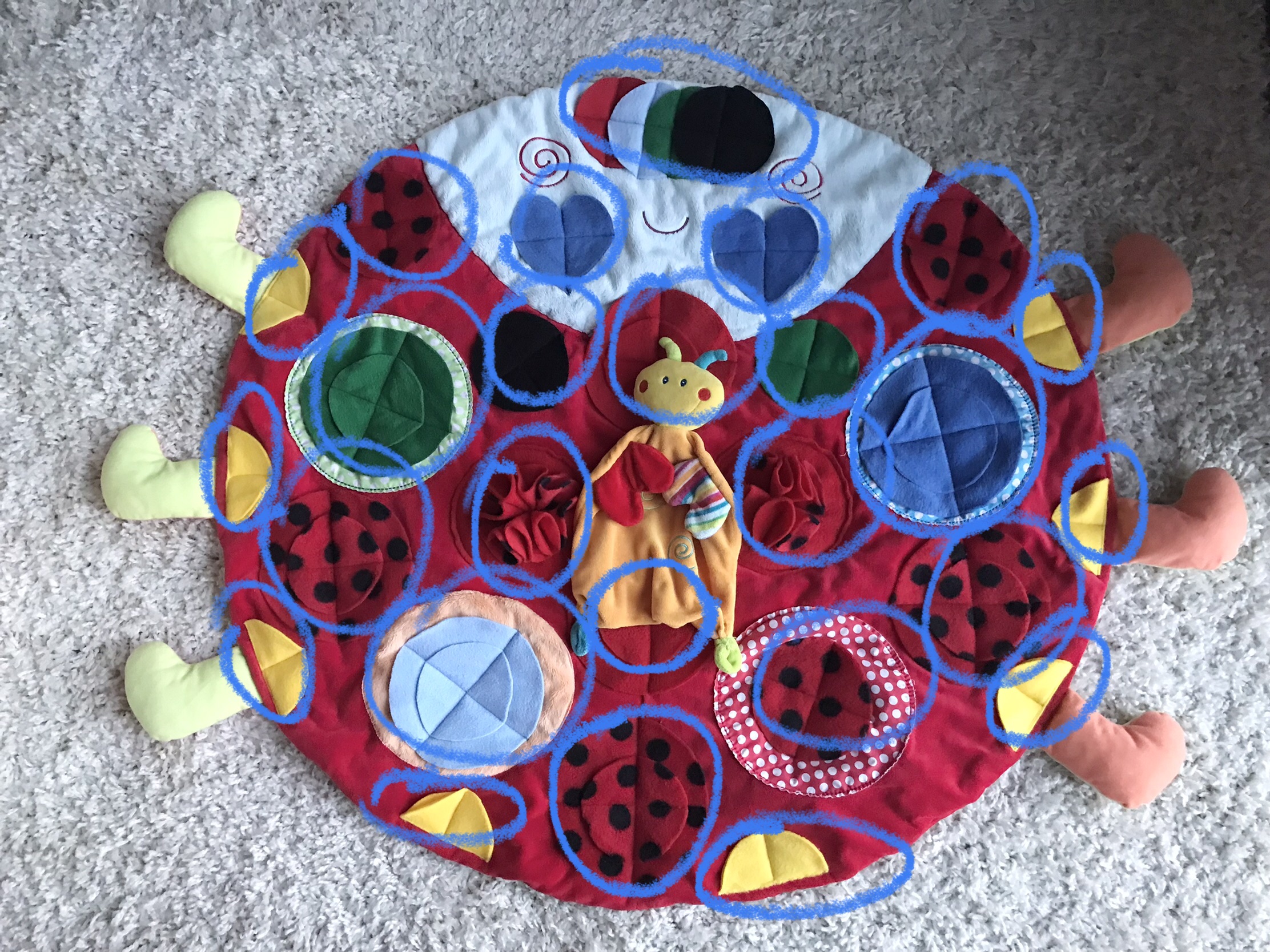 Jede Matte hat unterschiedliche Verstecke Leckerlis, siehe Foto mit den Markierungen. Zusätzlich hat die Matte noch ein abnehmbares Spielzeug zum Kuscheln und lieb haben. Es ist mit Klettverschluss befestigt, welcher bei Bedarf zugemacht bzw. abgedeckt werden kann, damit sich die Hunde die Nasse an dem Klettverschluss nicht aufreiben. Die Spielmatte kann problemlos bei 30 Grad gewaschen werden. Bitte nicht in den Trockner tun.