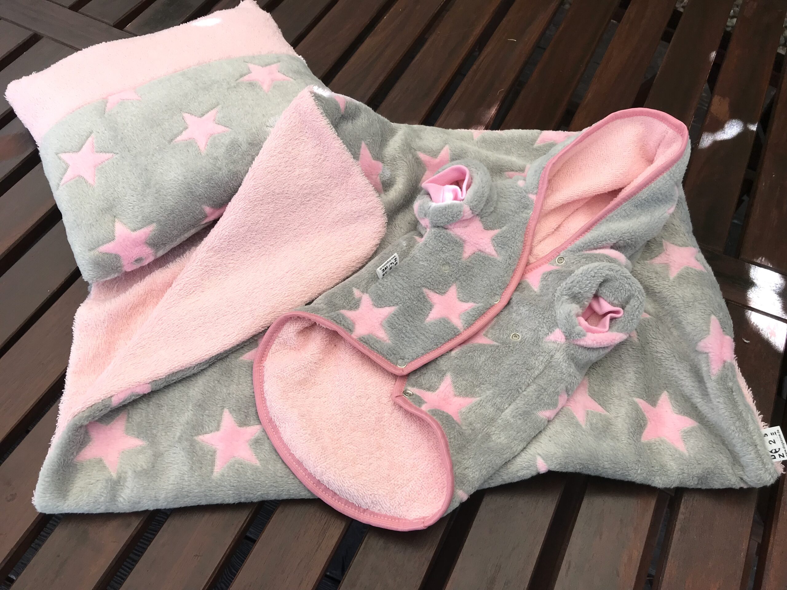 Eine Seite besteht aus Frottestoff,andere aus Wellness-Flausch.das ganze lässt sich zu eine Schlafsack verwandeln