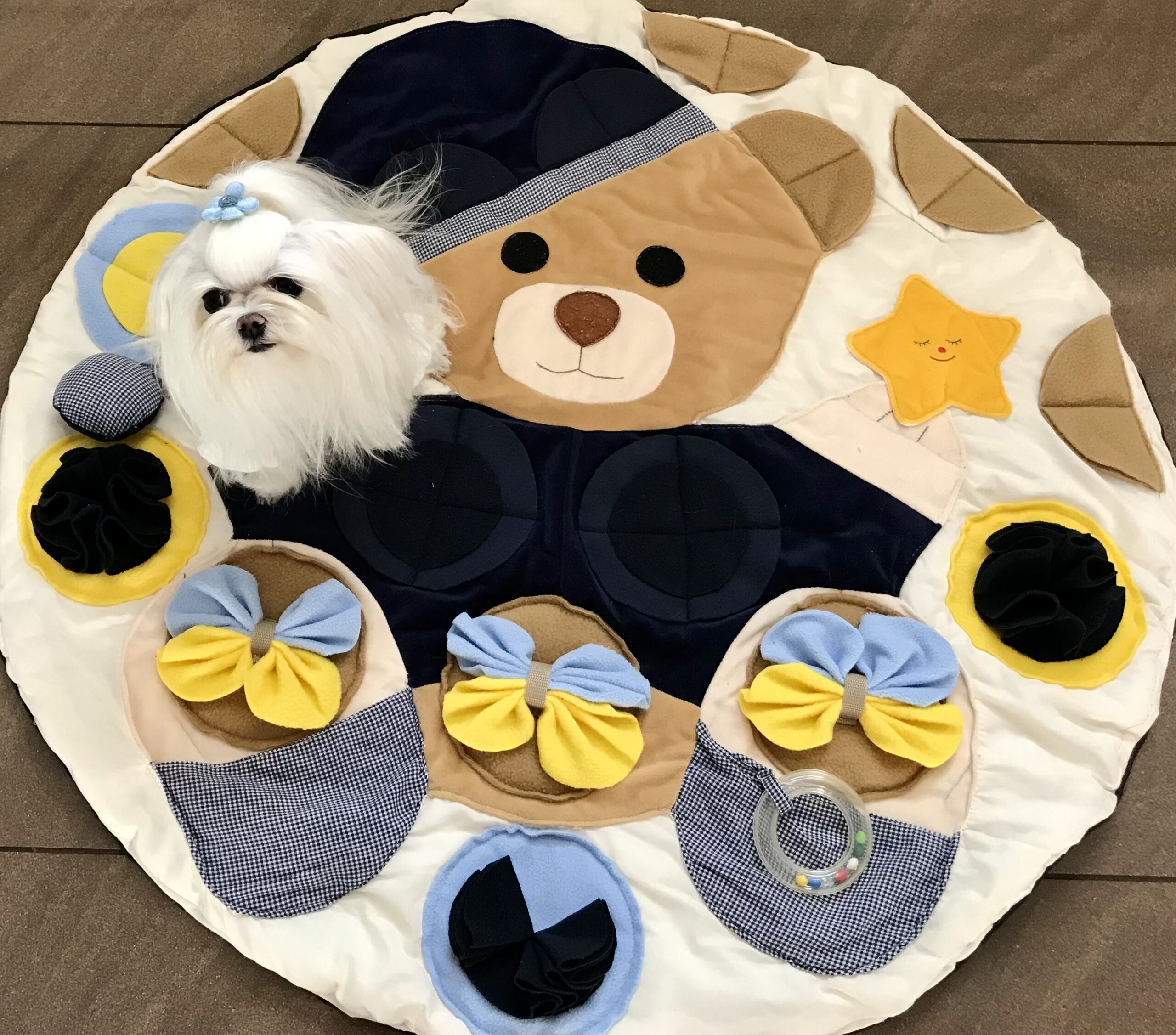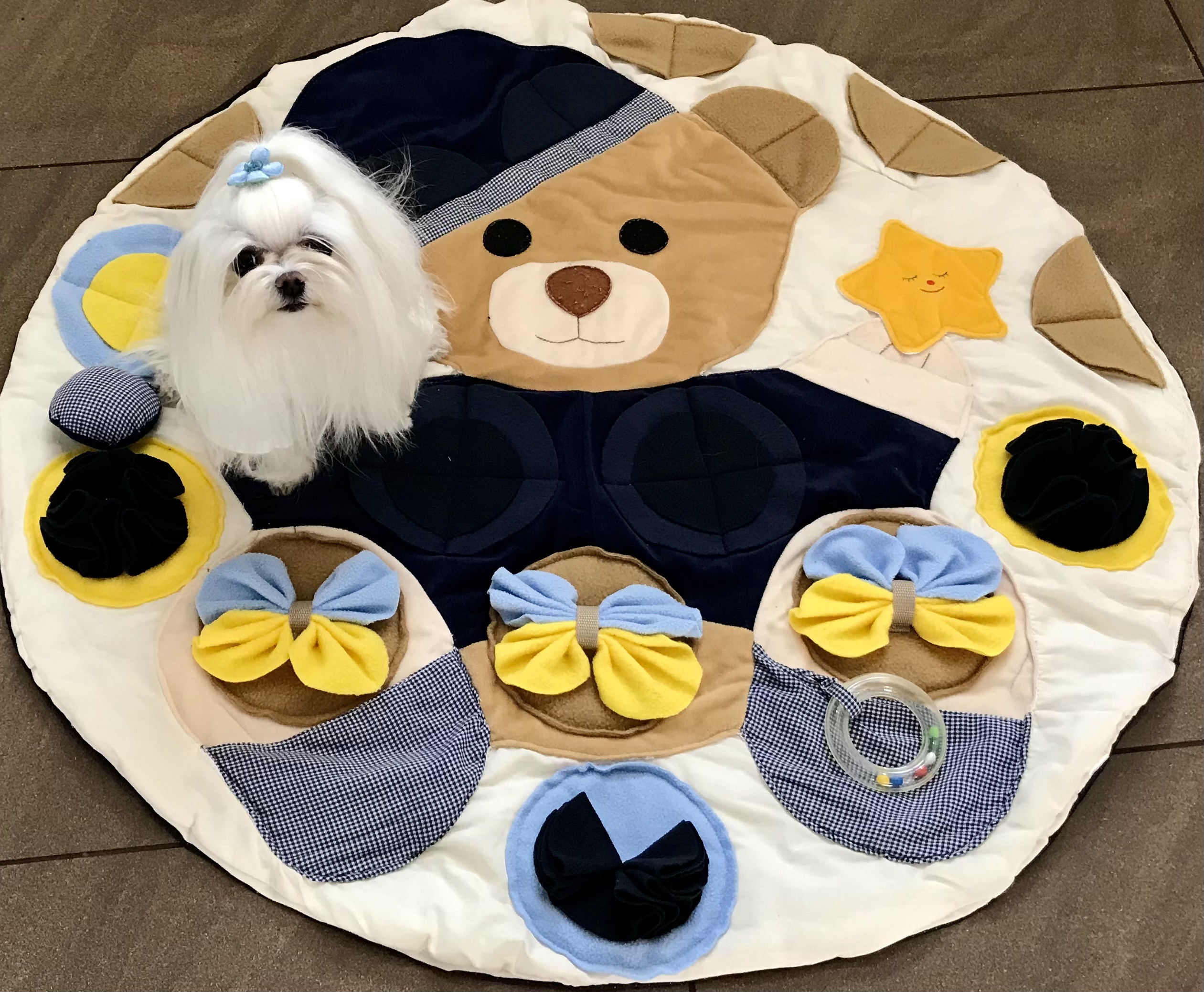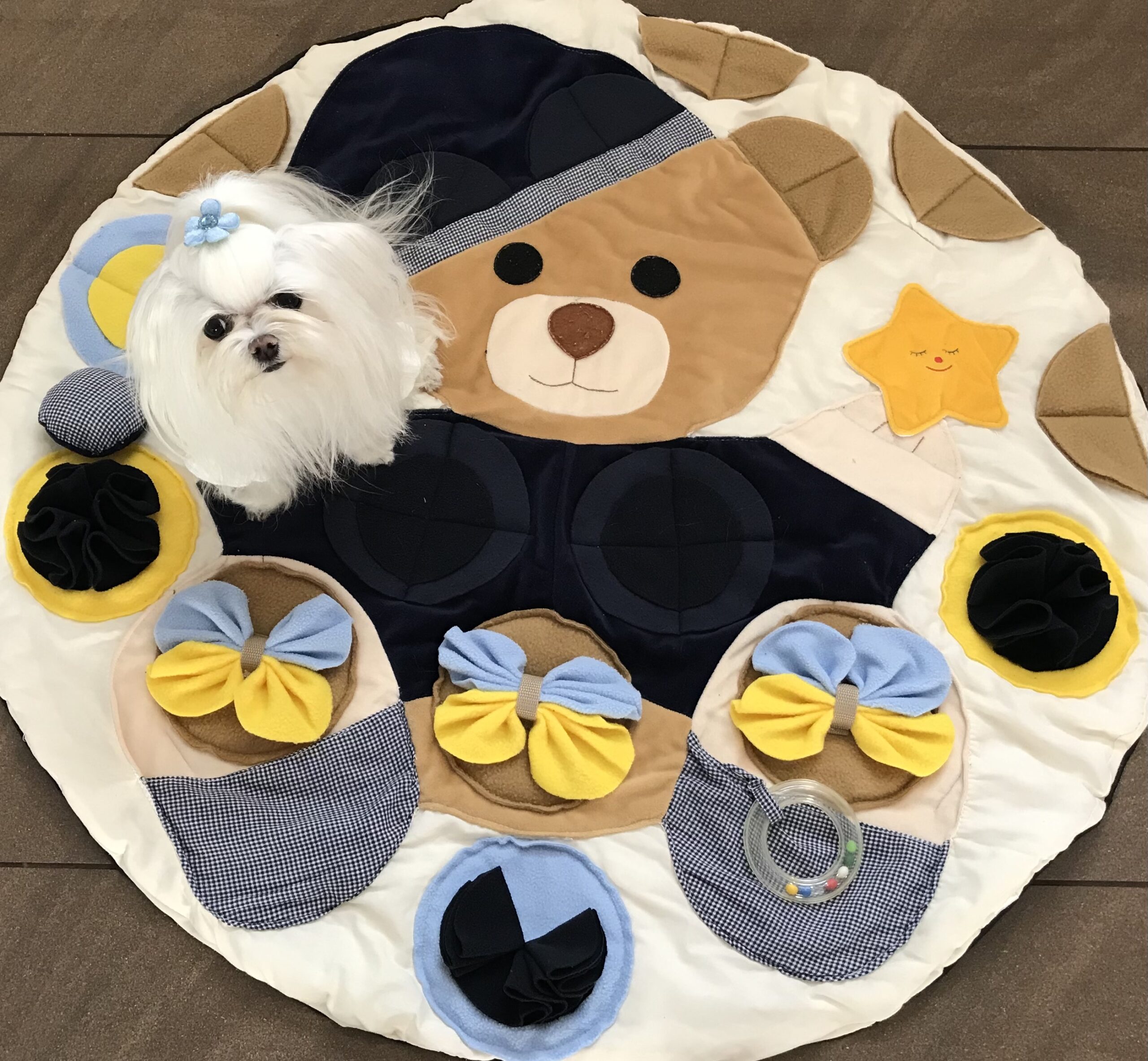Wenn wir länger aus dem Haus gehen, befülle ich die Spielmatte mit Leckerlis – das beschäftigt die zwei eine Weile. Sie können auch Trockenfutter verstecken wenn der Hund z.B zu schnell aus der Schüssel frisst, wenn er sich mehr bewegen muss weil es zugenommen hat oder aber auch wenn er ein schlechter Esser ist wie meine Hunde – manchmal hilft das auch sehr gut.