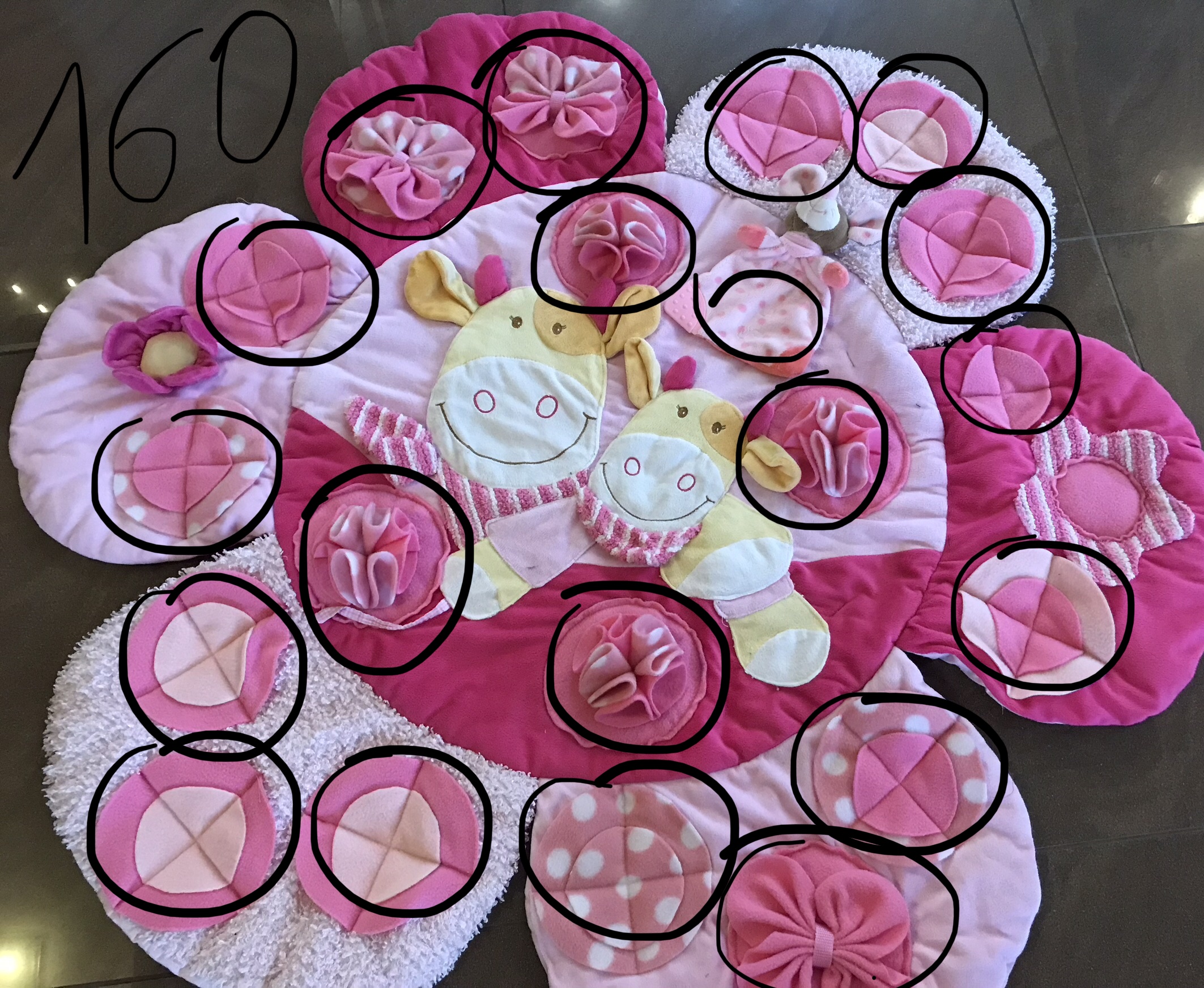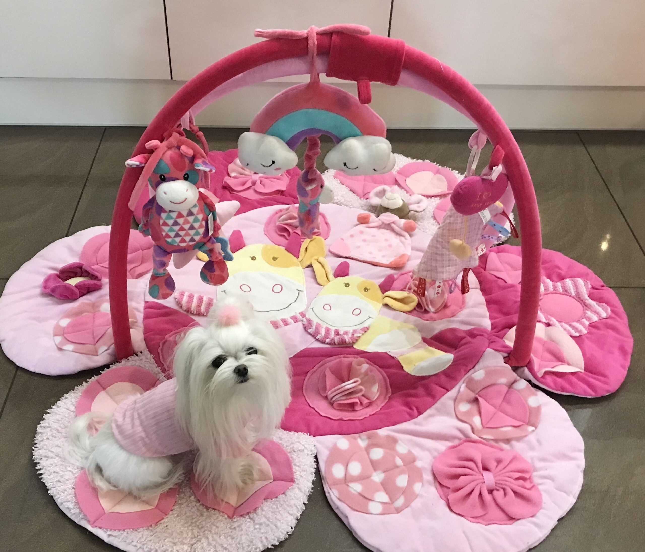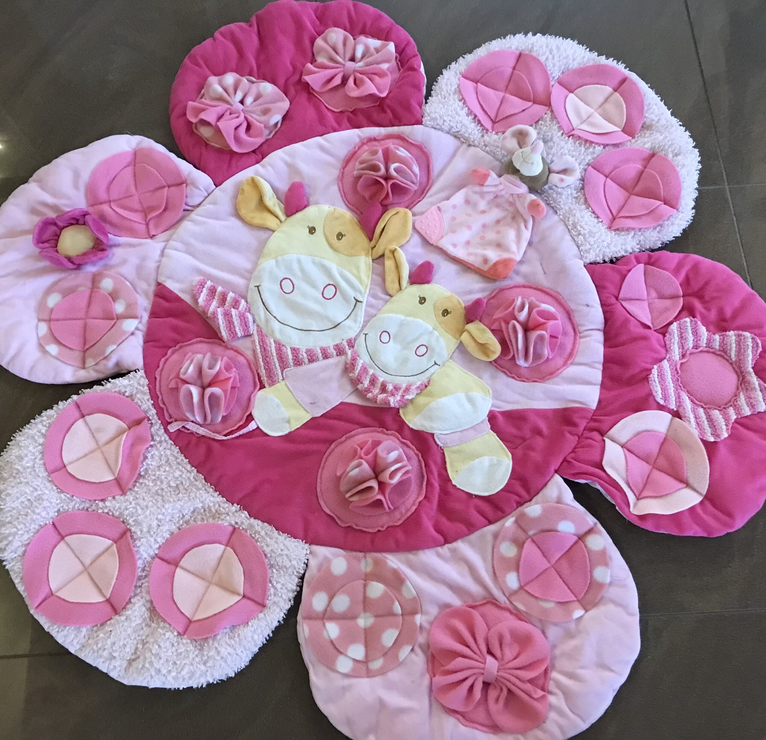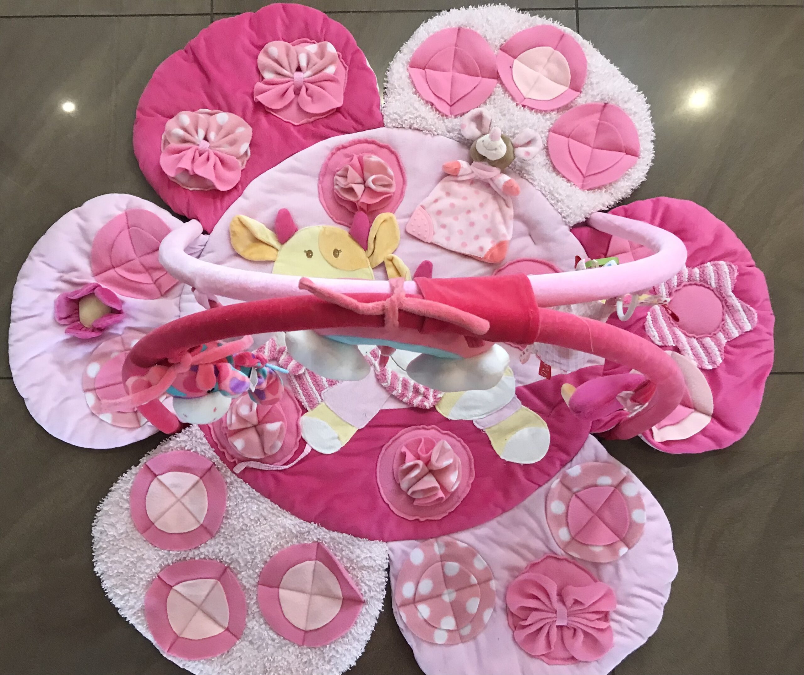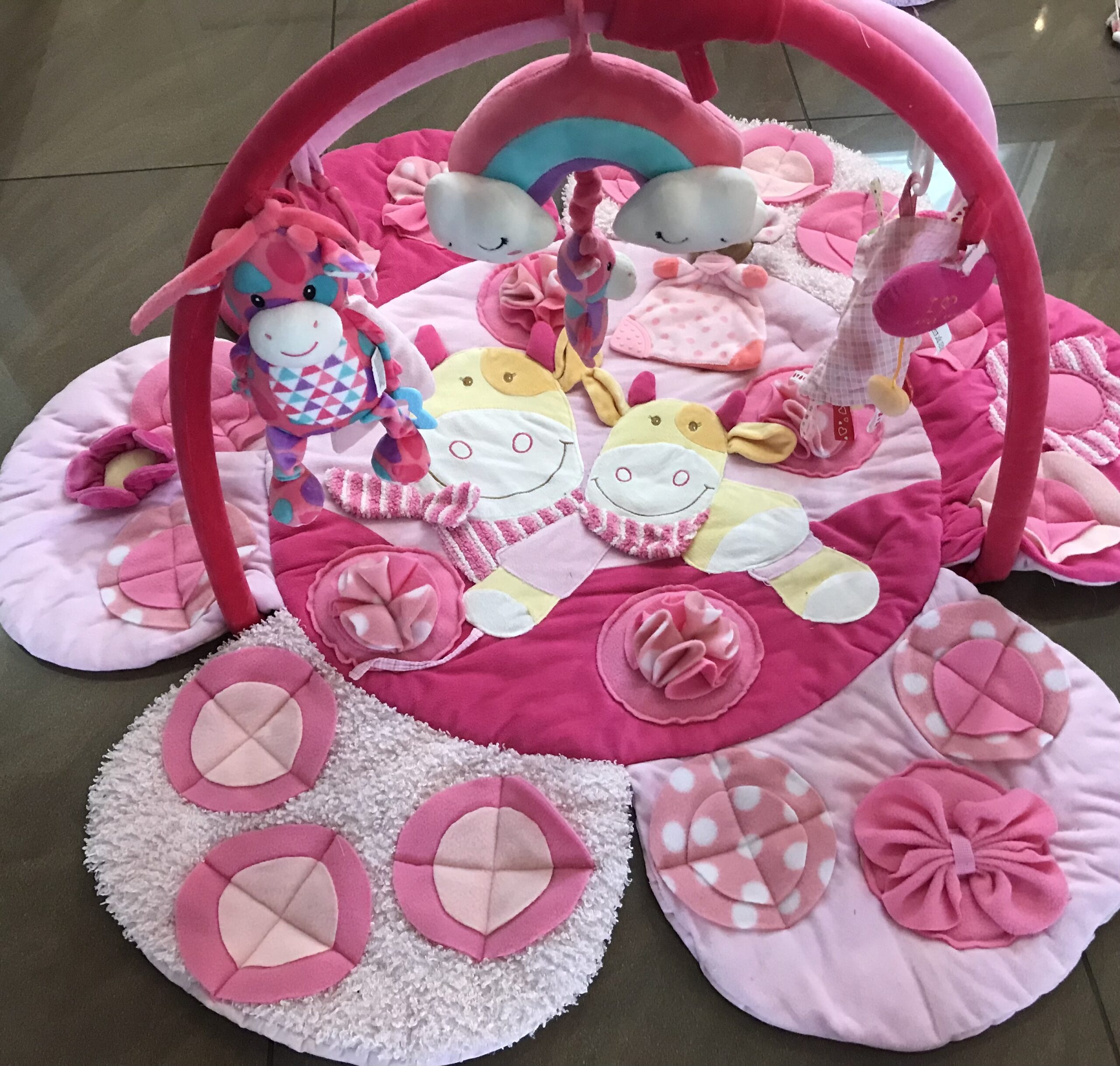 Diese Spielmatte hat noch zusätzlich zwei Rundbögen mit Spielzeugen.
