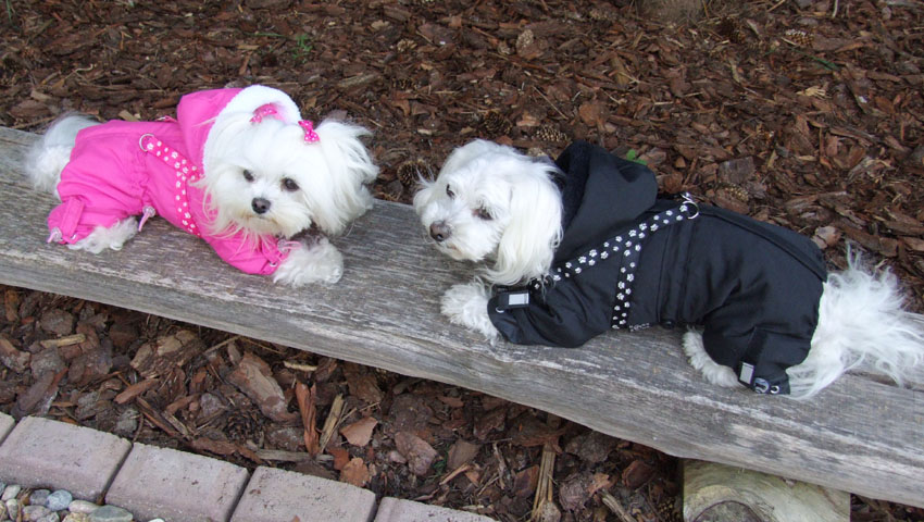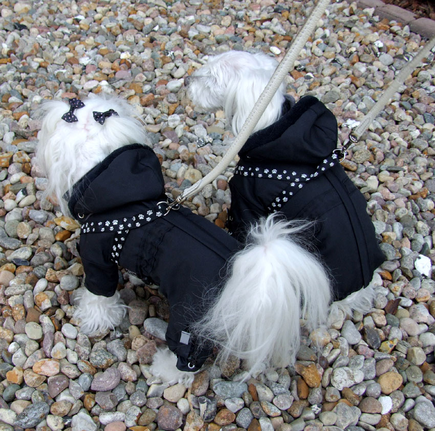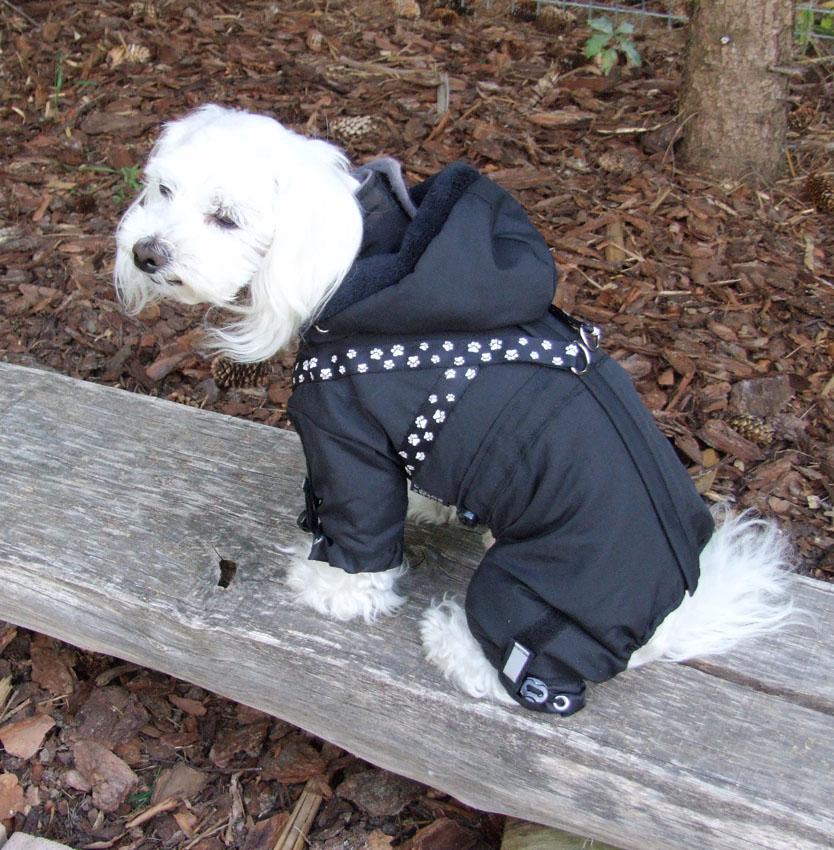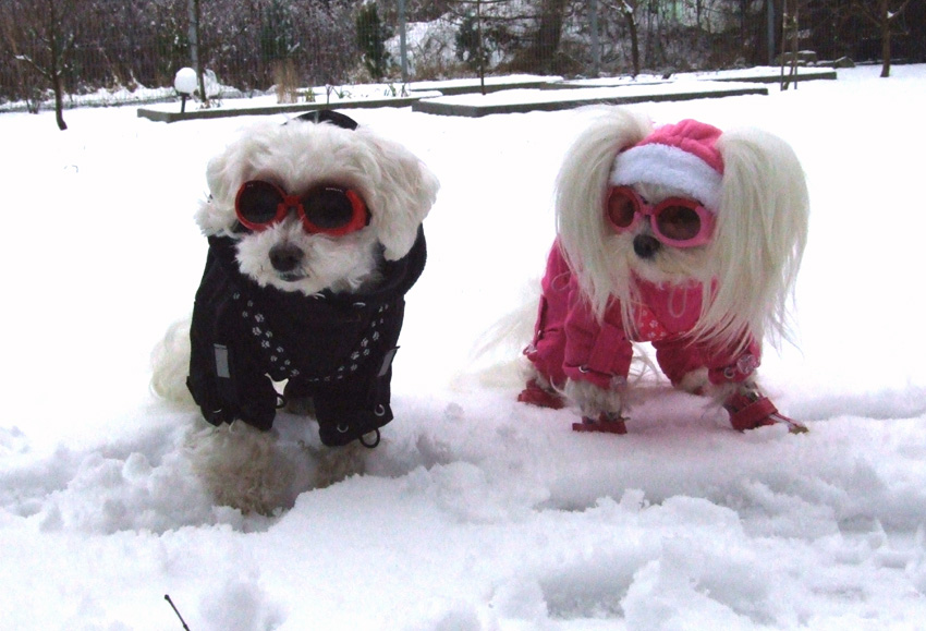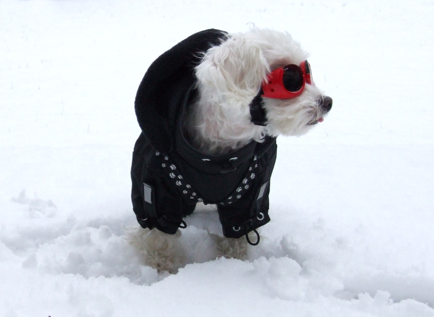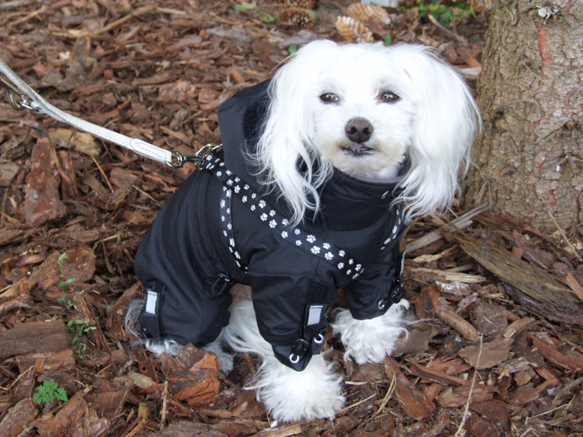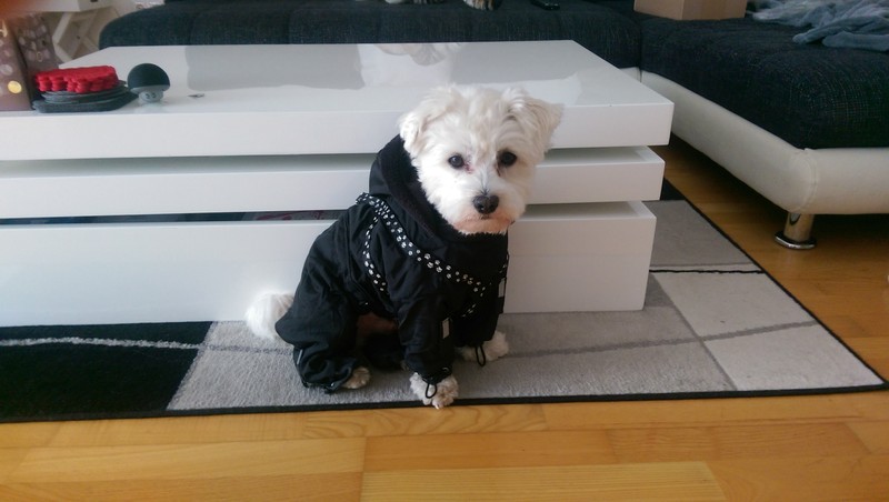 Das Mäntelchen ist super bei Schneewetter (verhindert die Schneeklumpen am Fell).