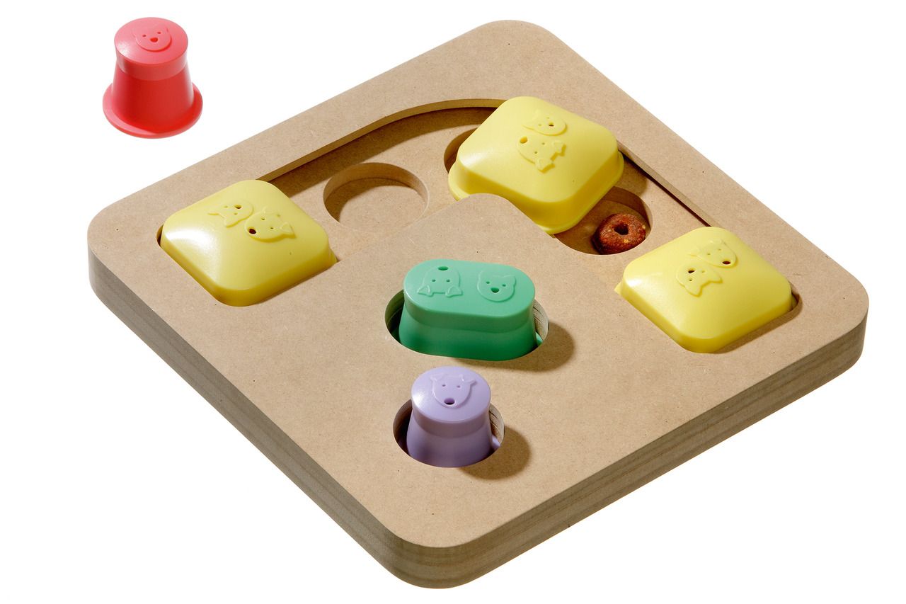 Menge Masterkarton: 12 Stück Doggy Brain Train Spielzeuge sind Motivations- und Denkspiele speziell für Hunde! Denken, spielen, lernen und belohnen Das hochwertige Brettspielzeug aus Holz mit hygienisch zu reinigenden Kunststoffhütchen und -schiebern, Duftlöchern und Anti-Rutsch-Stopper sorgt für eine sinnvolle Beschäftigung und geistige Auslastung