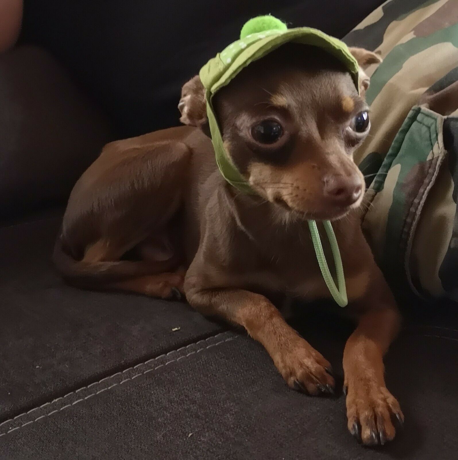 Die Mütze bedeckt nicht die Augen des Hundes.Ansonsten könnte er nicht sehen.