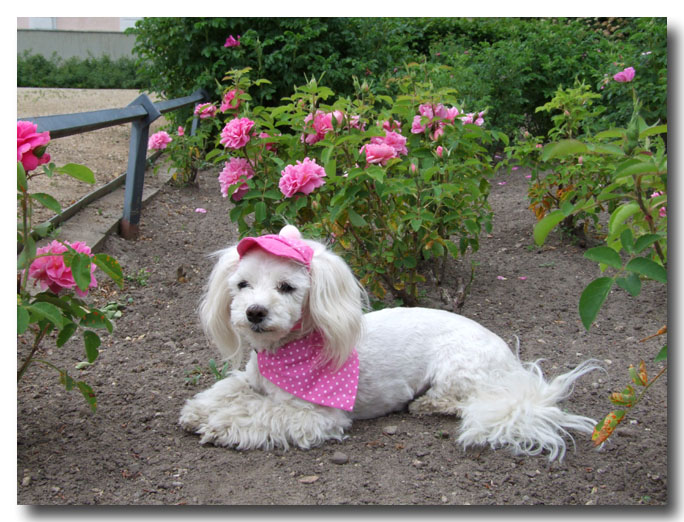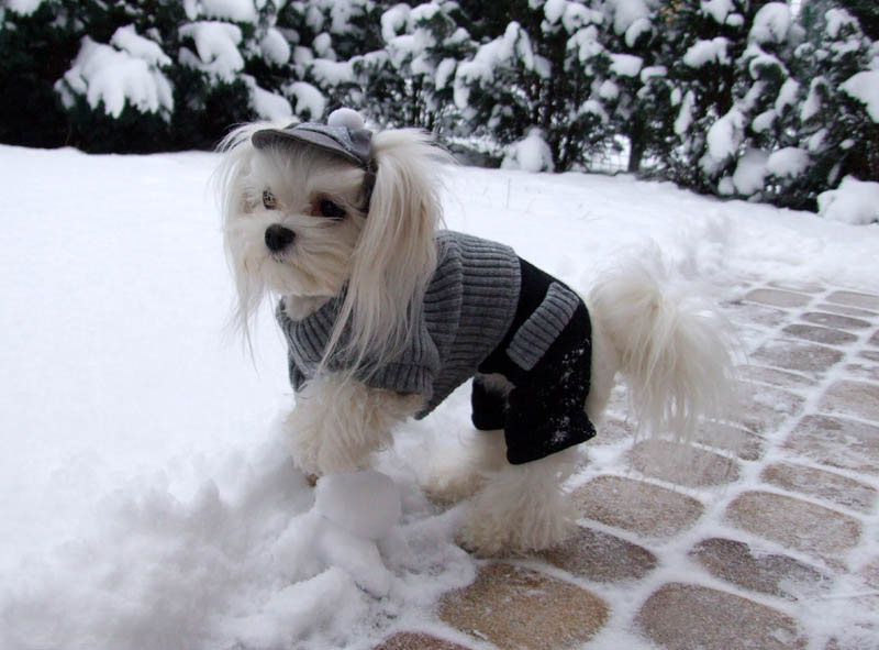Auf den Fotos sind 3 Malteser zu sehen.Bella (2 kg)und Nico (3 Kg)tragen Gr.XS.Elly(6 kg)trägt Gr.M