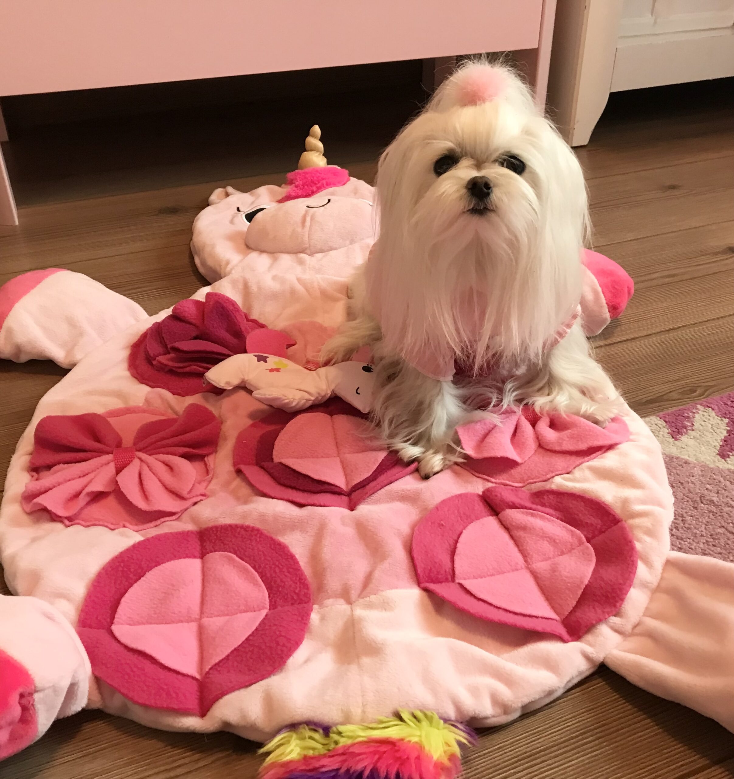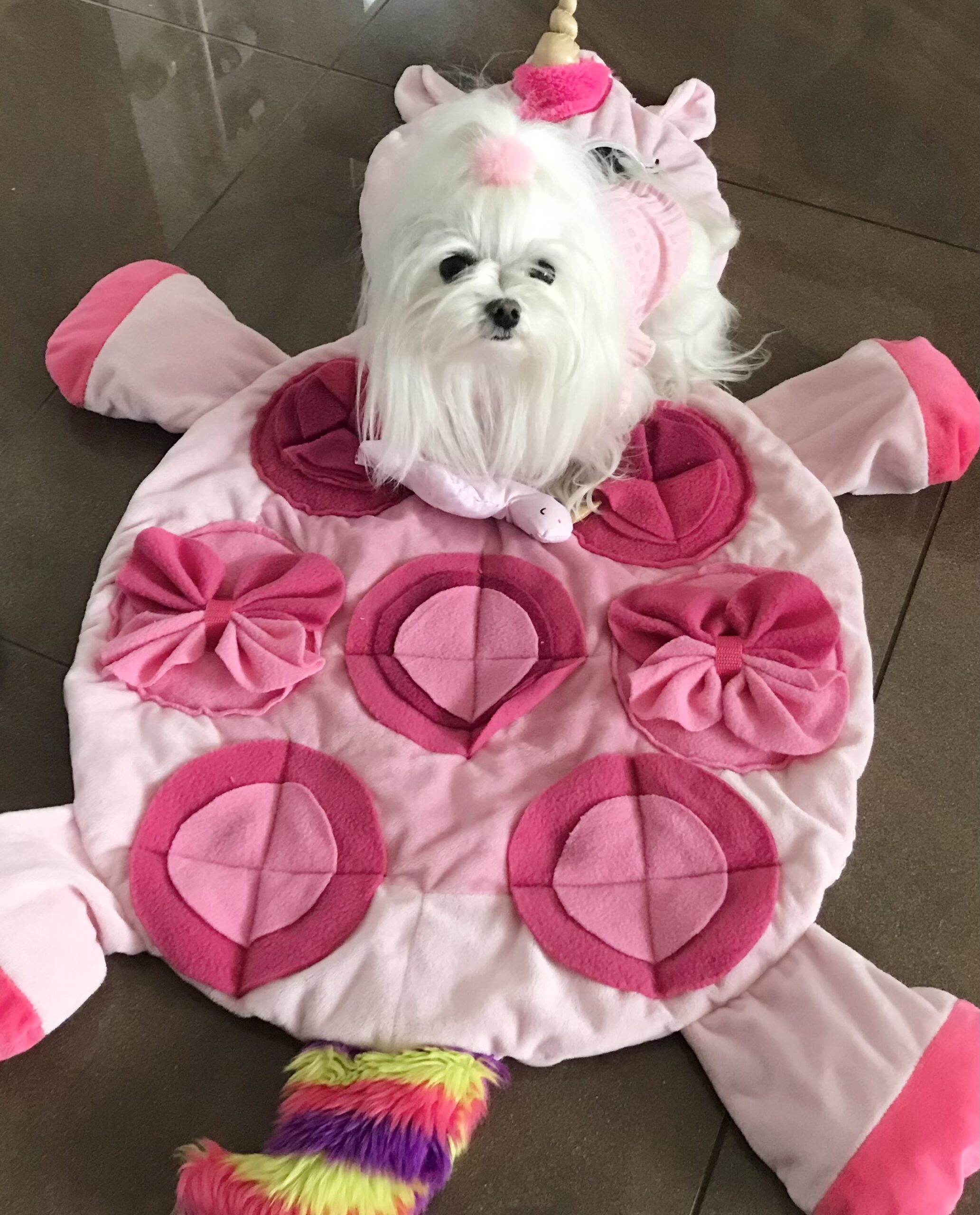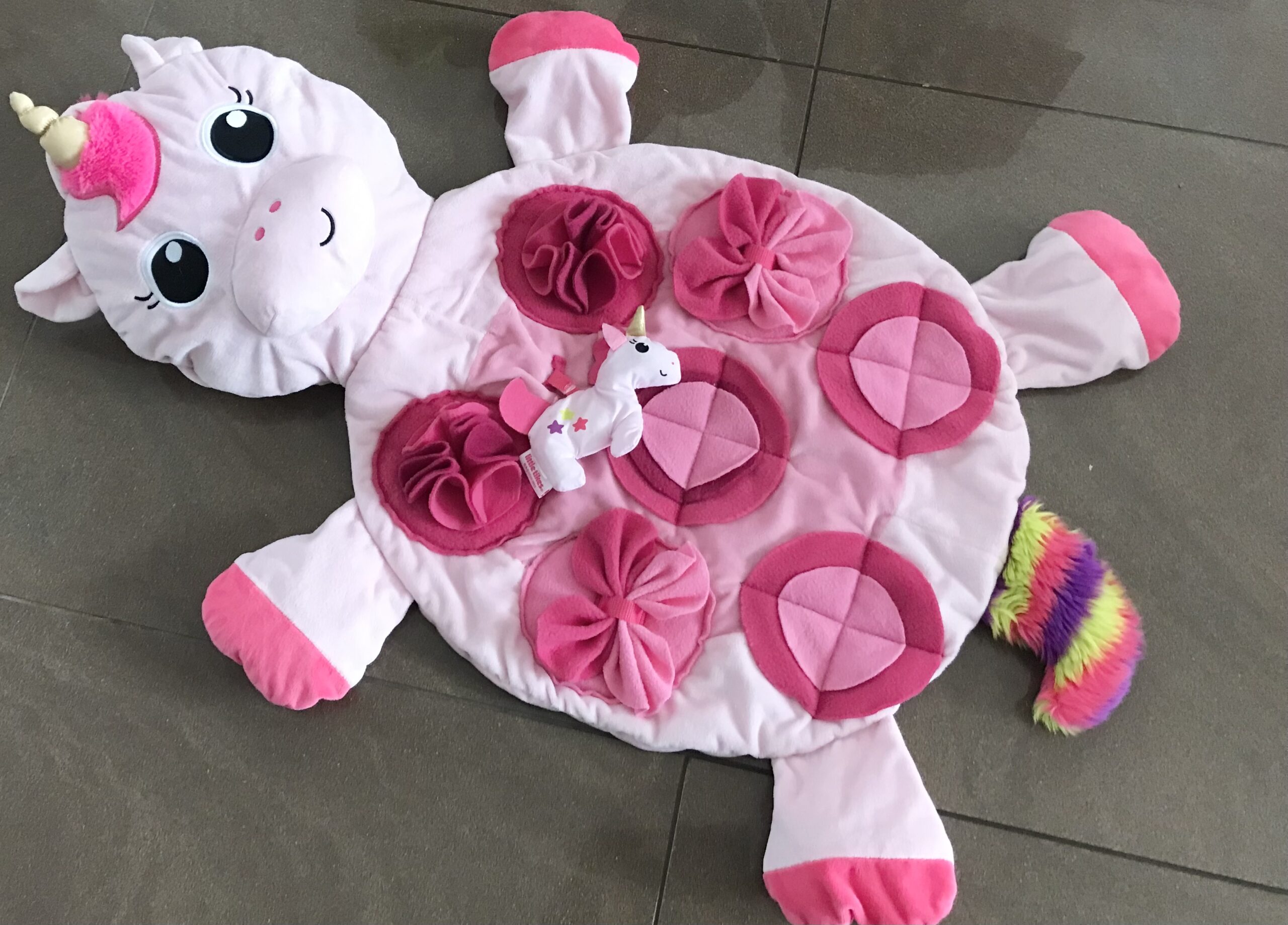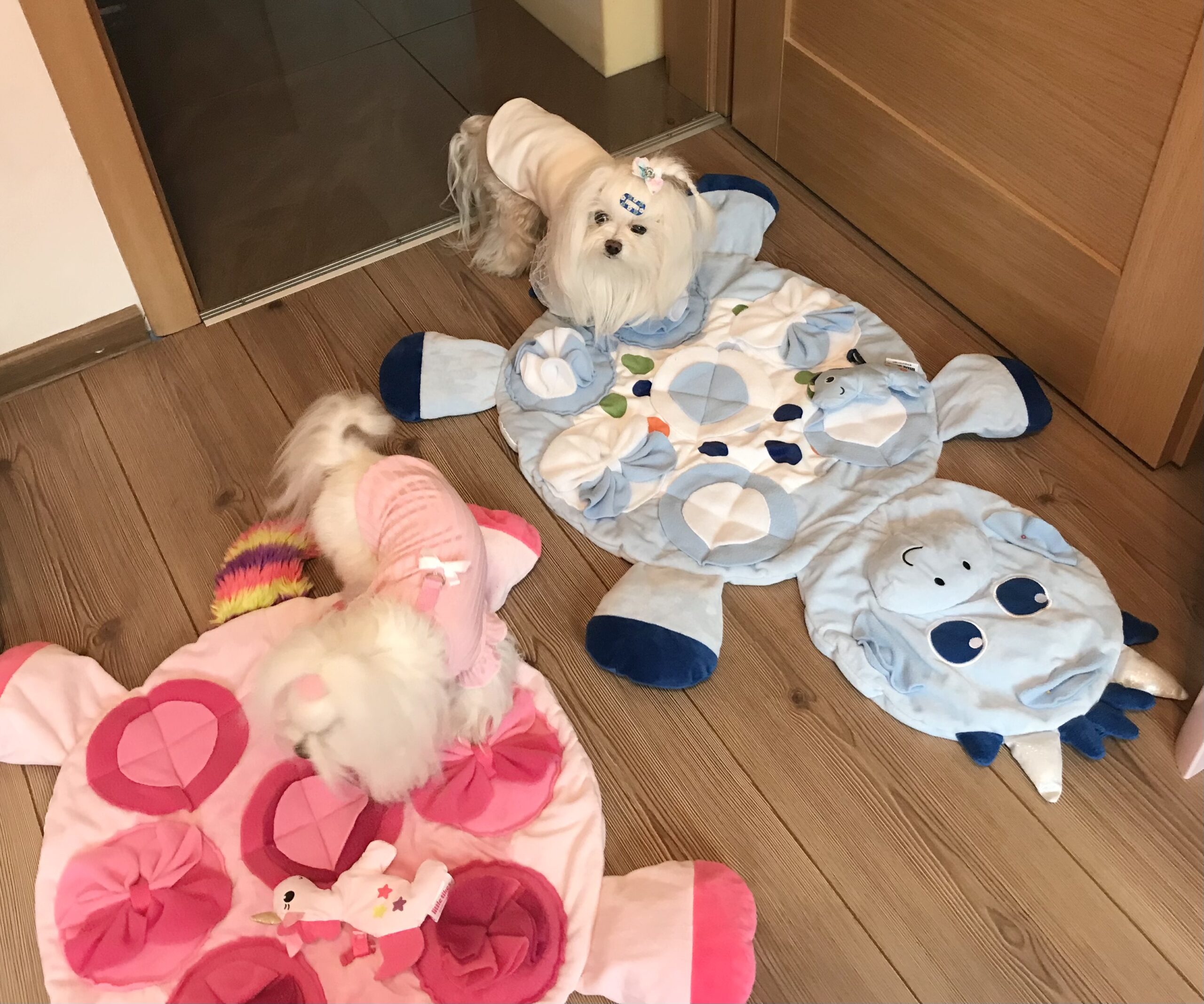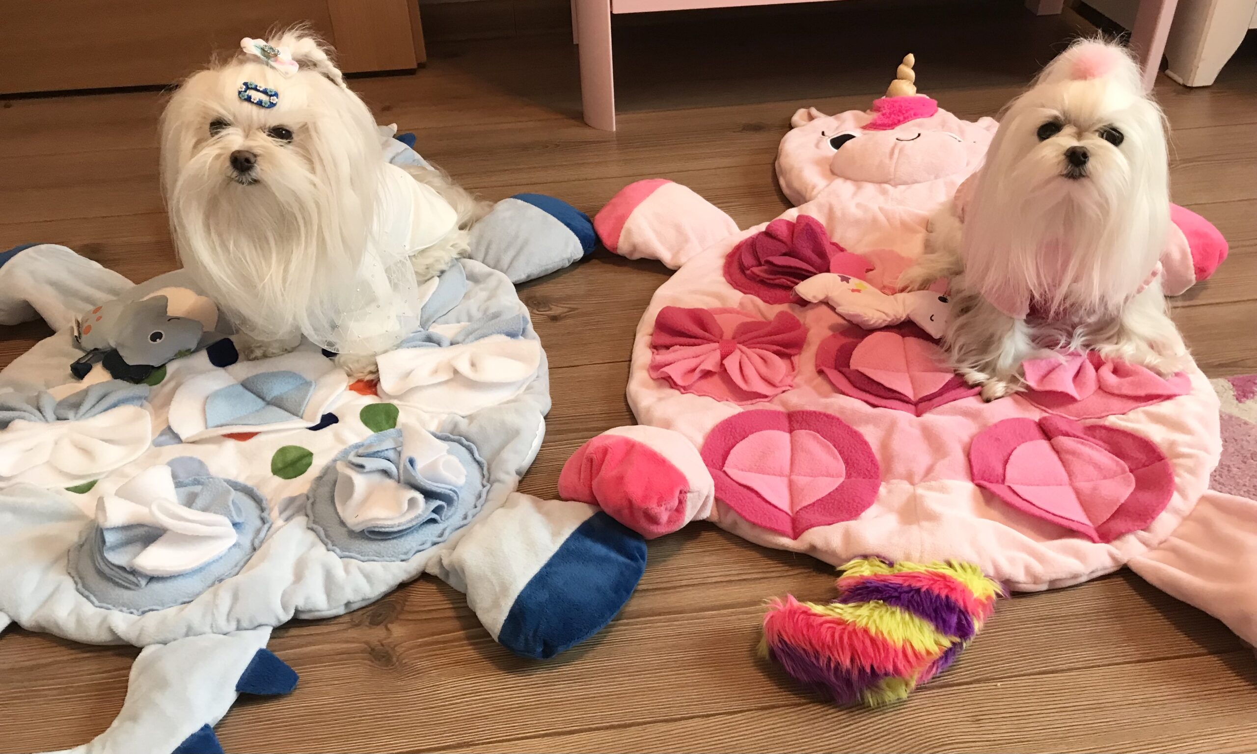 Wenn wir länger aus dem Haus gehen, befülle ich die Spielmatte mit Leckerlis – das beschäftigt die zwei eine Weile. Sie können auch Trockenfutter verstecken wenn der Hund z.B zu schnell aus der Schüssel frisst, wenn er sich mehr bewegen muss weil es zugenommen hat oder aber auch wenn er ein schlechter Esser ist wie meine Hunde – manchmal hilft das auch sehr gut.