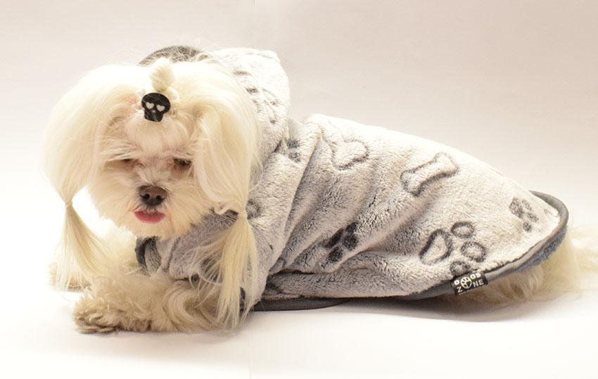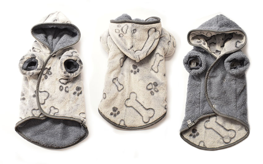 Bitte bedenken Sie: Der Bademantel sollte etwas größer und länger sein als die normale Hundekleidung.