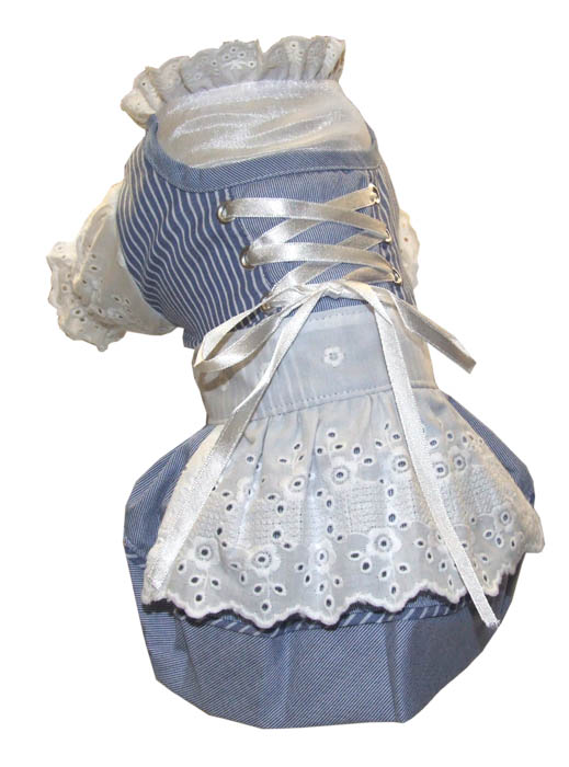 Das Kleid wird unter dem Bauch mit Klettverschluss zugemacht.Es ist ganz einfach.Den Rücken verziert noch eine süße Schleife.