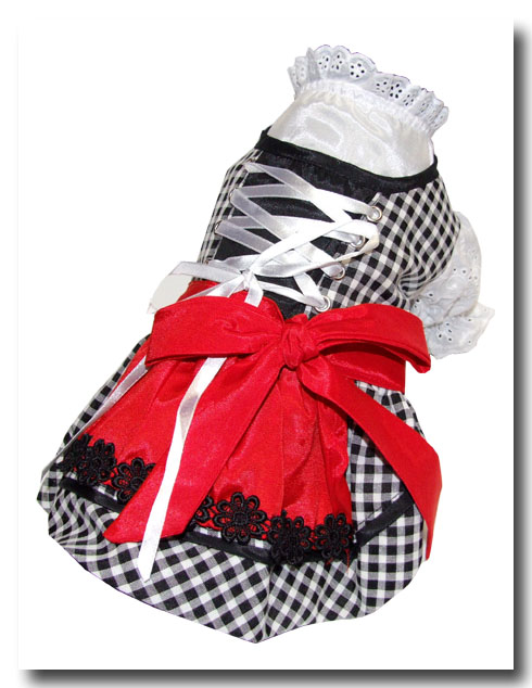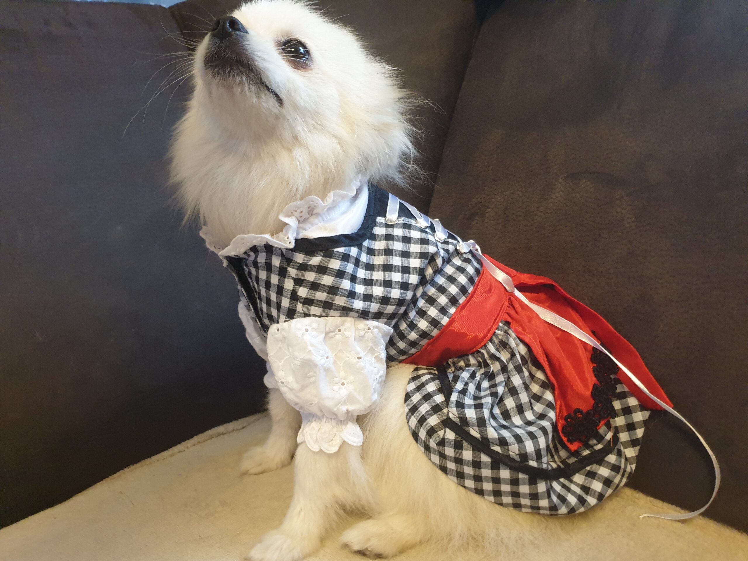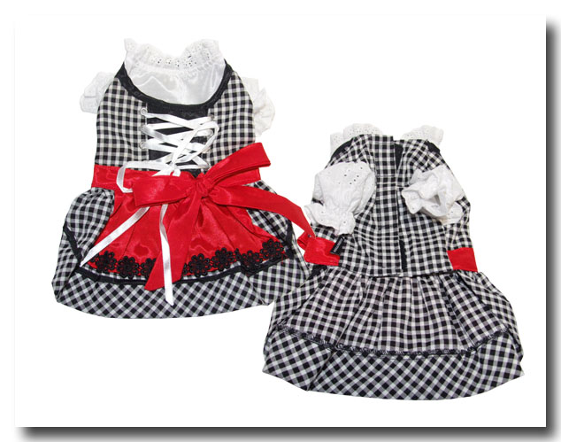 Tolles rot-kariertes Kleid in Dirndl-Optik, mit den weiß gekreutzten Bändern und der weißen Schürze ist Ihr Hund perfekt gekleidet für’s Oktoberfest