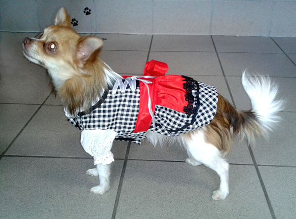 Das Kleid wird unter dem Bauch mit Klettverschluss zugemacht.Es ist ganz einfach.Den Rücken verziert noch eine süße Schleife.