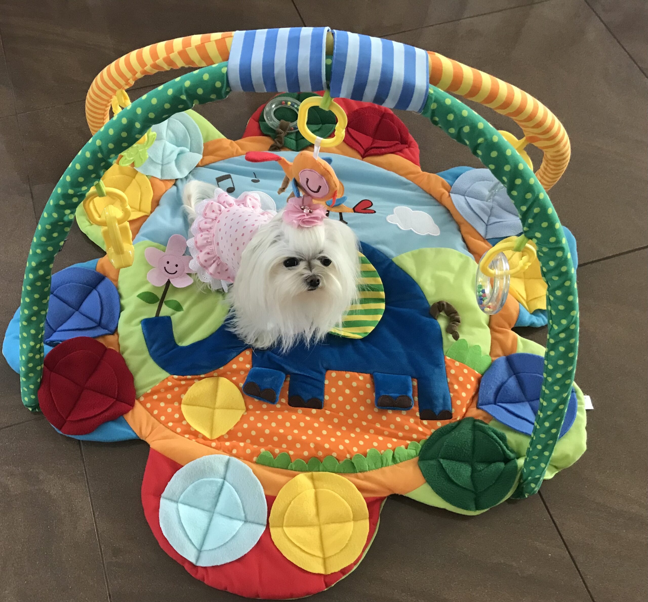 Diese Spielmatte hat noch zusätzlich zwei Rundbögen mit Spielzeugen.