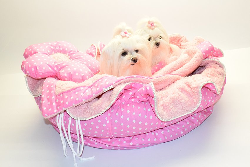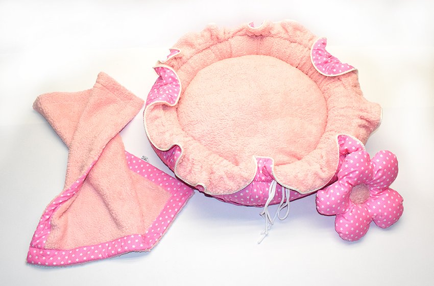 Sie bekommen das hübsche Bett inklusive passendem gratis Kissen in Form einer Blume und eine passende doppelseitige Hundedecke zum kuscheln.