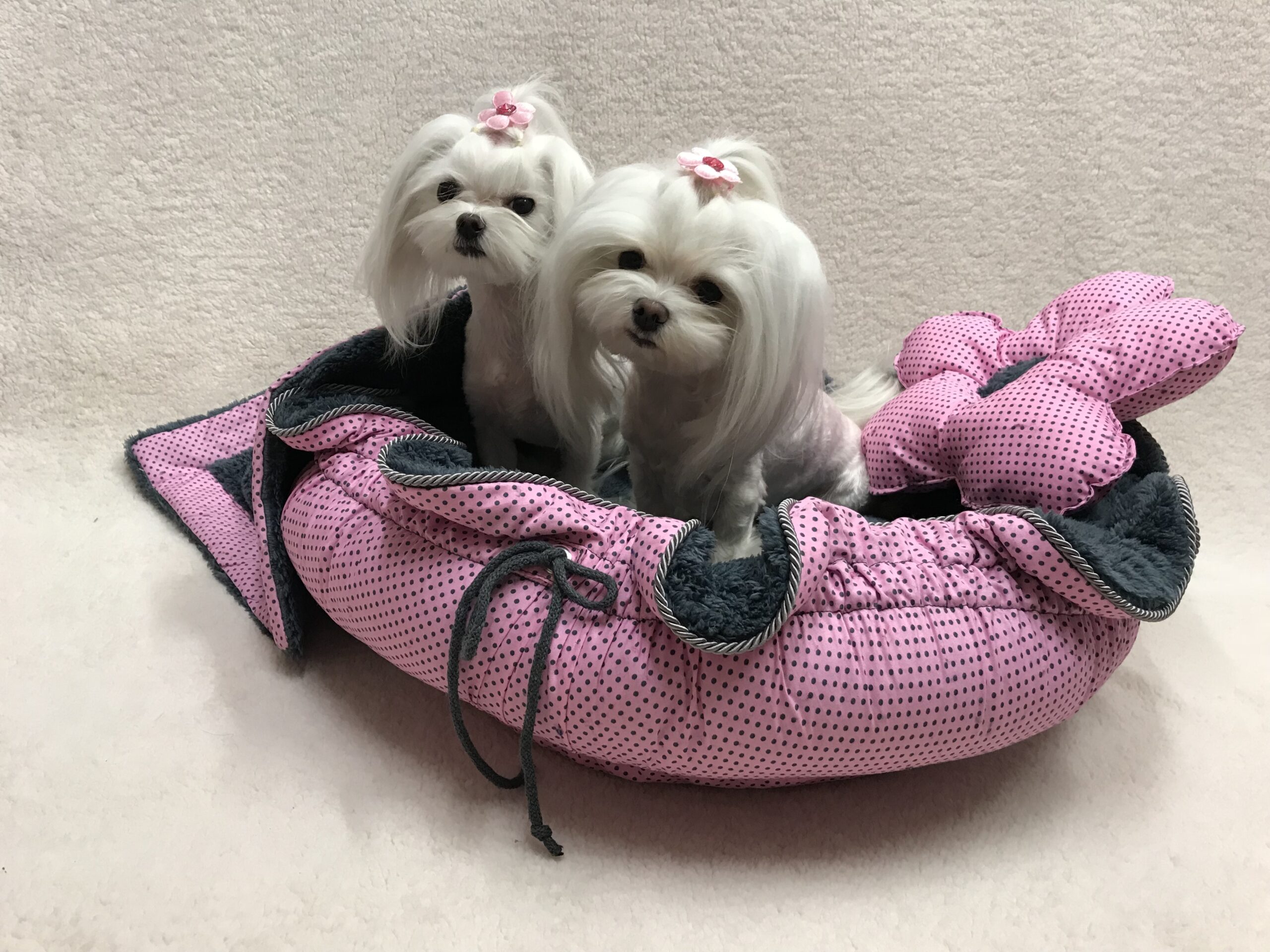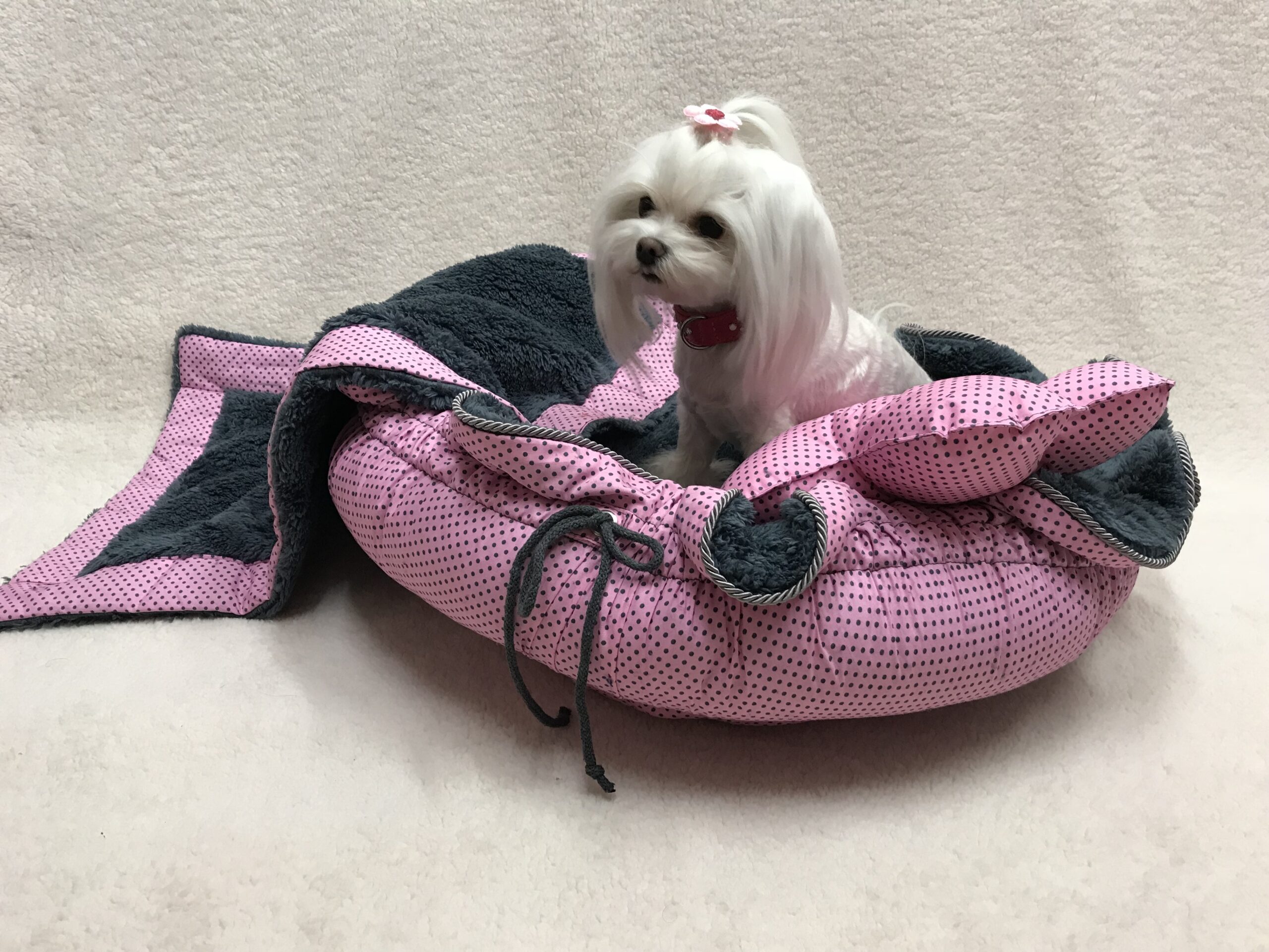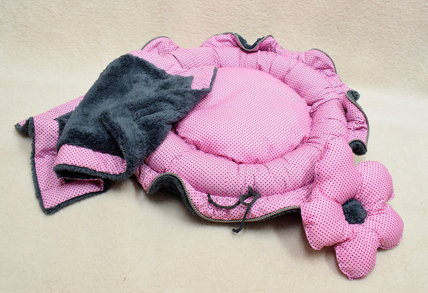 Sie bekommen das hübsche Bett inklusive passendem gratis Kissen in Form einer Blume und eine passende doppelseitige Hundedecke zum kuscheln.