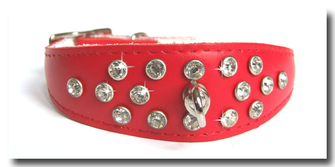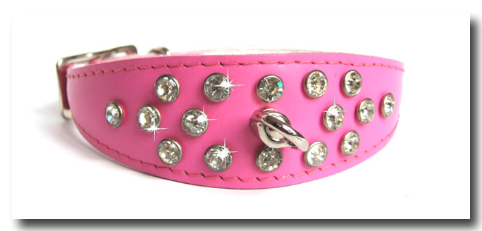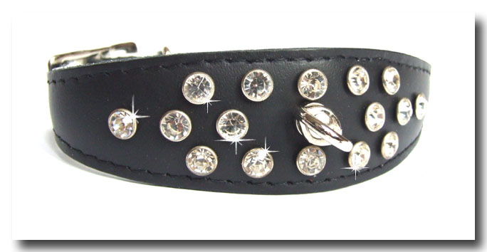 Das Lederhalsband ist mit süßen Steinchen verzeiert.