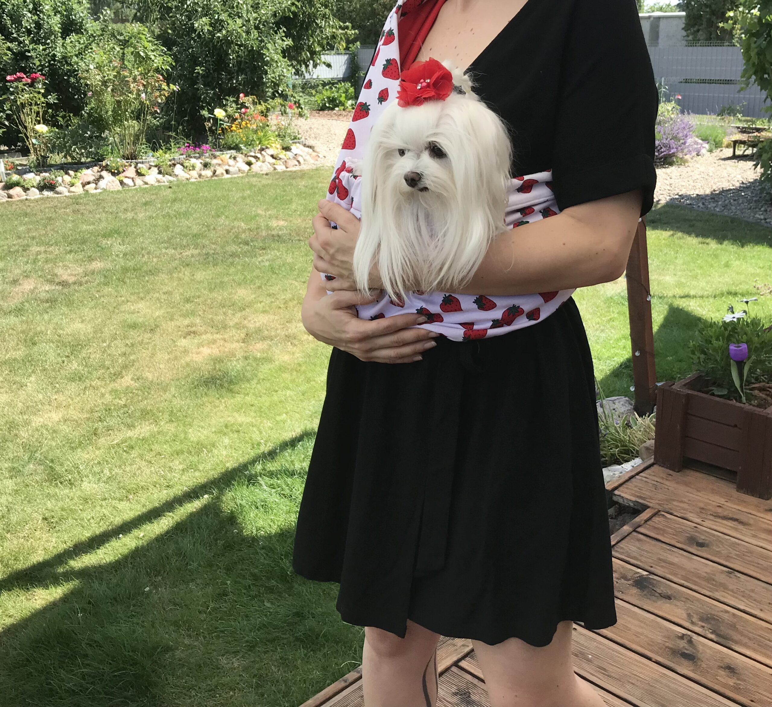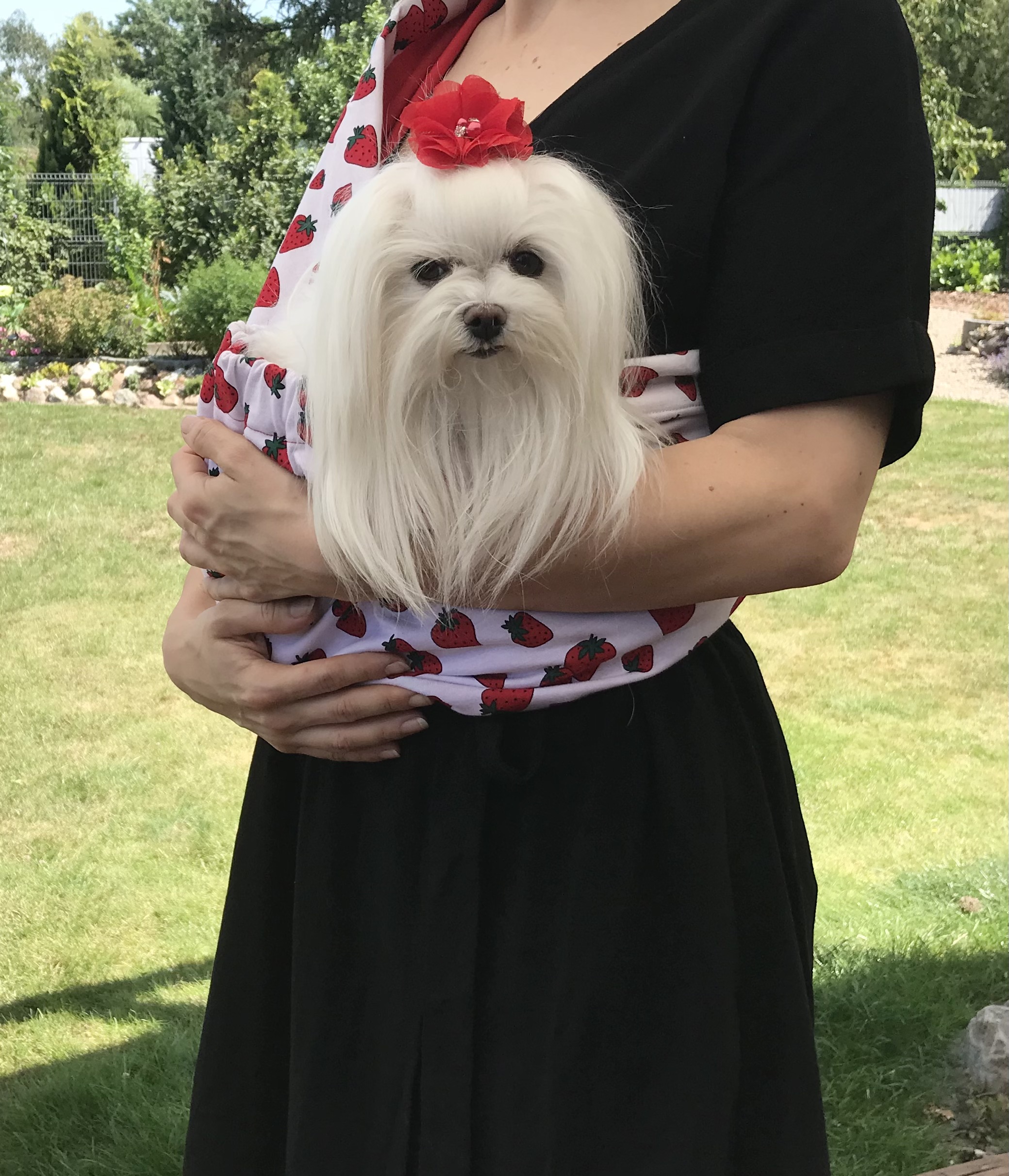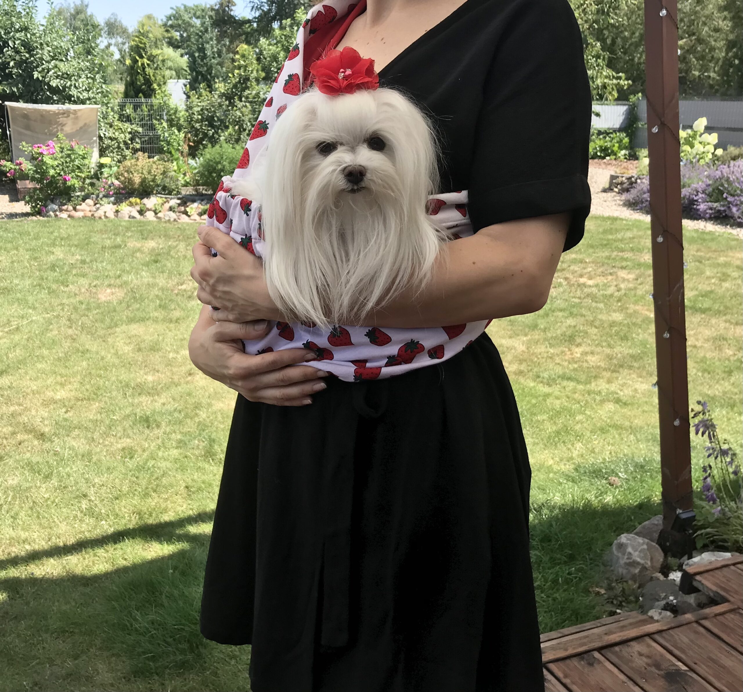 Das Tragetuch ist für kleine Hunde, Welpen oder Katzen (bis ca.5 kg) geeignet. Unsere Tücher sind aus einem Stoff aus Baumwollmischung genäht. Unsere Hunde lieben es getragen zu werden. Außerdem sind sie dort sicher und können entspannen. Besonders gut für den Urlaub geeignet. Lange Spaziergänge sind dann ohne Weiteres möglich.