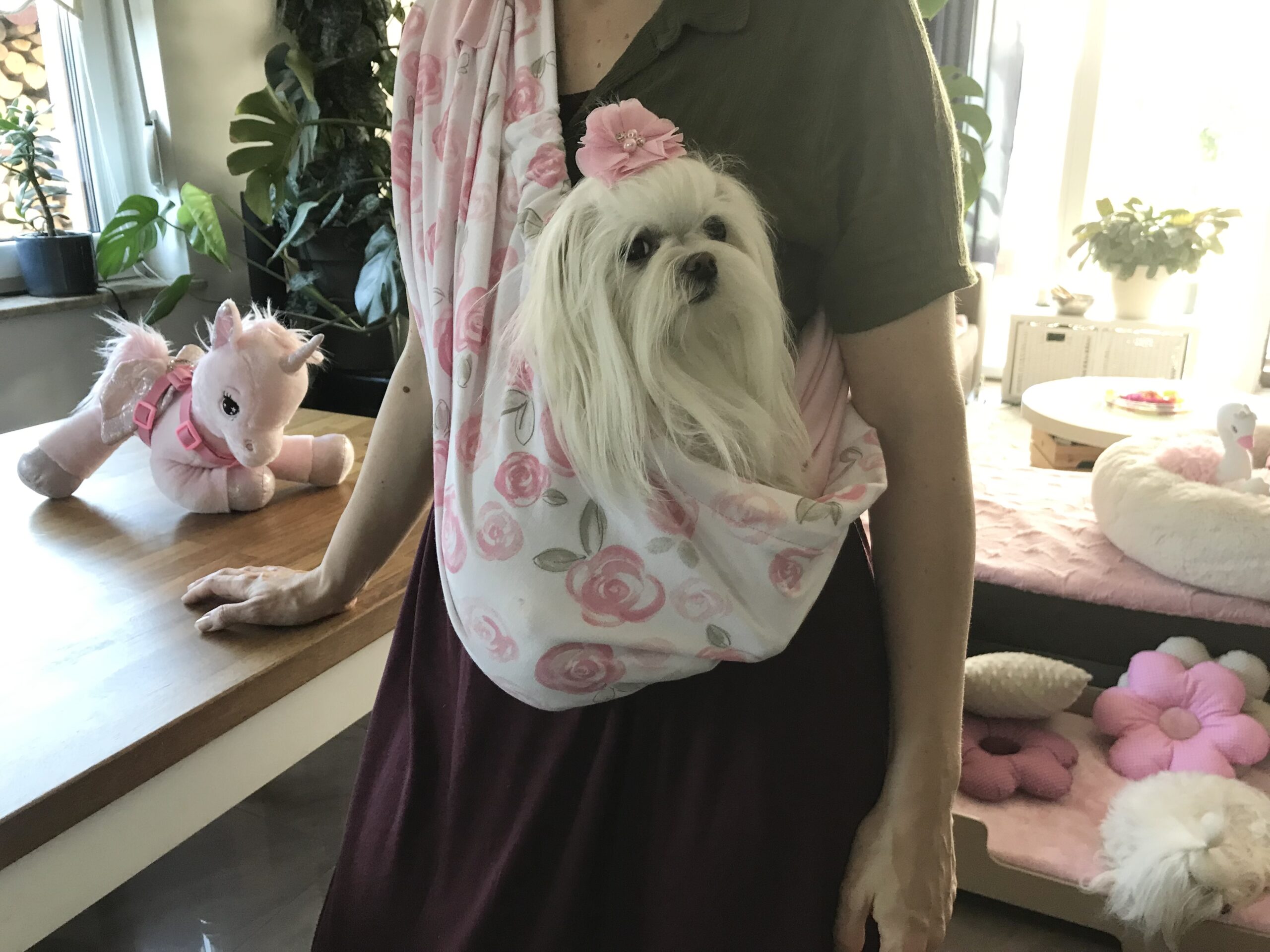 Das Tragetuch ist für kleine Hunde, Welpen oder Katzen (bis ca.5 kg) geeignet. Unsere Tücher sind aus einem Stoff aus Baumwollmischung genäht. Unsere Hunde lieben es getragen zu werden. Außerdem sind sie dort sicher und können entspannen. Besonders gut für den Urlaub geeignet. Lange Spaziergänge sind dann ohne Weiteres möglich.