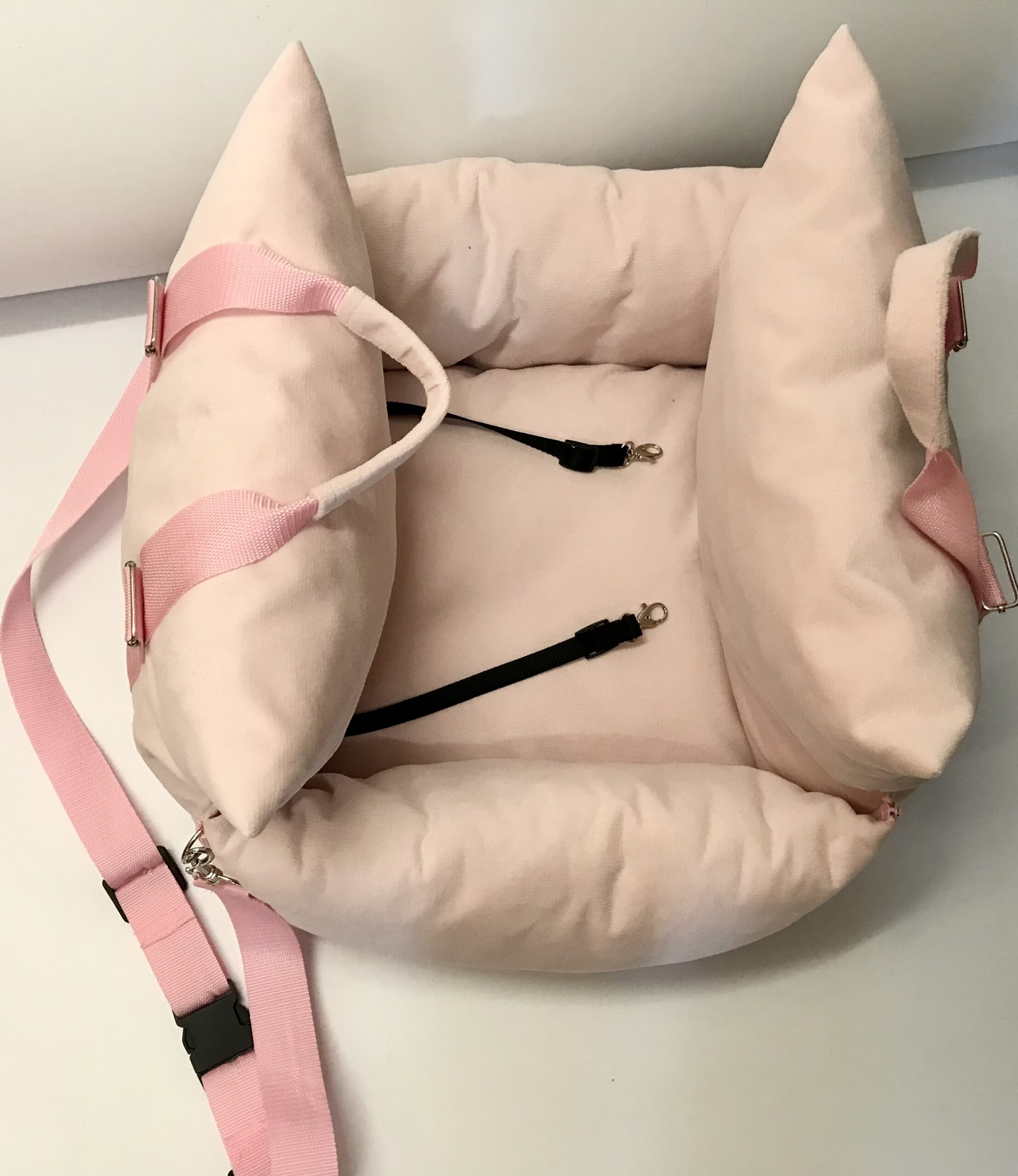 Der hintere Riemen des Körbchens wird um die Rückenlehne gelegt. Die Länge des Gurtes ist verstellbar. Bitte stramm einstellen. Bitte befestigen Sie Ihren Hund an einem Hundegeschirr (NIEMALS AM HALSBAND) . Im Inneren befinden sich zwei längenverstellbare Kurzleinen. Diese sind dafür gedacht, den Hund oder Hunde im Körbchen zu fixieren. Sie sollten aber nicht alleine als Sicherung des Hundes während der Fahrt dienen!