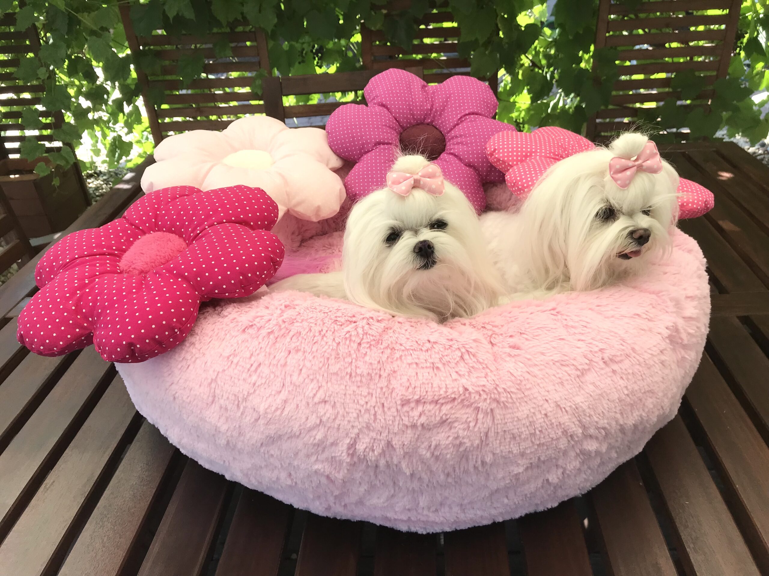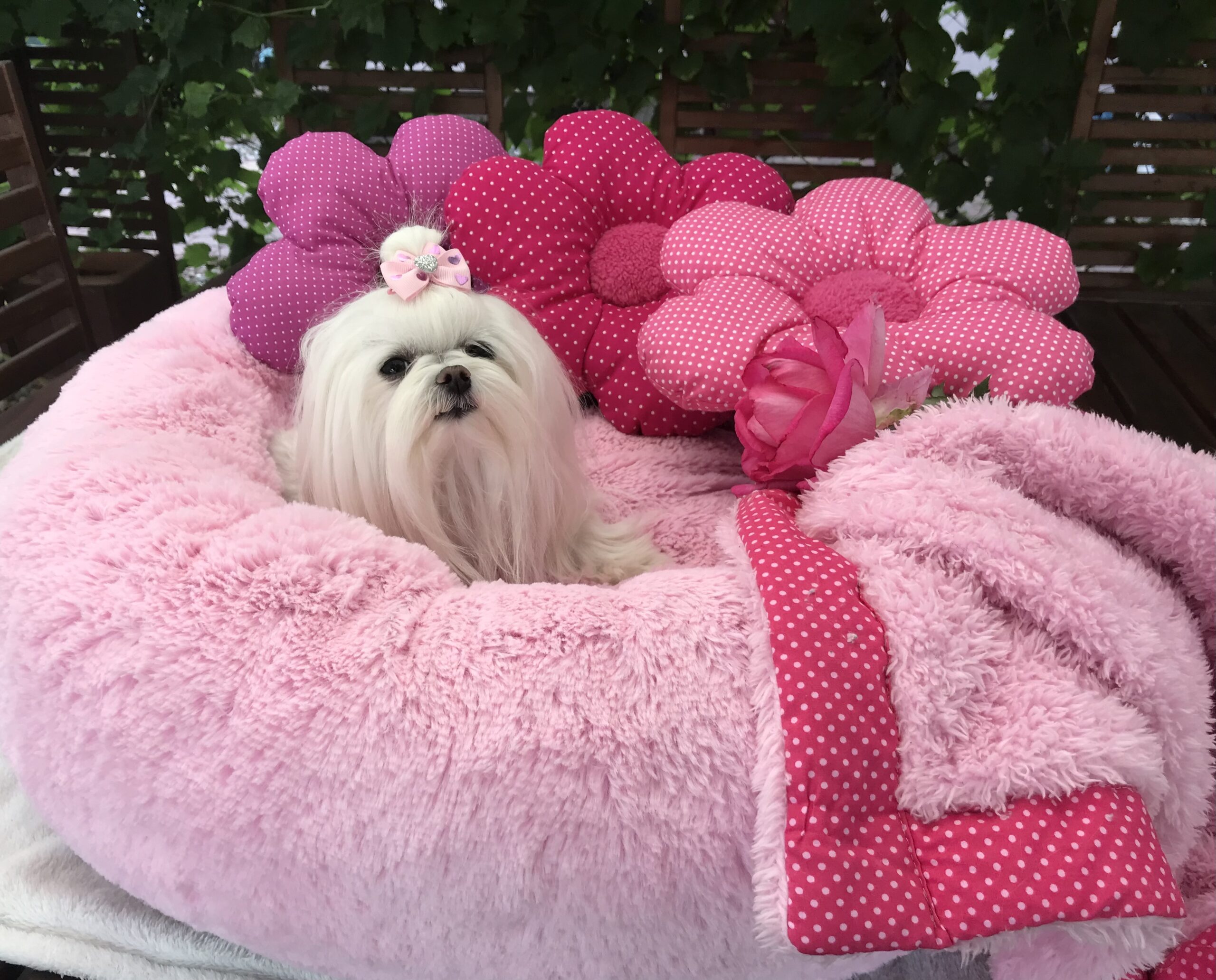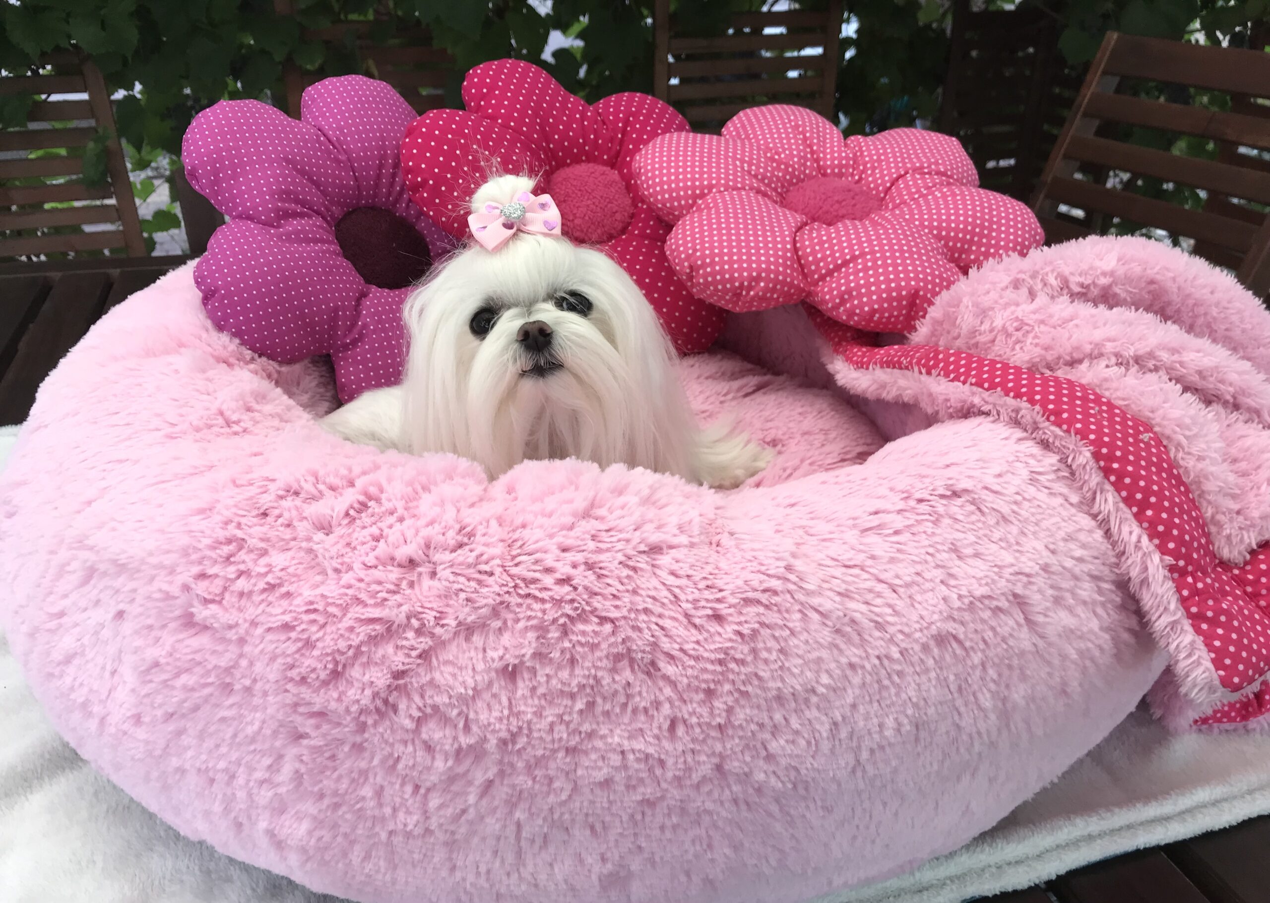 Ein kleines Kissen im Form von Knochen oder Blume schmückt das Bett zusätzlich.