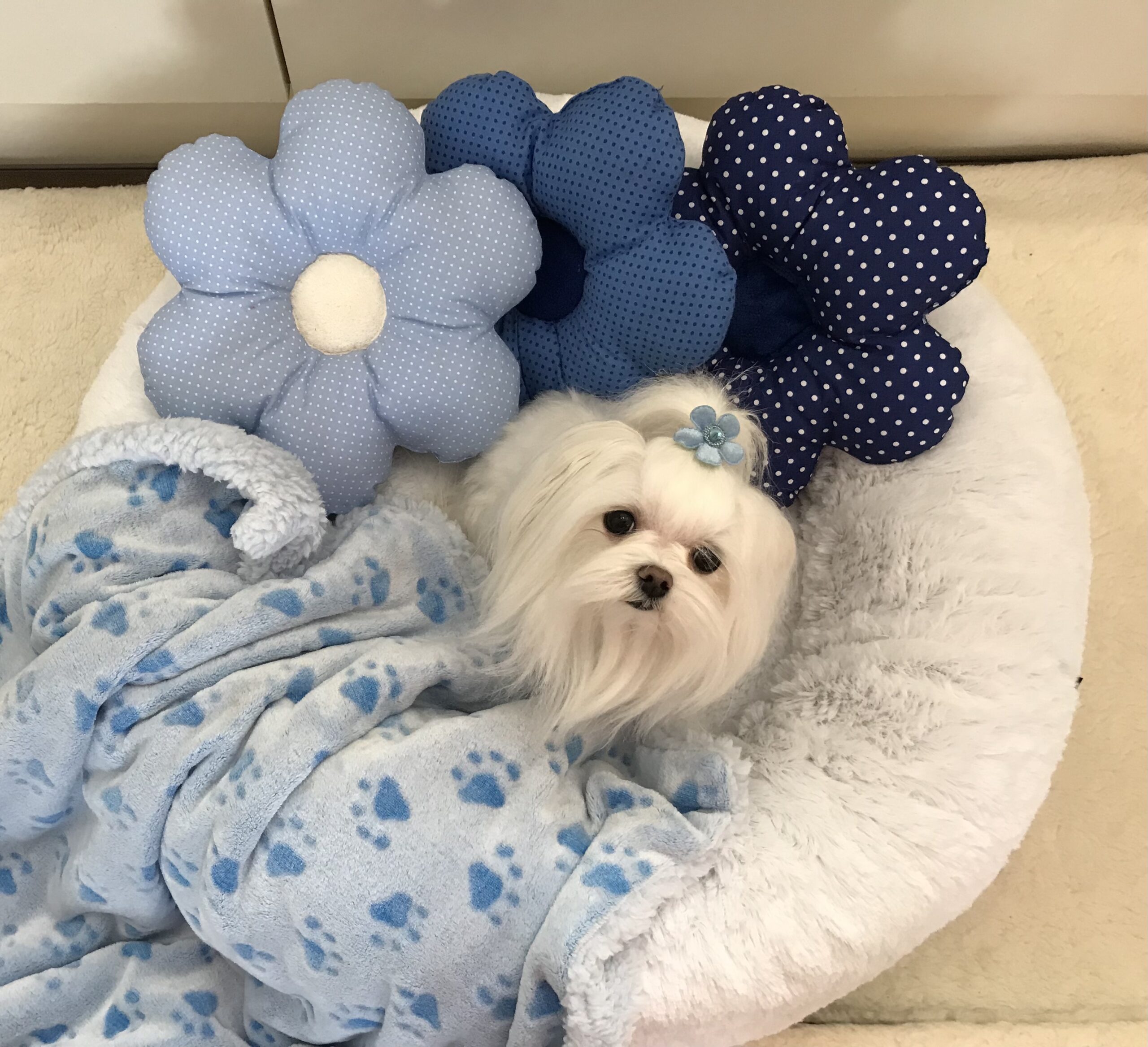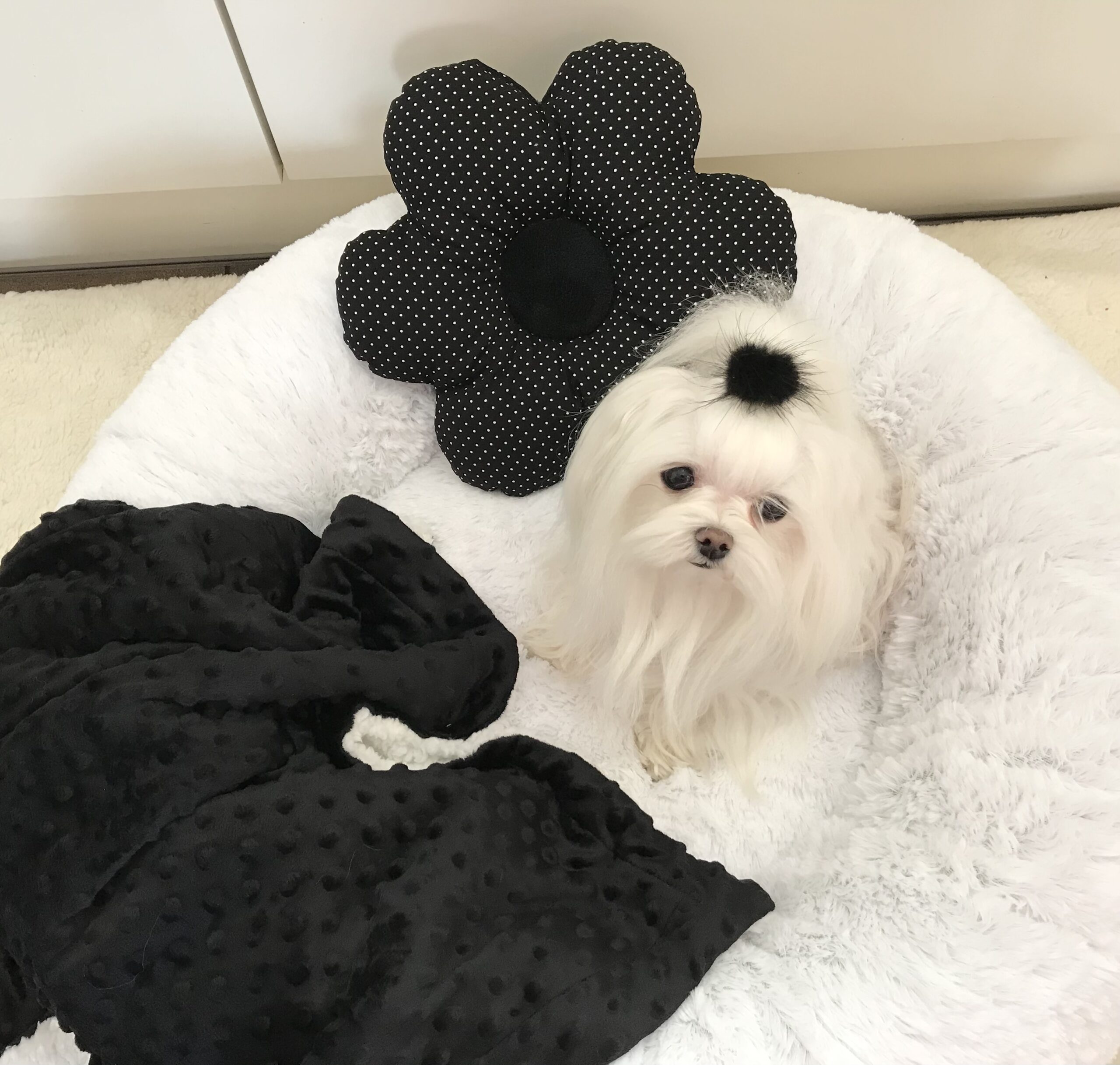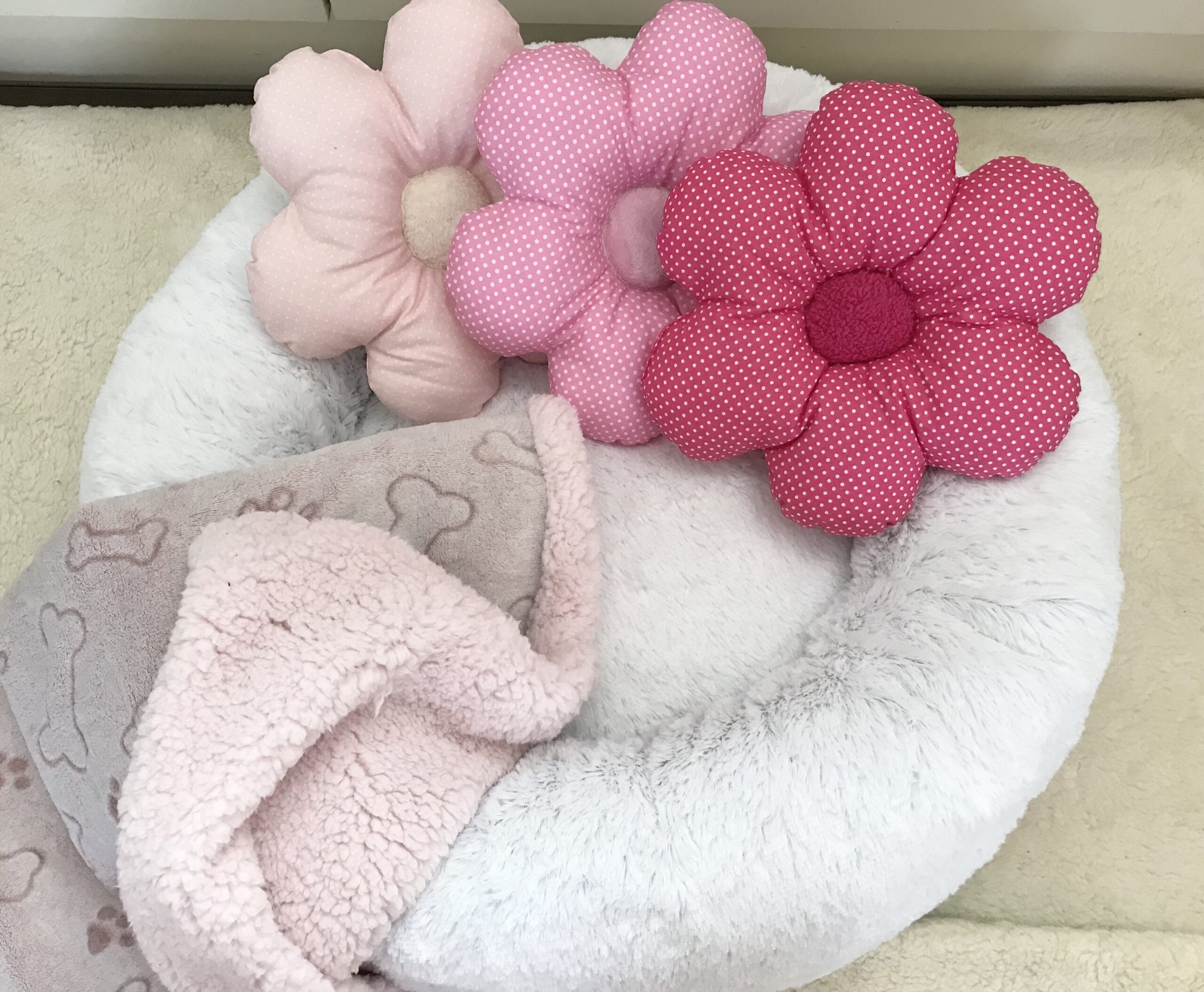 Ein kleines Kissen im Form von Knochen oder Blume schmückt das Bett zusätzlich.