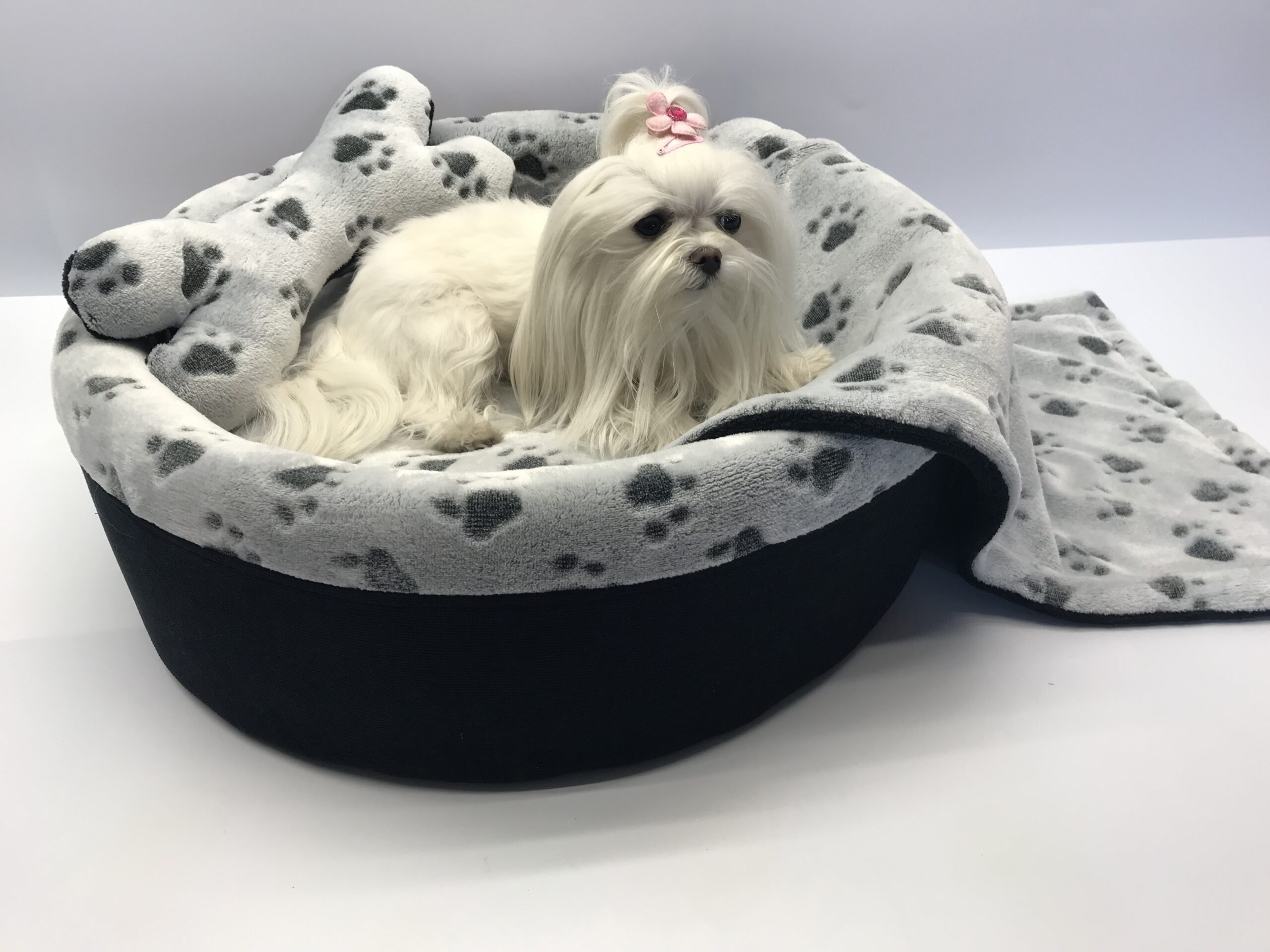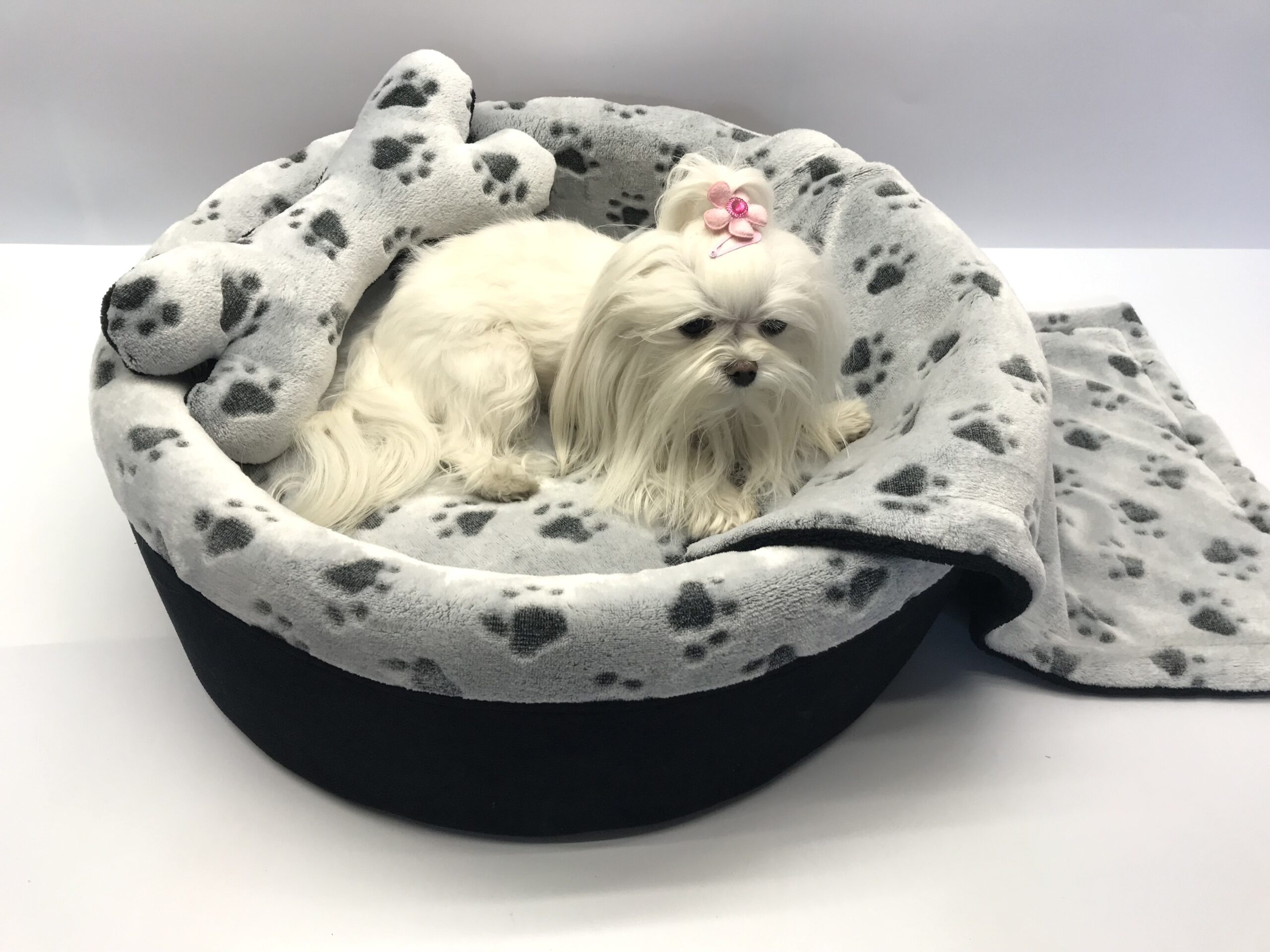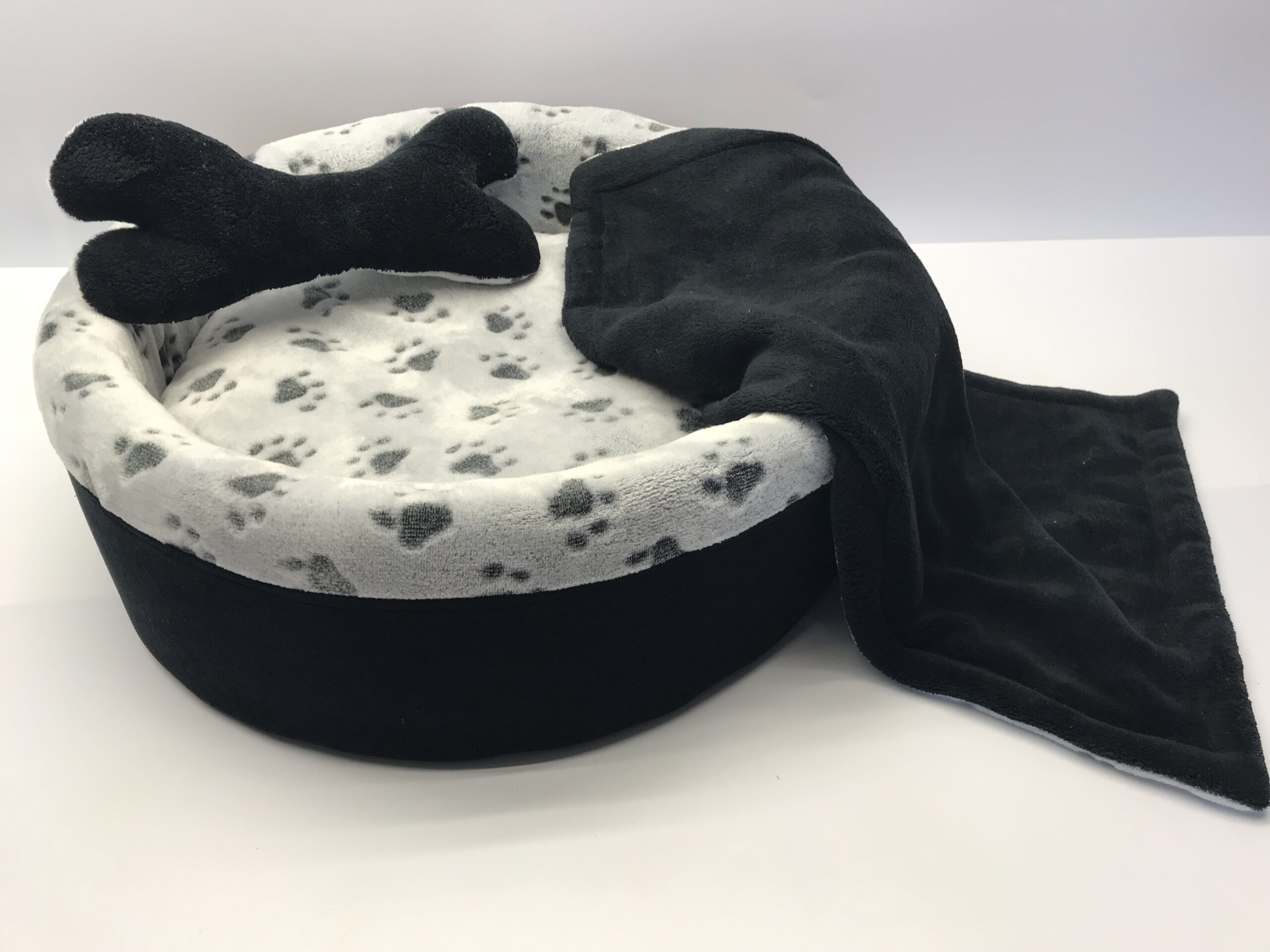 Sie bekommen das hübsche Bett inklusive passendem gratis Kissen in Form eines Knochen und eine passende doppelseitige Hundedecke zum kuscheln.