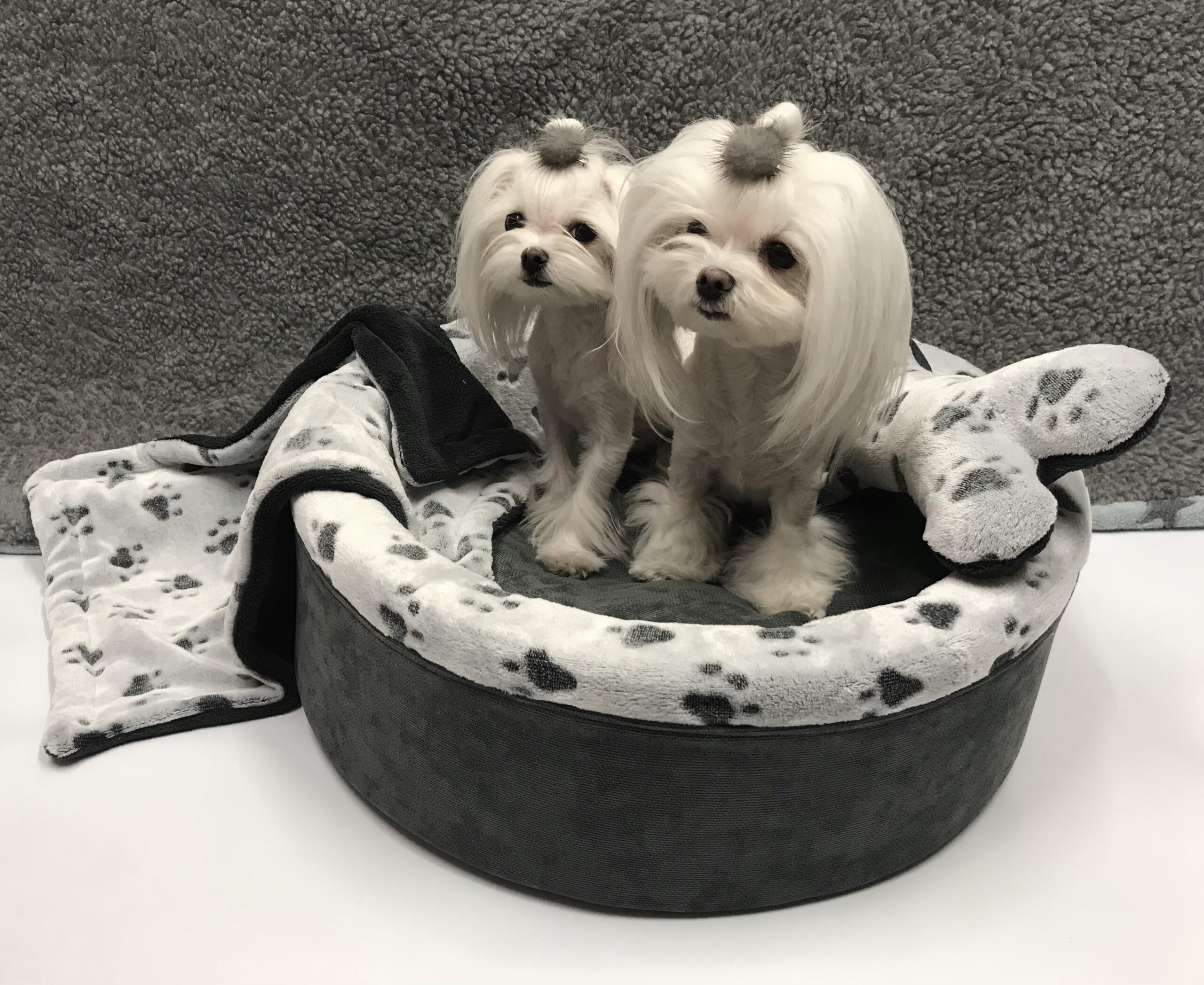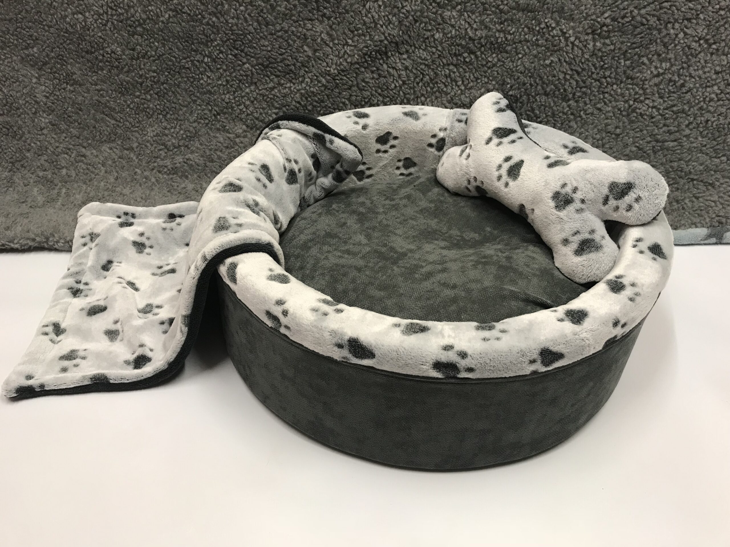 Sie bekommen das hübsche Bett inklusive passendem gratis Kissen in Form eines Knochen und eine passende doppelseitige Hundedecke zum kuscheln.