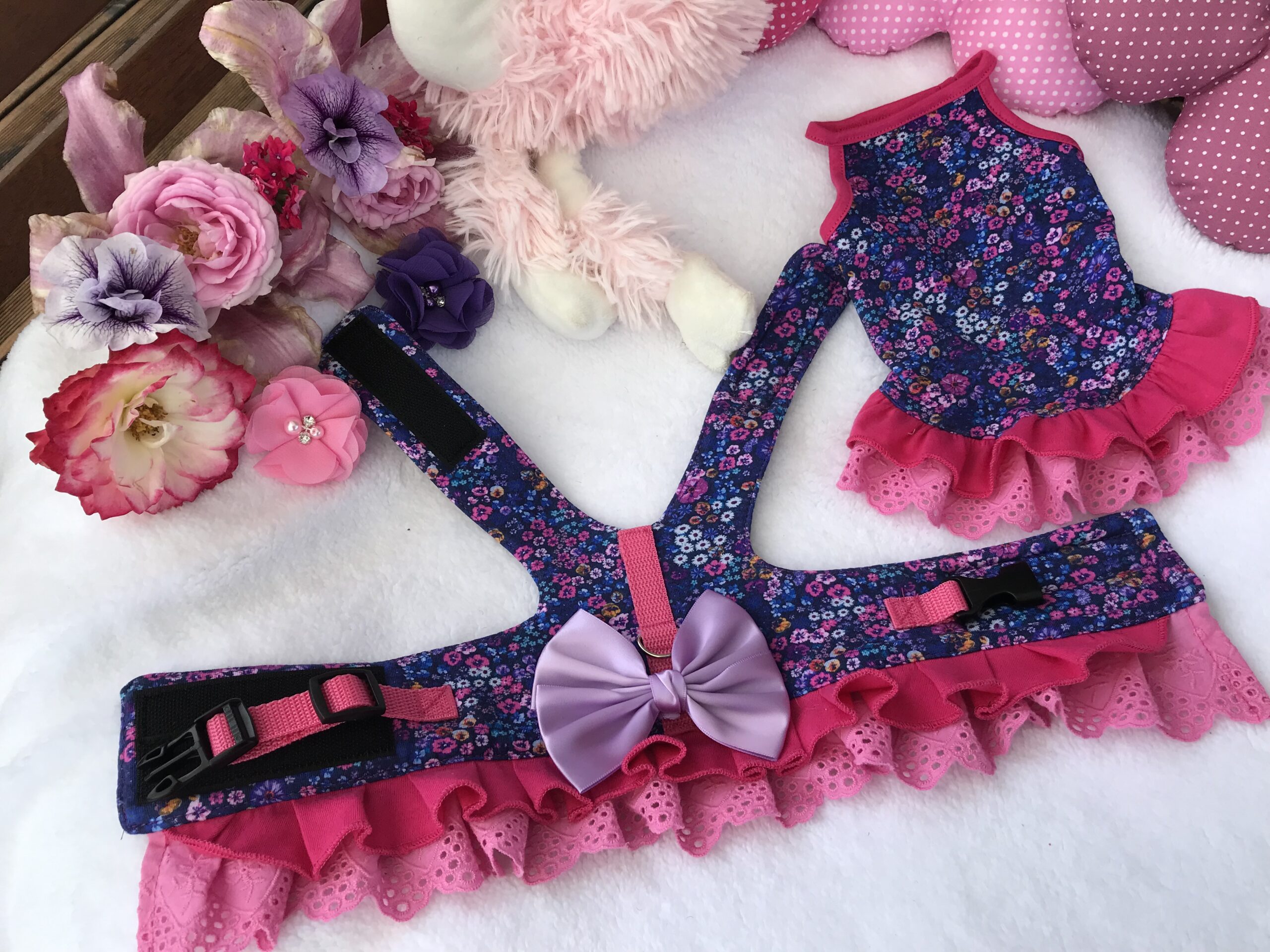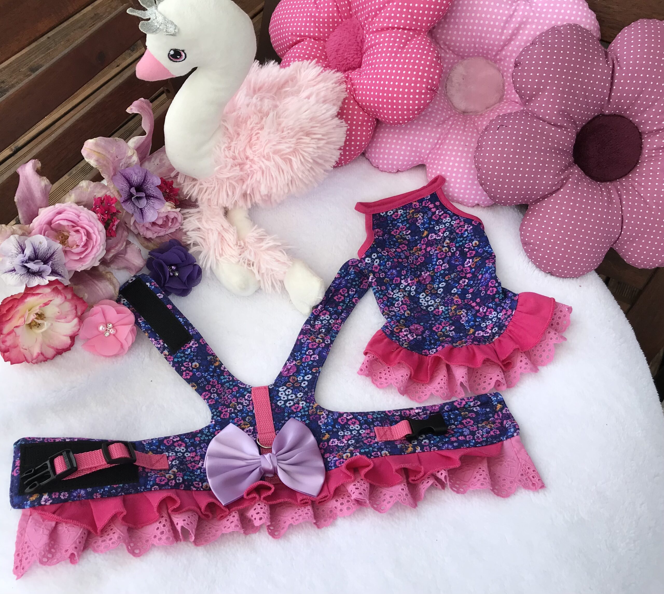 Super süüüüüßes Soft-Geschirr für Ihre Kleine Princessin.Zugemacht wird das Geschirr mit Klettverschluss am Hals und am Bauch.Zusätzlich mit Band und Klickverschluss am Bauch.Schöne details machen das Geschirr zum SOMMER HIGHLIGHT.Verzehrt mit Rüschen.Englische Spitze macht das Teil zum echten Hingucker.Nicht nur stylisch,modern aber auch bequem,robust.Kann ganz normal in der Waschmaschine gewaschen werden.