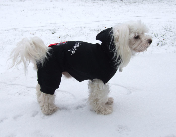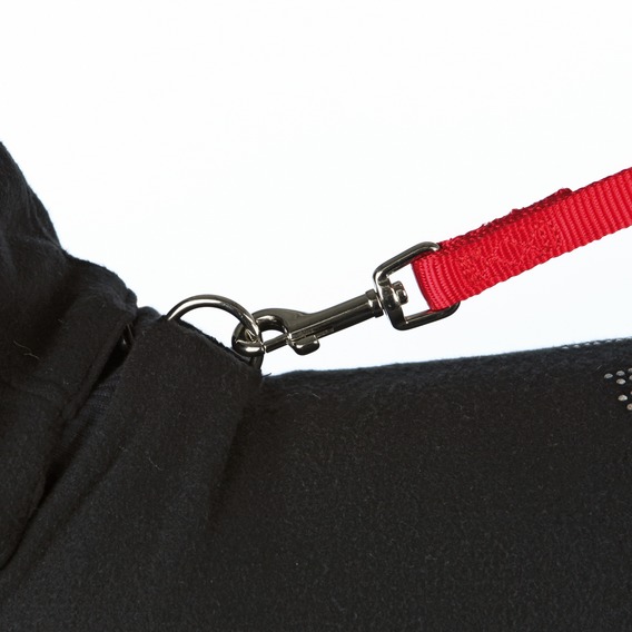 Auf dem Rücken(unter der Kaputze)befindet sich eine Öffnung zum Anleinen.Der Pullover hat Rollkragen was für wärme im Halsbereich sorgt