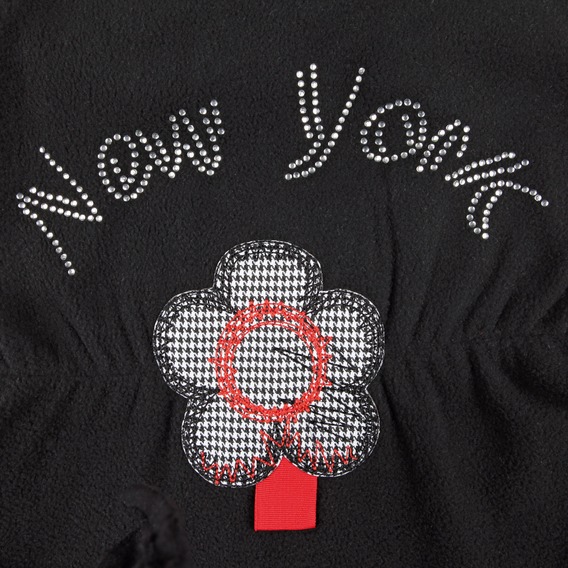 Auf dem Rücken befindet sich eine modische Aplikation aus Strass-Steinchen.Drauf steht:NEW YORK.Ausserdem ist auf dem Rücken auch eine hübsche Blume zu sehen
