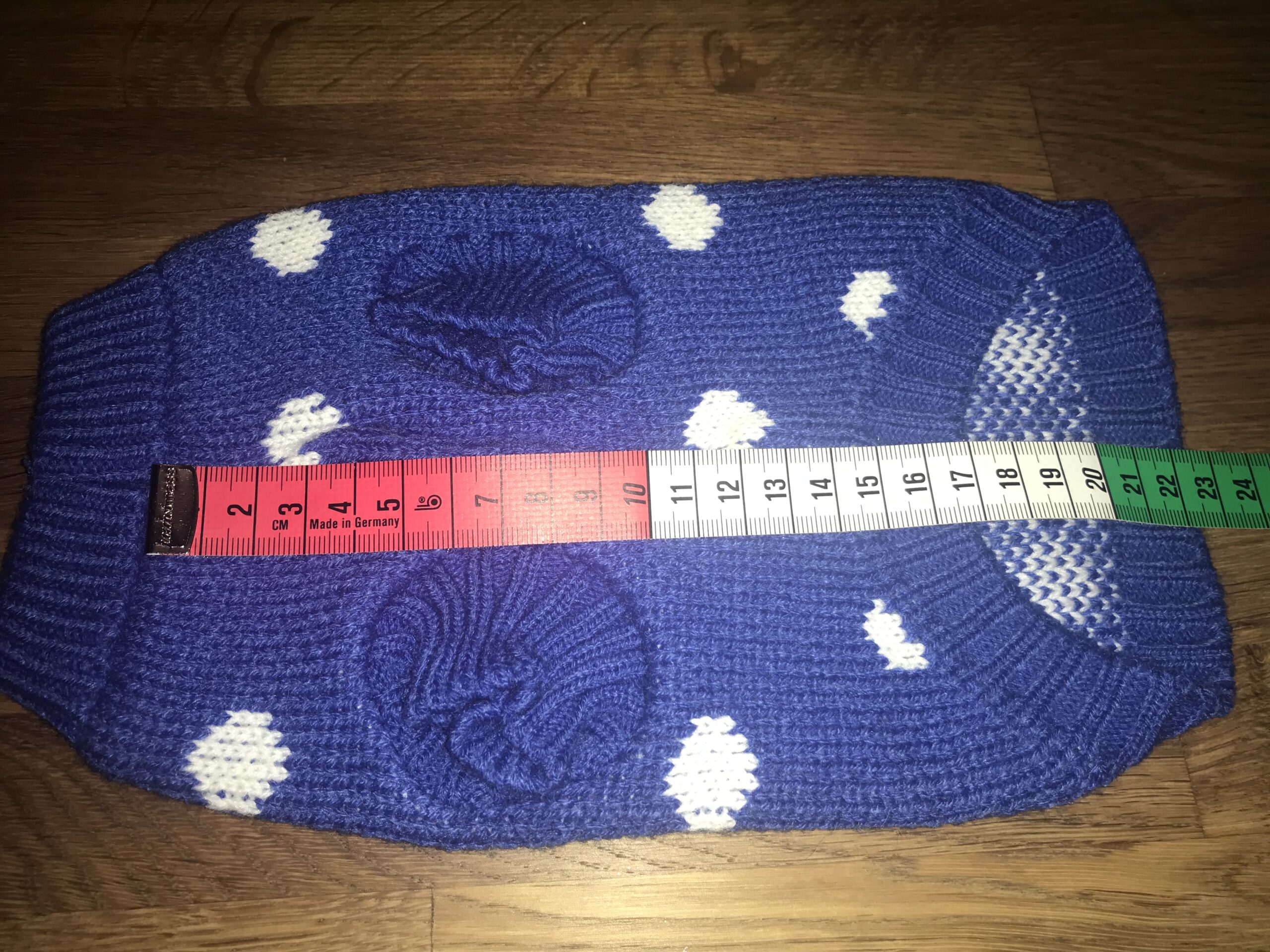 Brustumfang ca 32-34 cm ,Rückenlänge des Hundes ca.22-24 cm,Gewicht des Hundes ca .2-2,5 kg Pulli- Länge ohne Kragen mit abschluss Bündchen ca.22cm Länge am Bauch ca.17 cm (gemessen ohne Kragen)