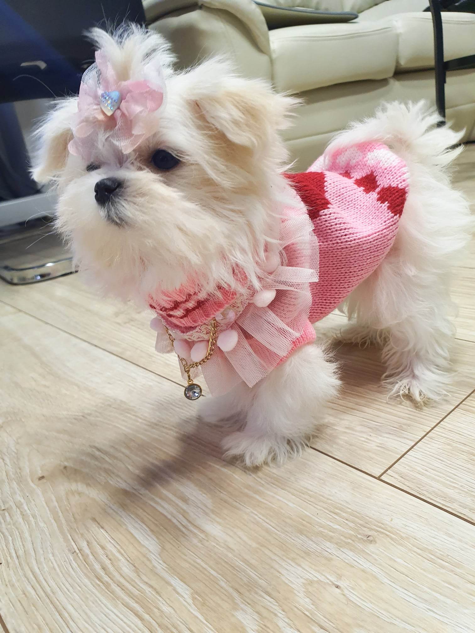 Super niedlicher Strickpullover der sich dem Körper des Hundes anpasst. Am Bauch lang. Besonders gut für Mädchen geeignet,weil der Bauch unten viel bedeckt ist.Der Pulli ist sehr warm und kuschelig weich.