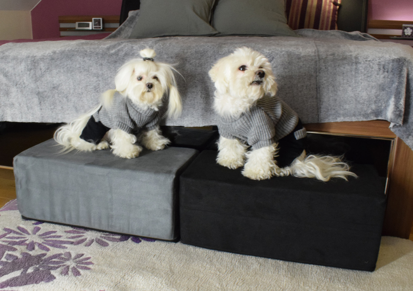 Bitte beachten:sehr kleine Hunde wie meine Bella auf dem Foto (2 kg,Rücken 22cm,Widerrishöhe 18 cm) schaffen es nicht auf die Stuffe zu klettern