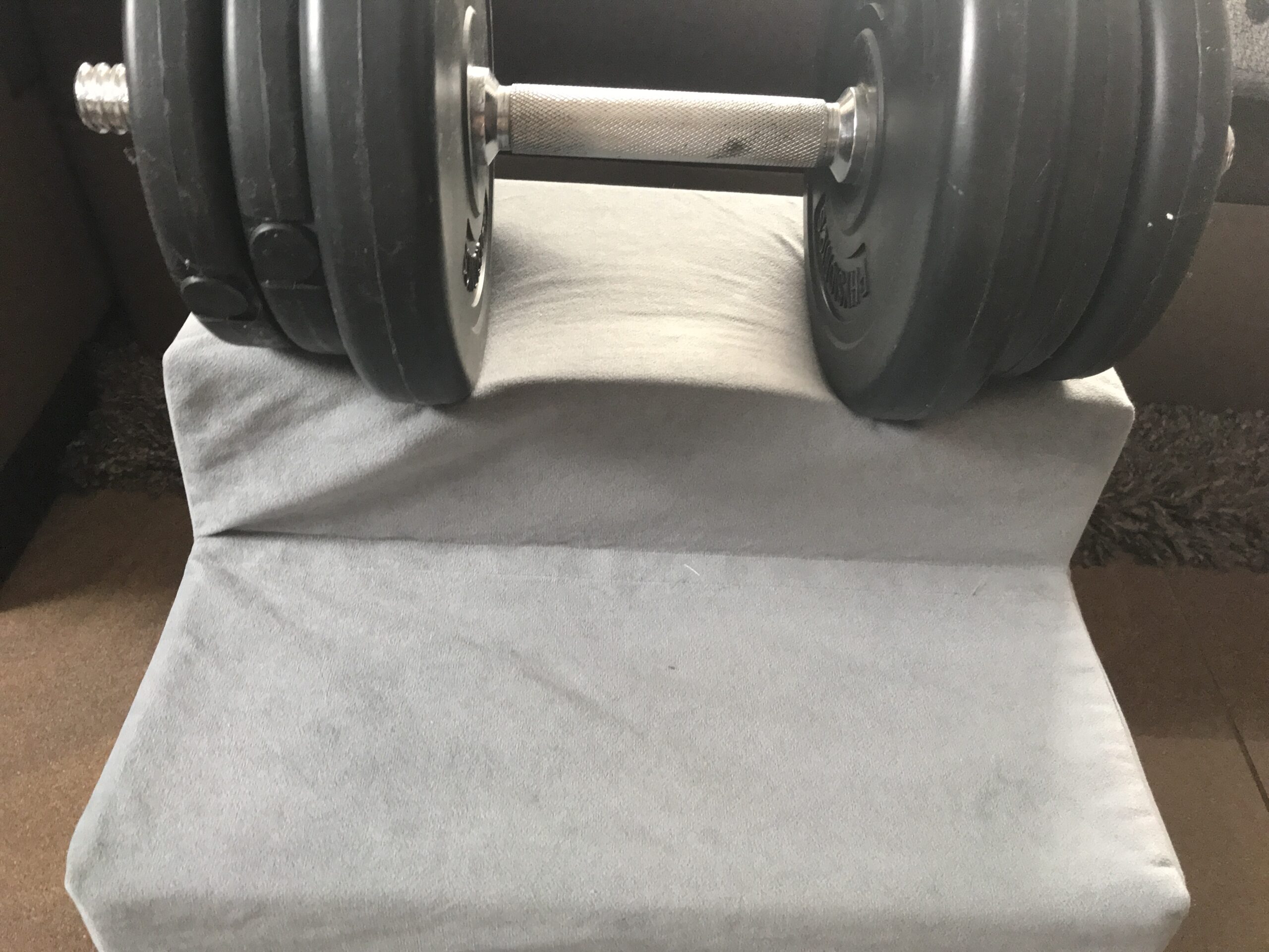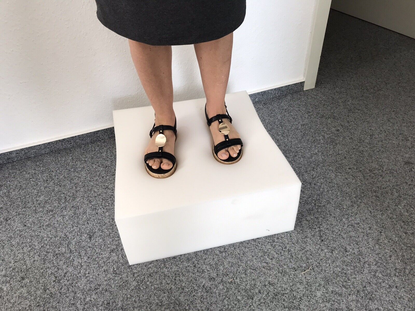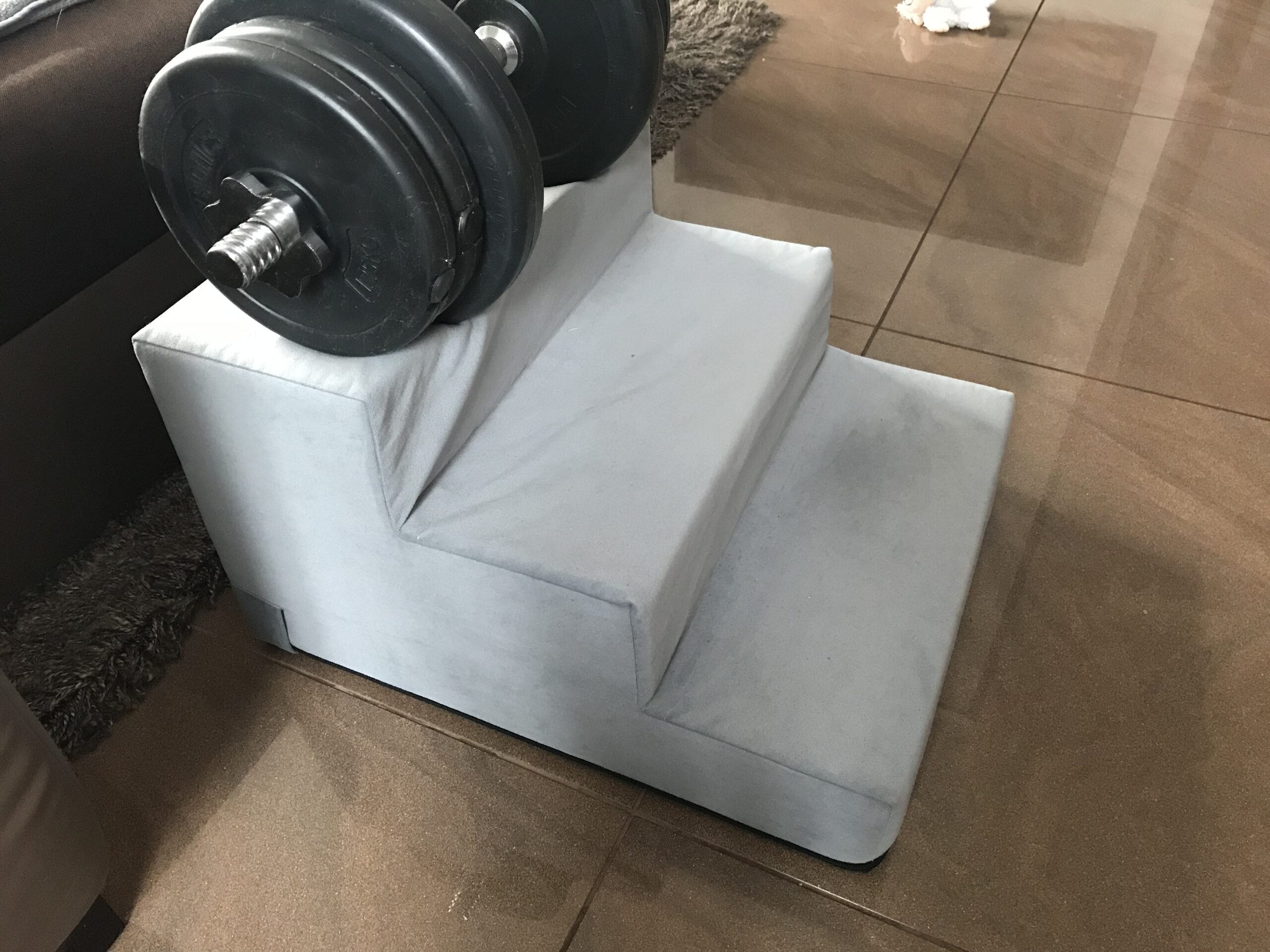 Auf einem Foto sehen Sie die Treppe in der Gr.S wo oben drauf ein Hantel mit 10 kg Gewicht liegt.Damit man sich vorstellen kann was für Dichte er Schaumstoff hat