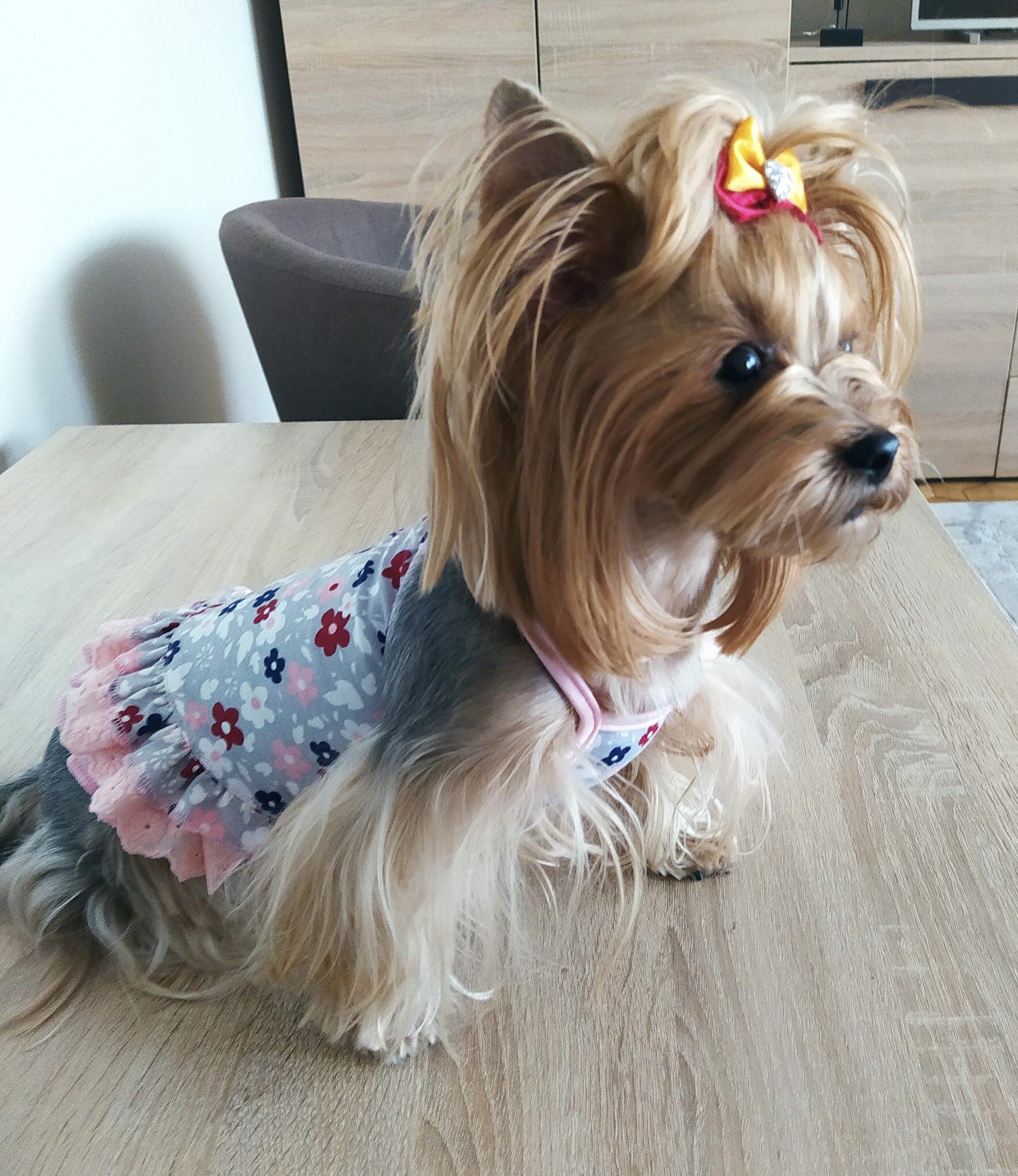 Halsumfang ca 19-22 cm,Brustumfang ca 28-34 cm,Rückenlänge des Hundes 21-25cm,Gewicht des Hundes ca .2 -2,5 kgLänge inkl.Rüschen ca.24-25cm