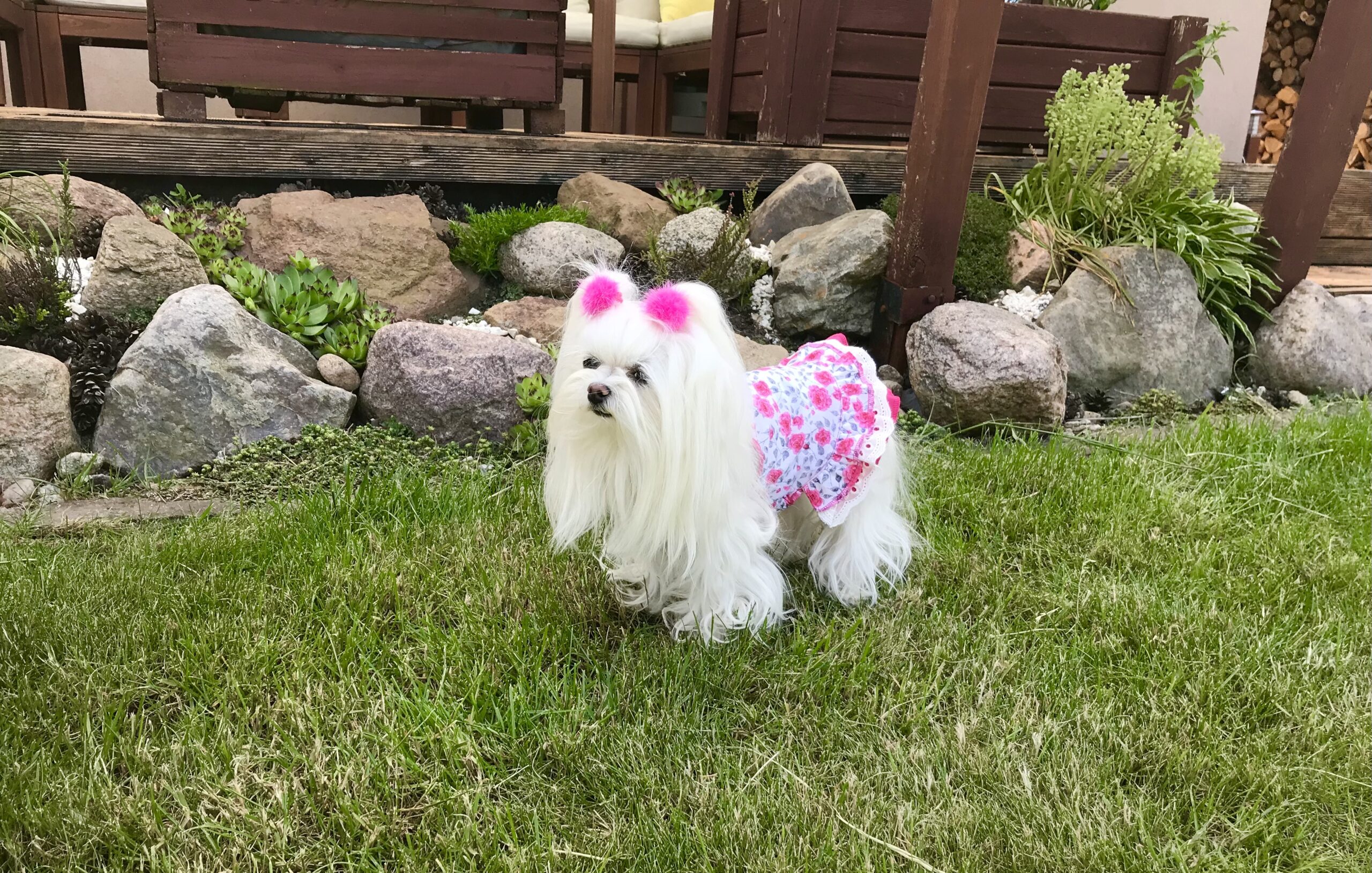 Halsumfang ca 22-26 cm,Brustumfang ca 34-36 cm ,Rückenlänge des Hundes 25-28cm ,Gewicht des Hundes ca 2,5-3,5kg Länge inkl.Rüschen ca.26-27cm