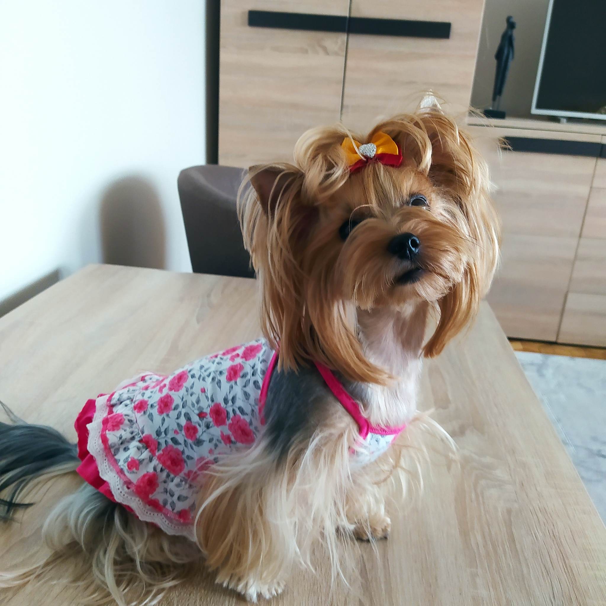 Halsumfang ca 19-22 cm,Brustumfang ca 28-34 cm,Rückenlänge des Hundes 21-25cm,Gewicht des Hundes ca .2 -2,5 kgLänge inkl.Rüschen ca.24-25cm
