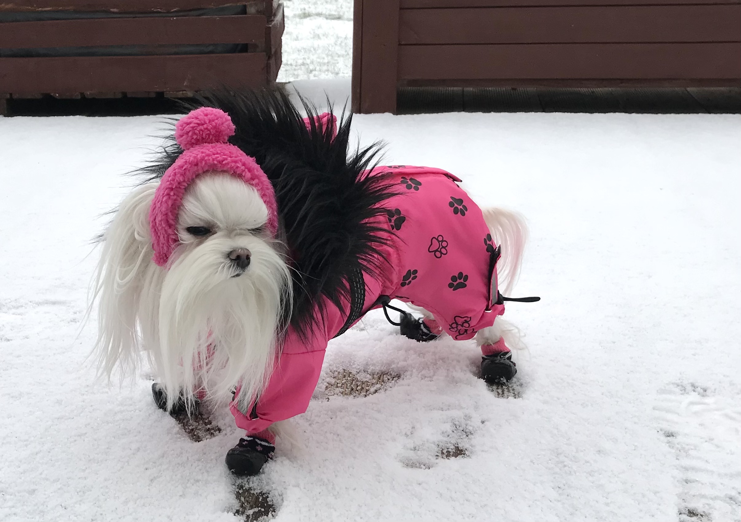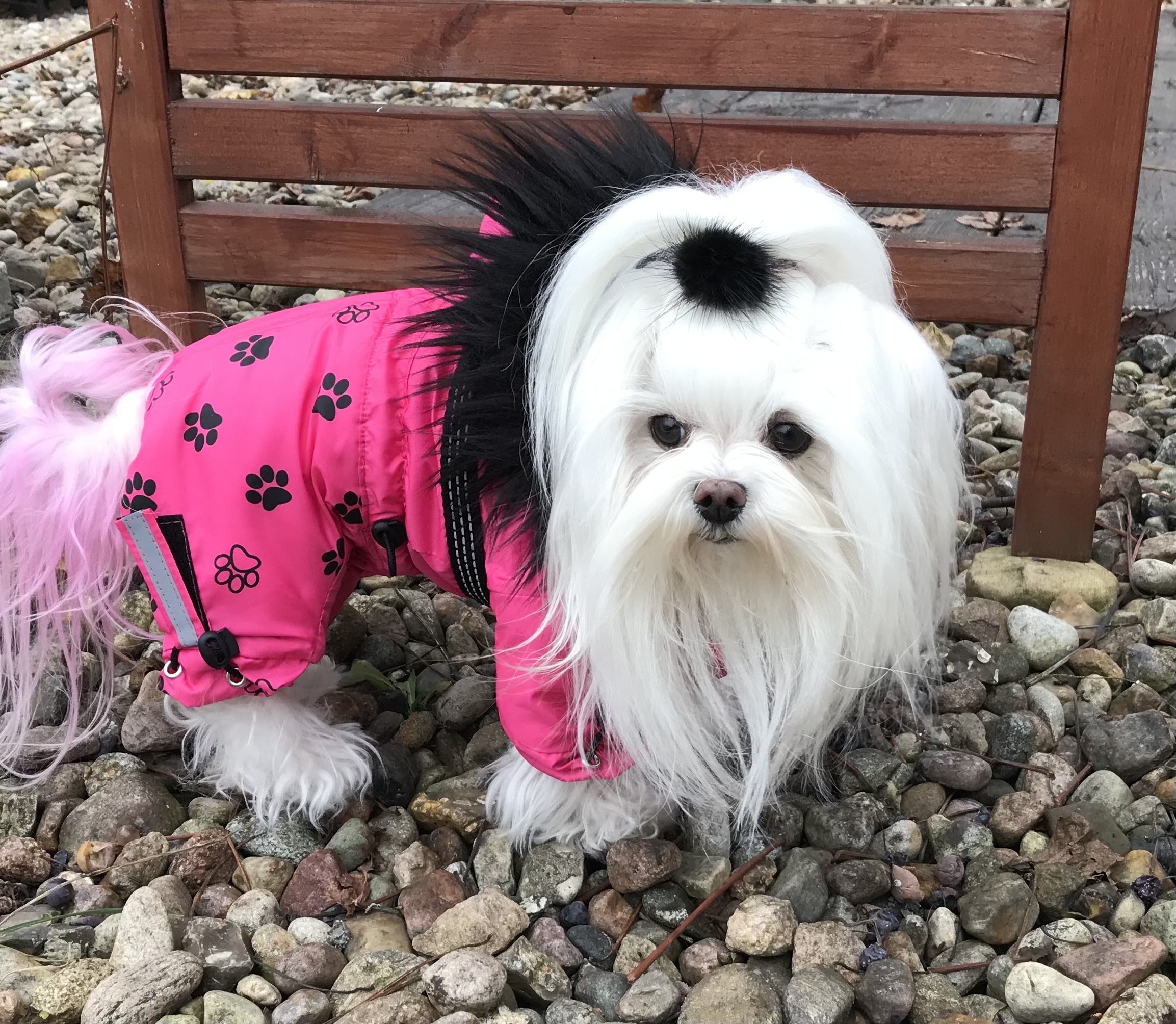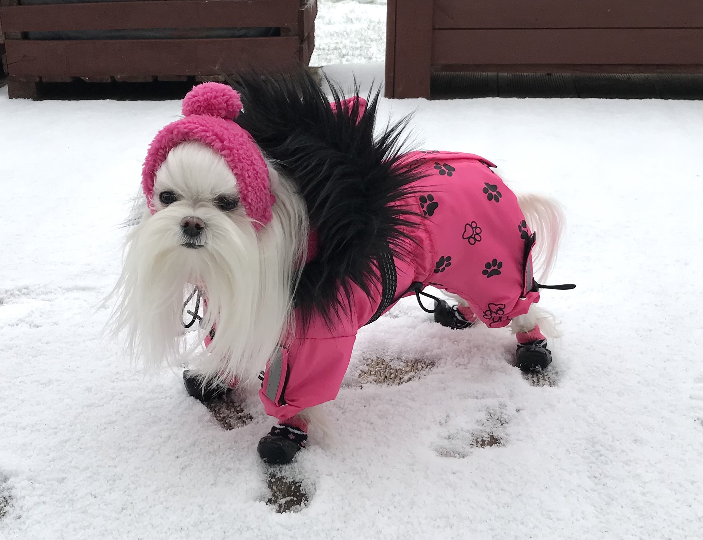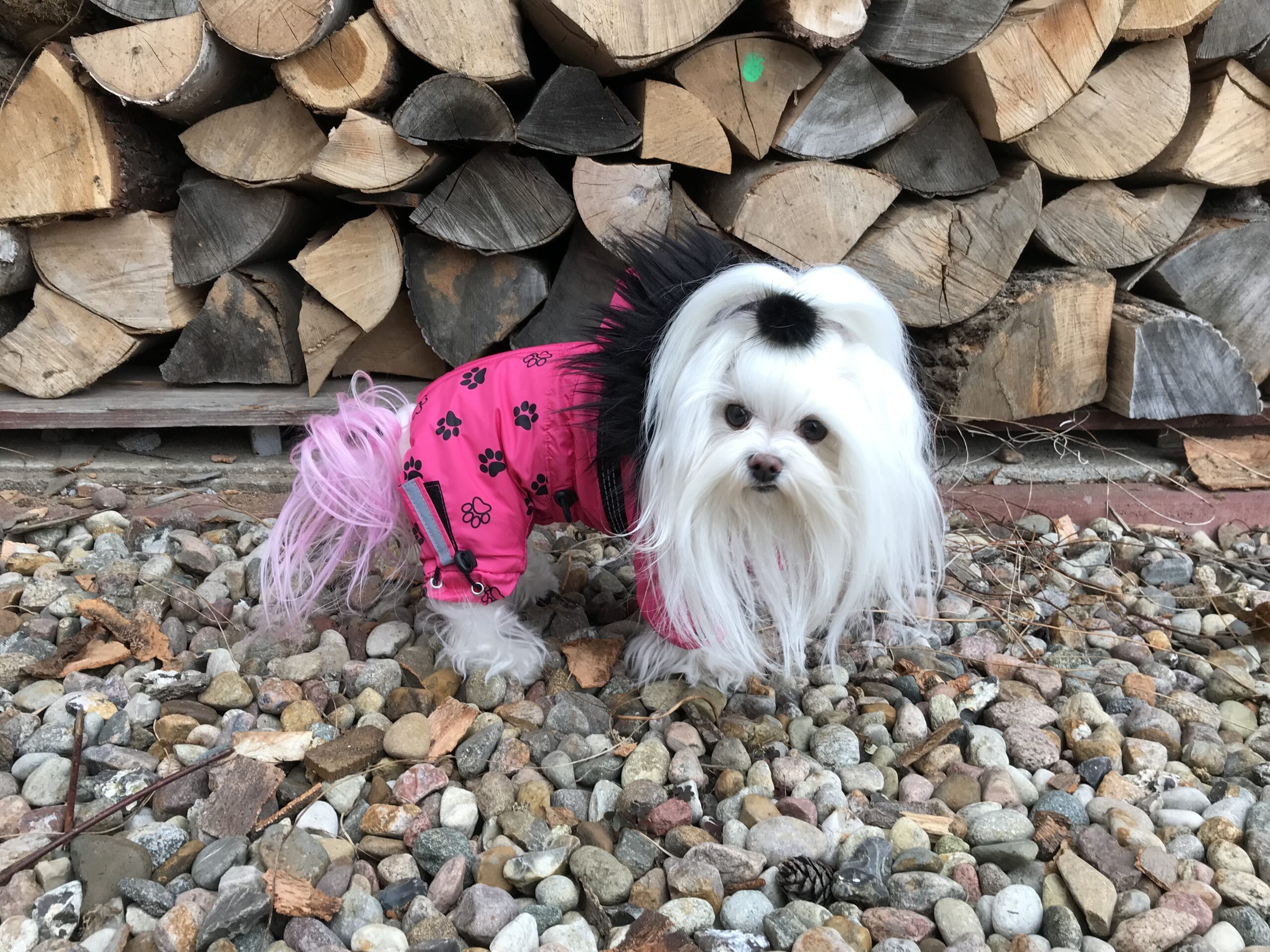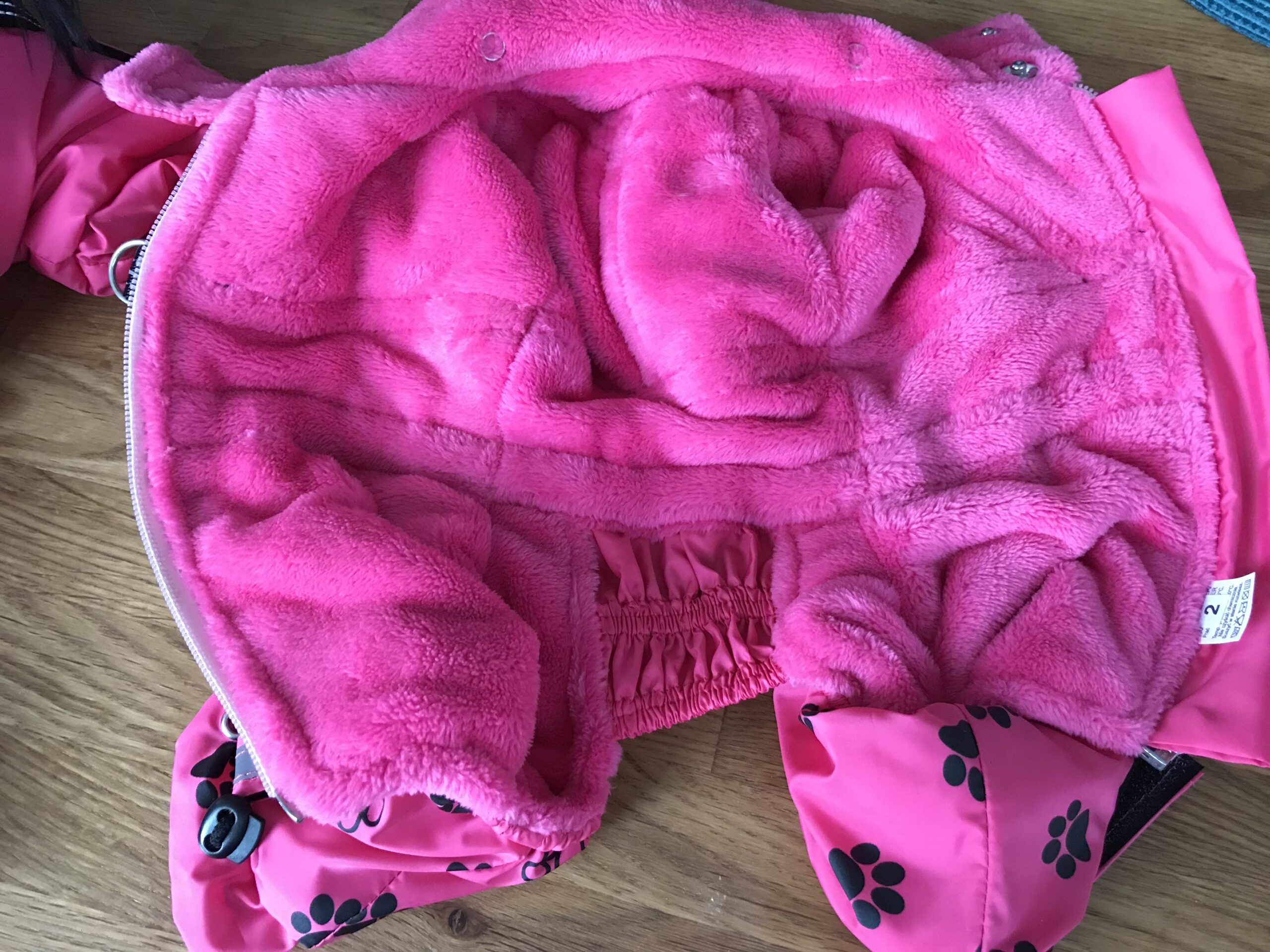 Das Mäntelchen ist  super bei Schneewetter(verhindert die Schneeklumpen am Fell).