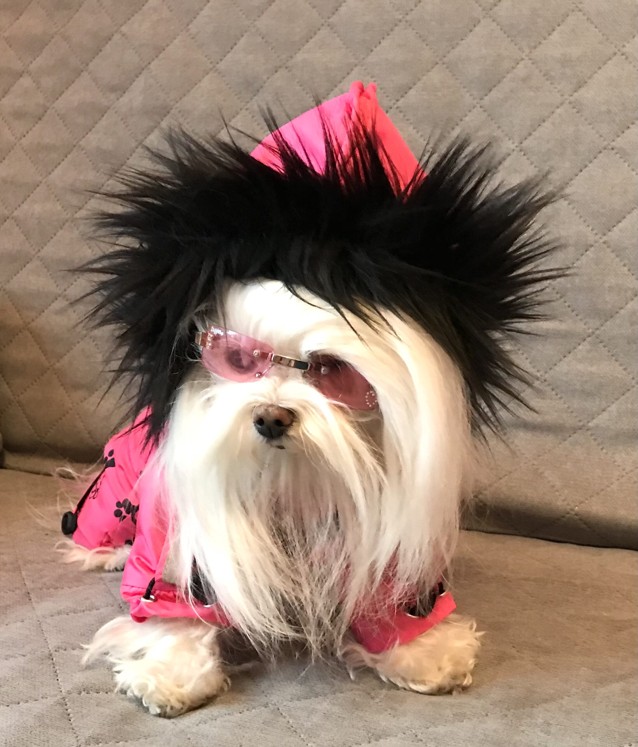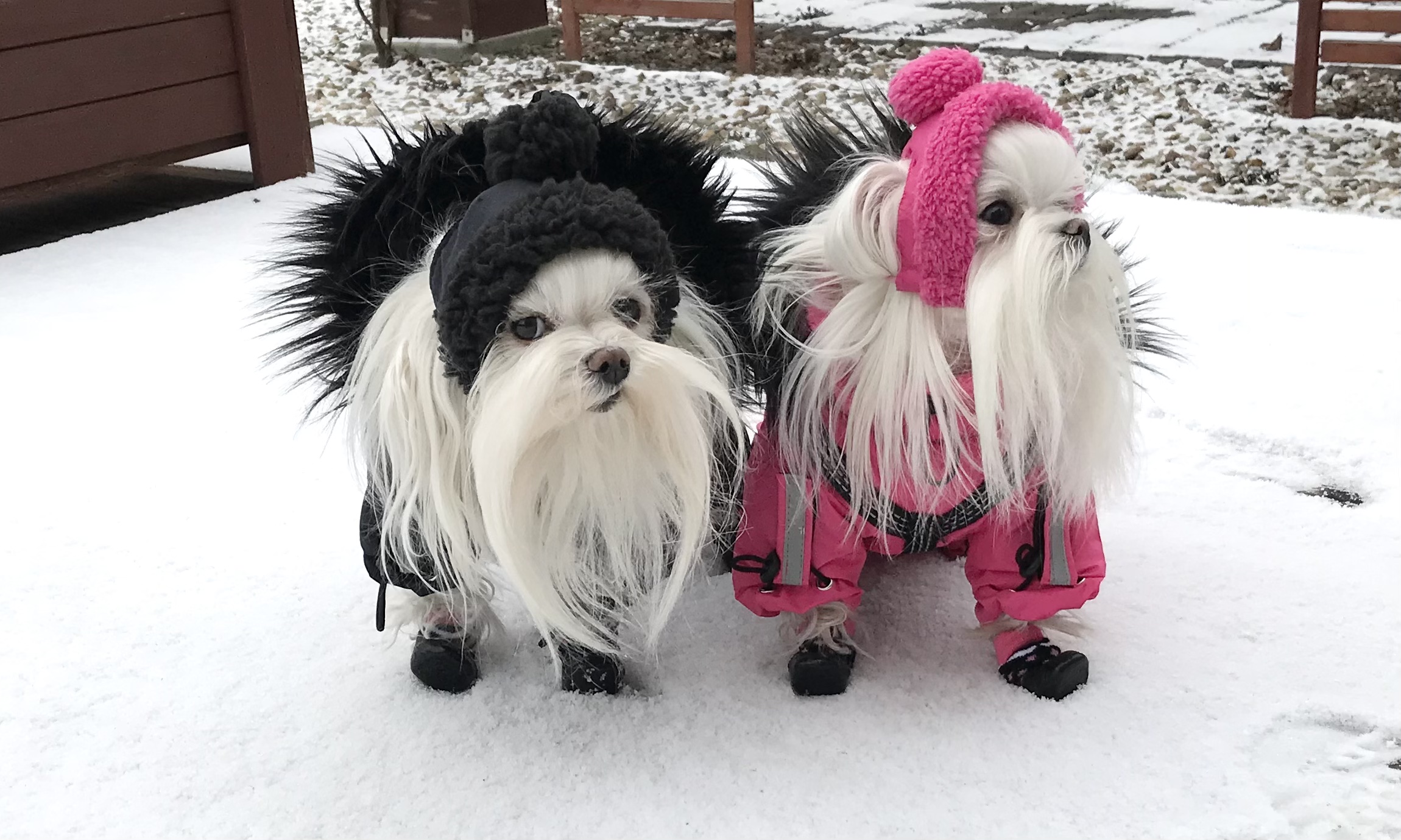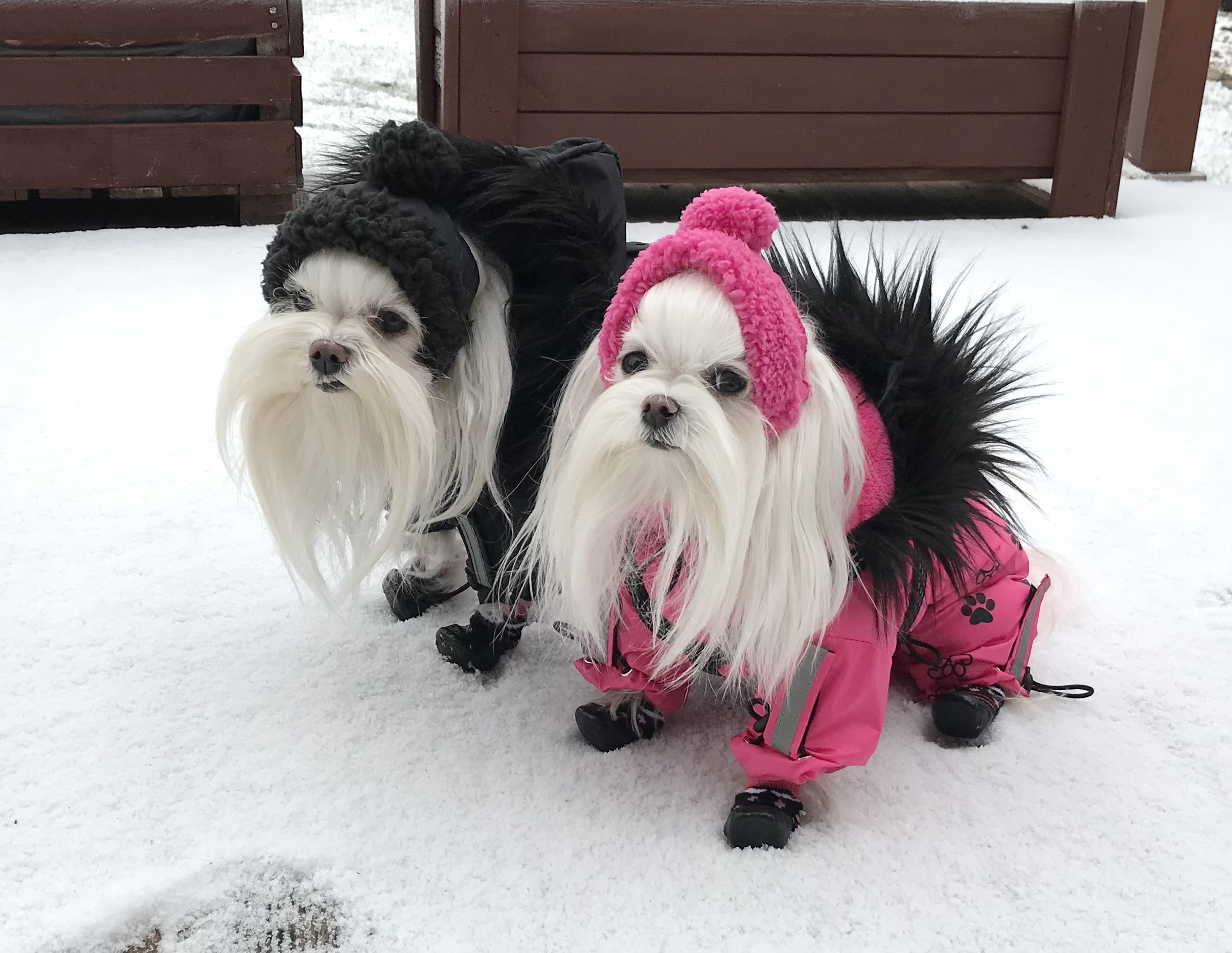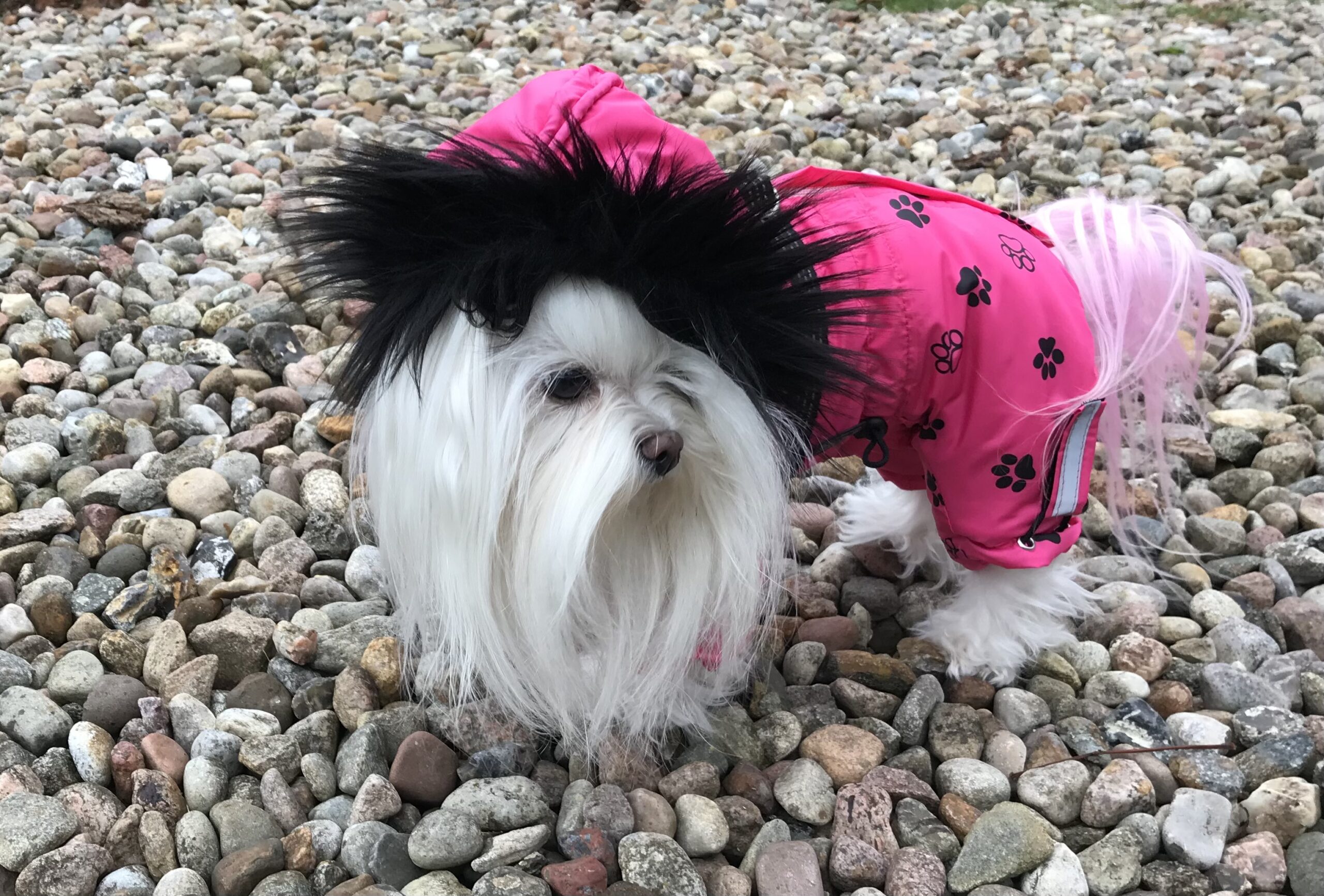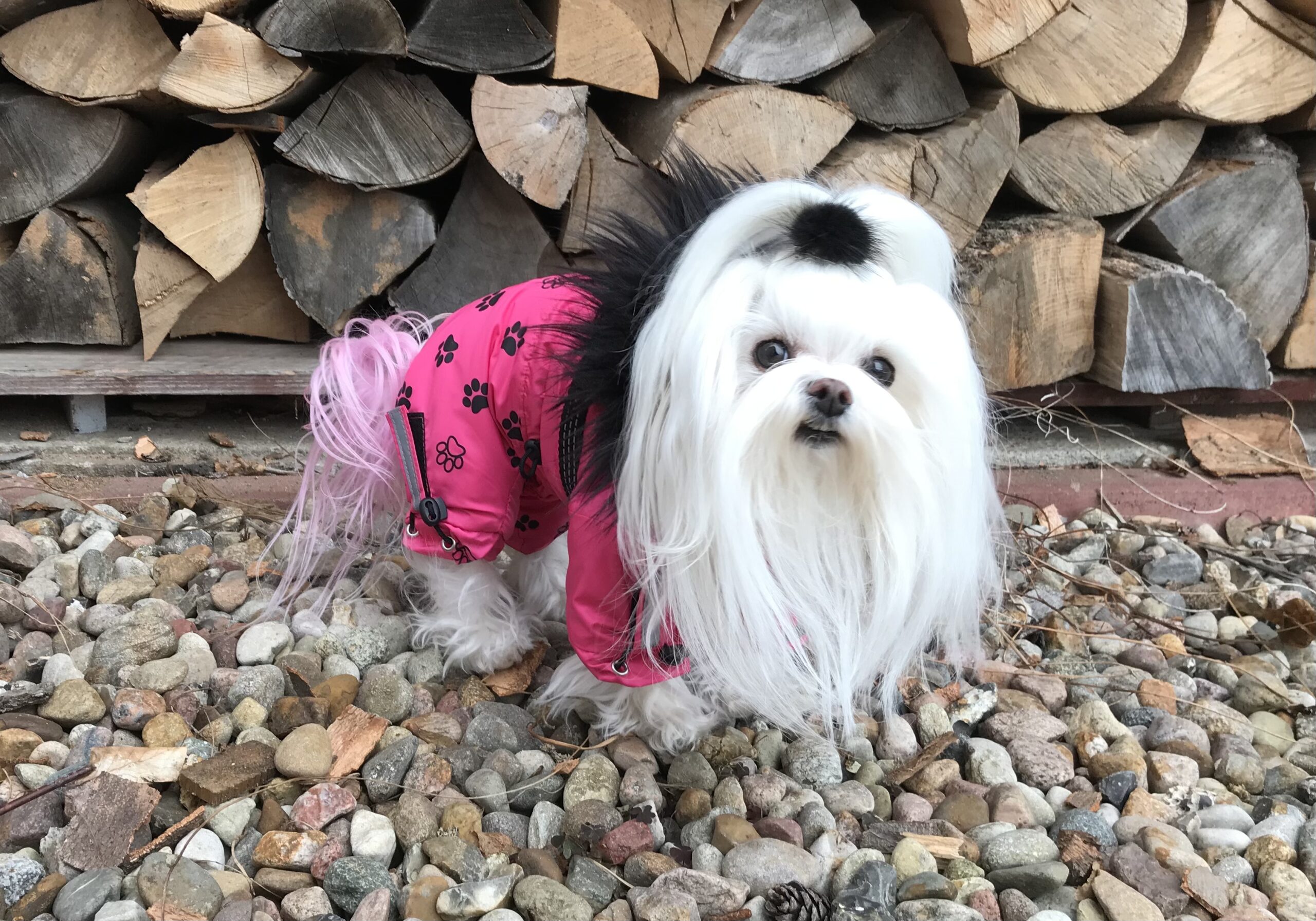 Das Mäntelchen ist  super bei Schneewetter(verhindert die Schneeklumpen am Fell).