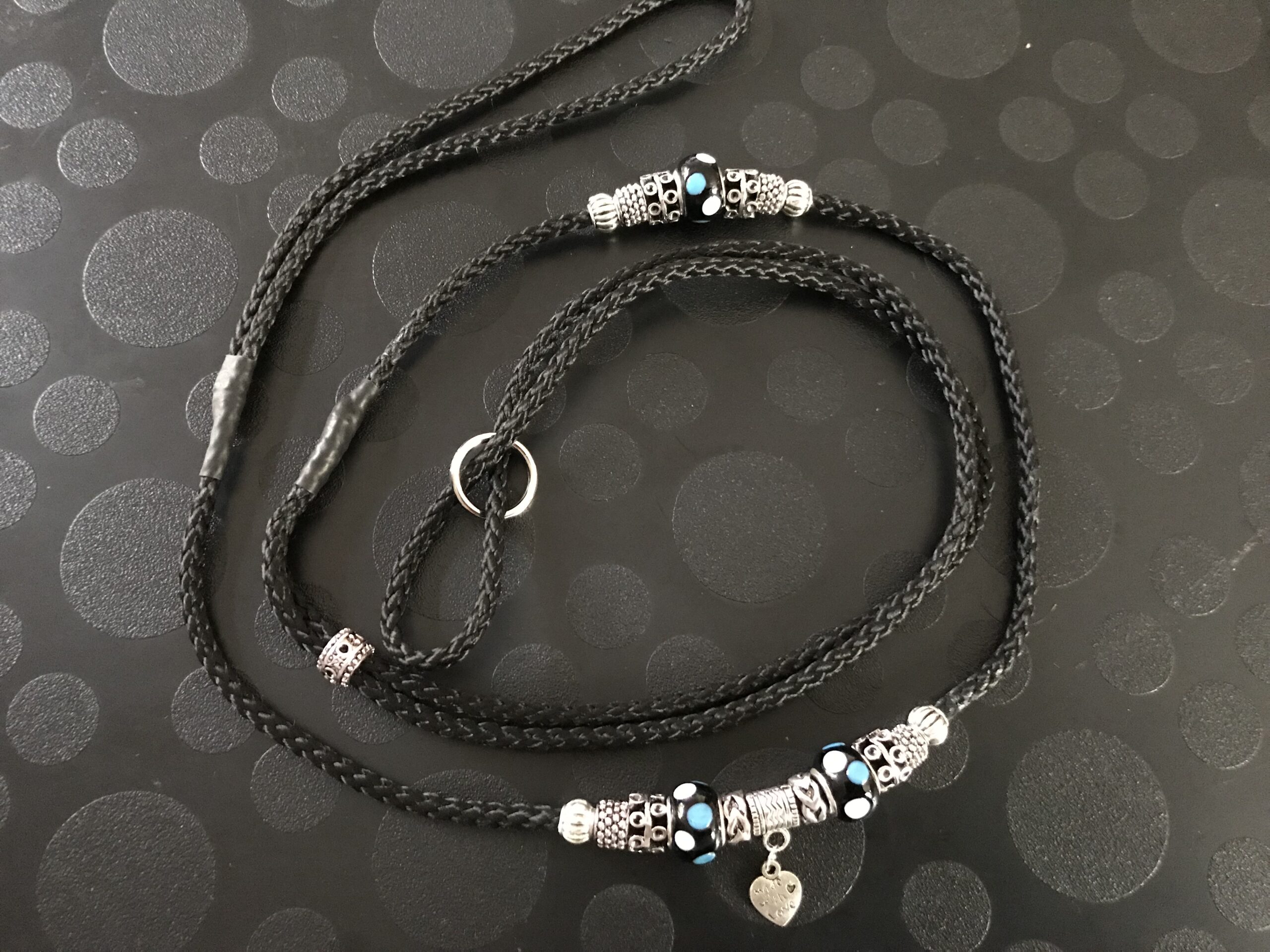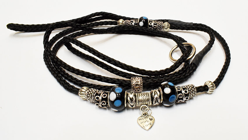 Erfahrungsgemäß wäre eine längere Leine mit Perlen ungeeignet. Wäre diese länger, dann würde man die oben sitzenden Perlen nicht sehen.