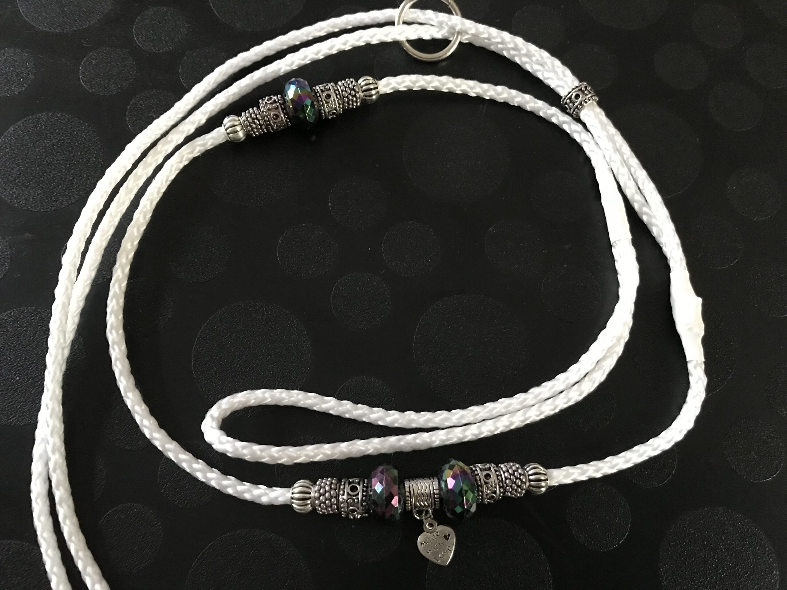 Erfahrungsgemäß wäre eine längere Leine mit Perlen ungeeignet. Wäre diese länger, dann würde man die oben sitzenden Perlen nicht sehen.