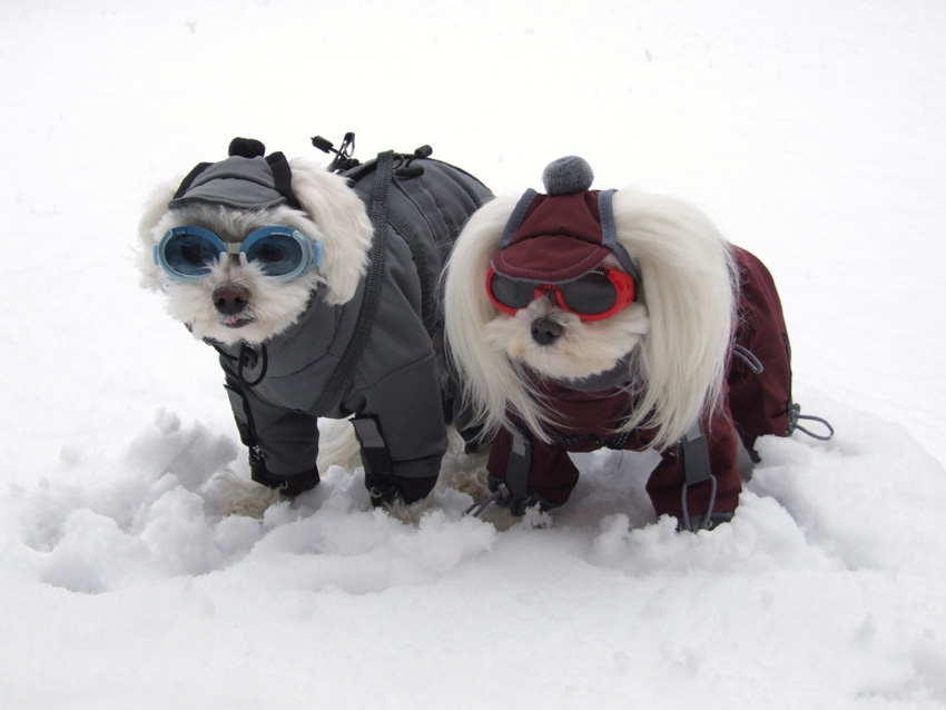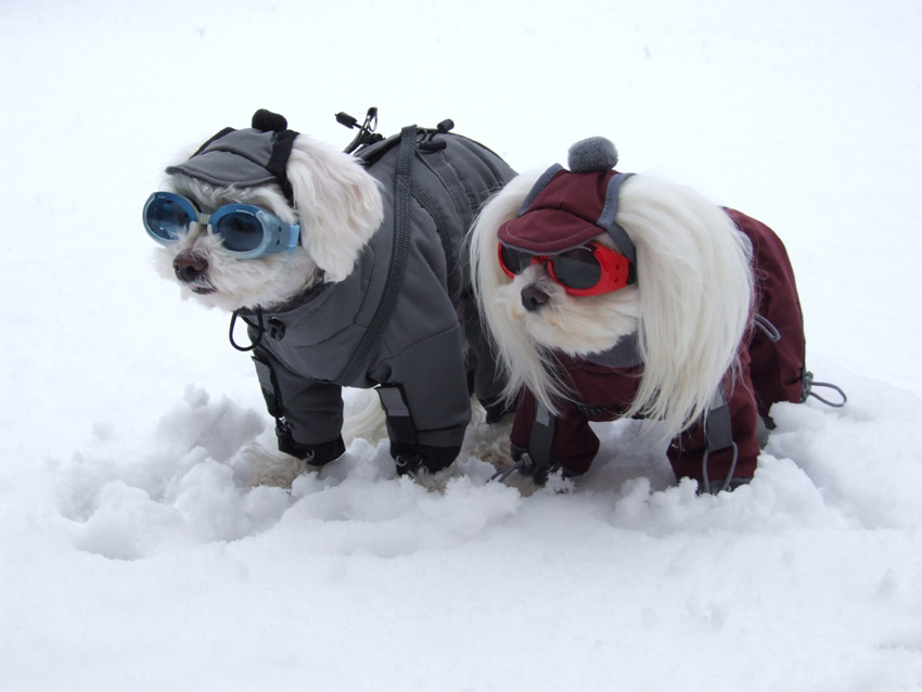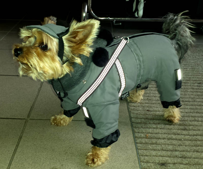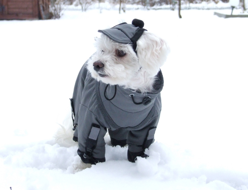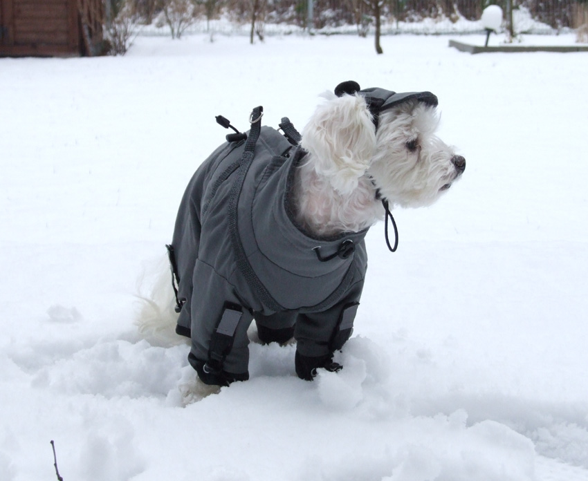 Das Mäntelchen ist super bei Schneewetter(verhindert die Schneeklumpen am Fell).