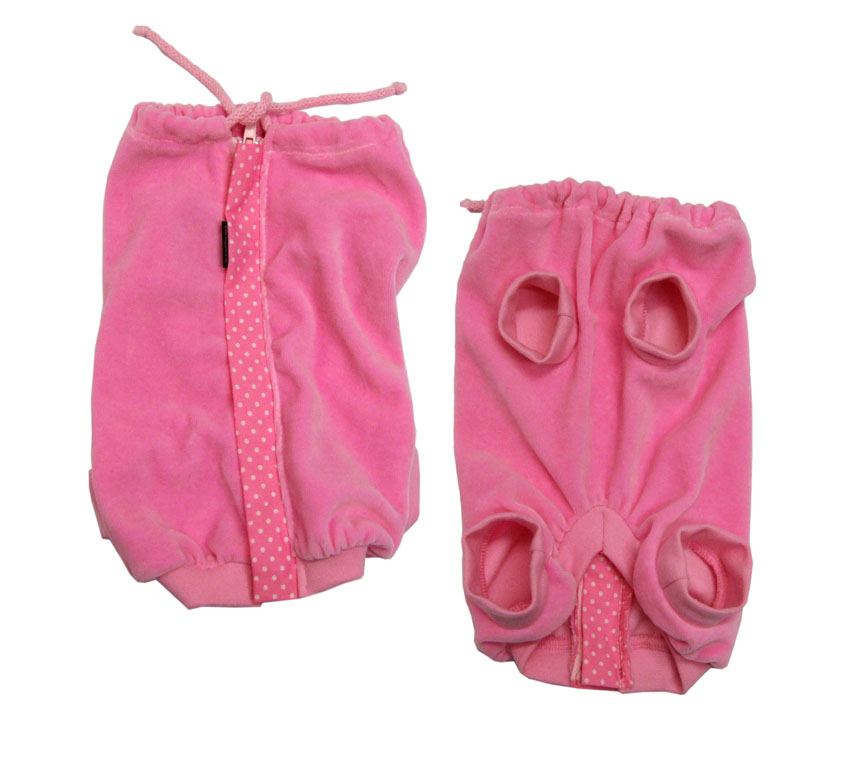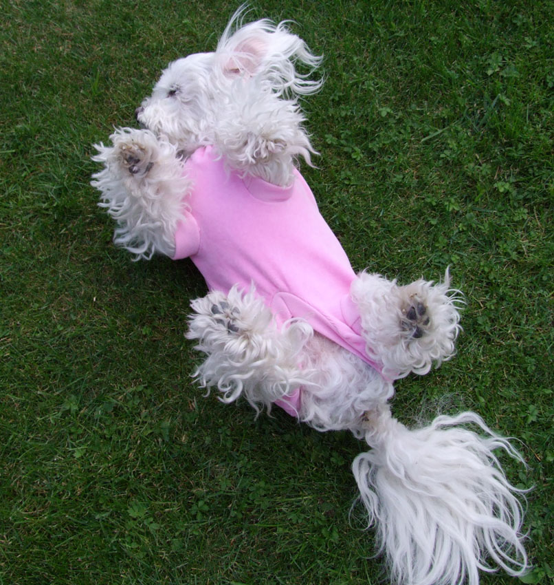 Angezogen wird das Hemd z.B nach Operationen im Bauchbereich. Super geeignet auch bei Leckekzemen oder Juckreiz. Dadurch, dass der ganze Bauch bedeckt wird, kann der Hund an der Wunde nicht lecken. Das OP Hemd hat an den Beinausschnitten auch extra *Beinchen* angenäht und bietet einen sicheren Sitz und verhindert dass sich der Hund durch einen Beinausschnitt belecken kann. Zugemacht wird das Hemd auf dem Rücken mit einem praktischen Reisverschluss. Vorne am Hals hat das OP Hemdchen noch 2 Kordeln die man zusammenbinden kann. Das garantiert perfekten Sitz. Hündinnen können mit dem OP-Body draußen beide Geschäfte verrichten . Sie müssen den Body dafür dem Hund nicht ausziehen. Unten ist ein Ausschnitt der das ermöglicht.