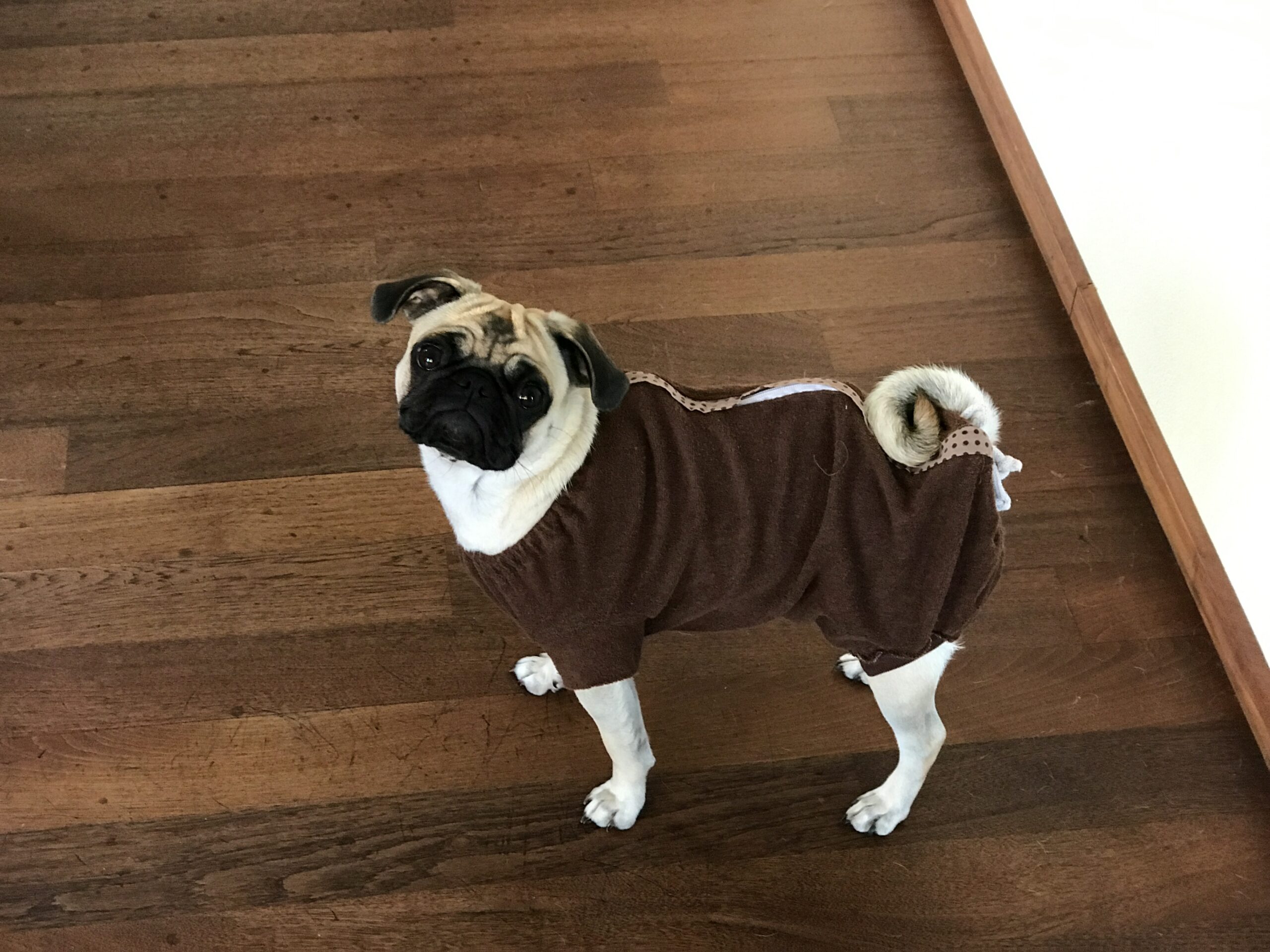 Vor dem spazieren gehen müssen Sie ihn vorher ausziehen.Ansonsten kann der Hund keine Geschäftchen erledigen.