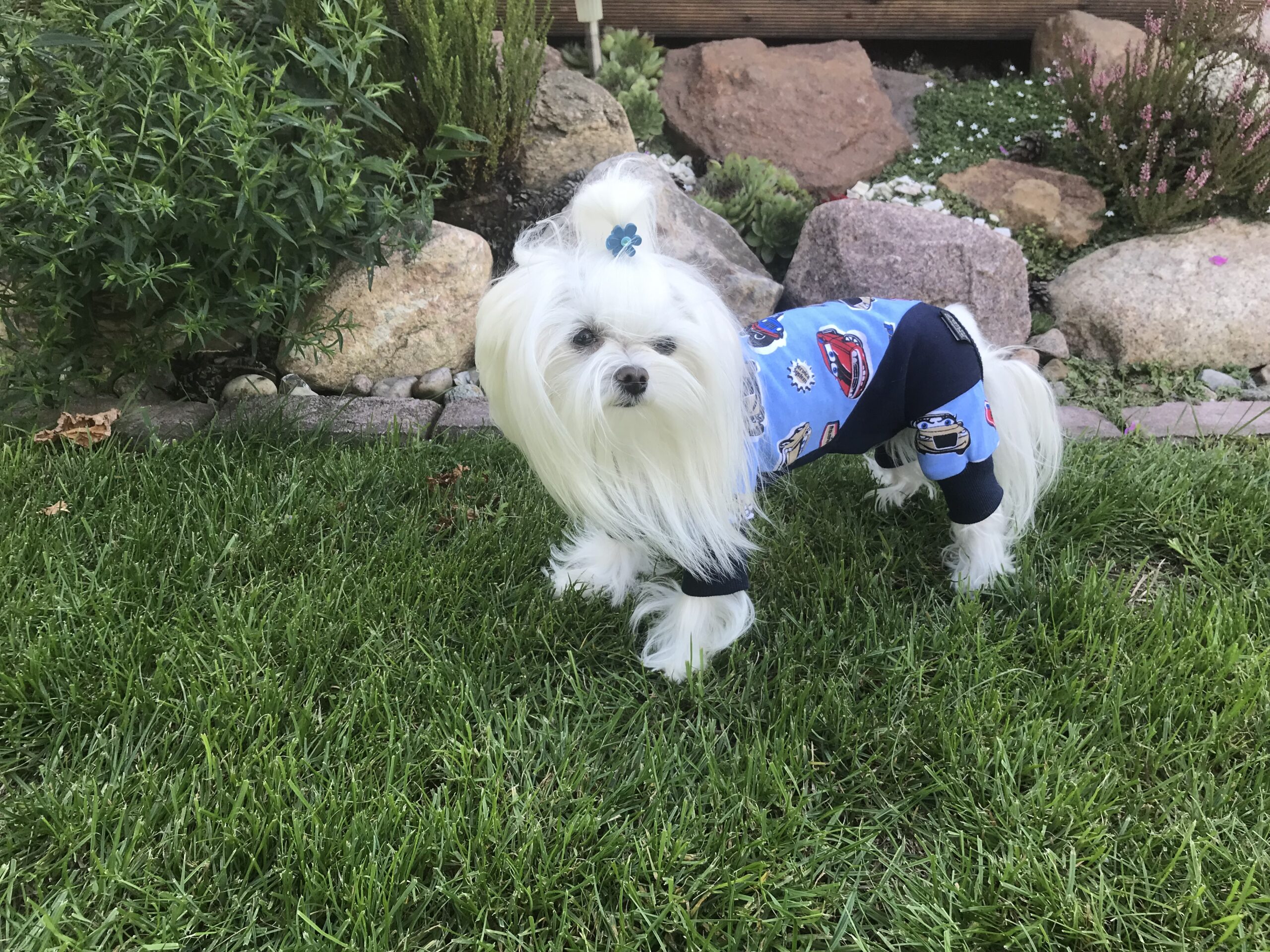 Hunde-Pyjama oder Hausanzug. Unsere neue „Erfindung „ extra für Zu Hause. Fast der ganze Bauch bleibt bedeckt.Das soll auch so sein.