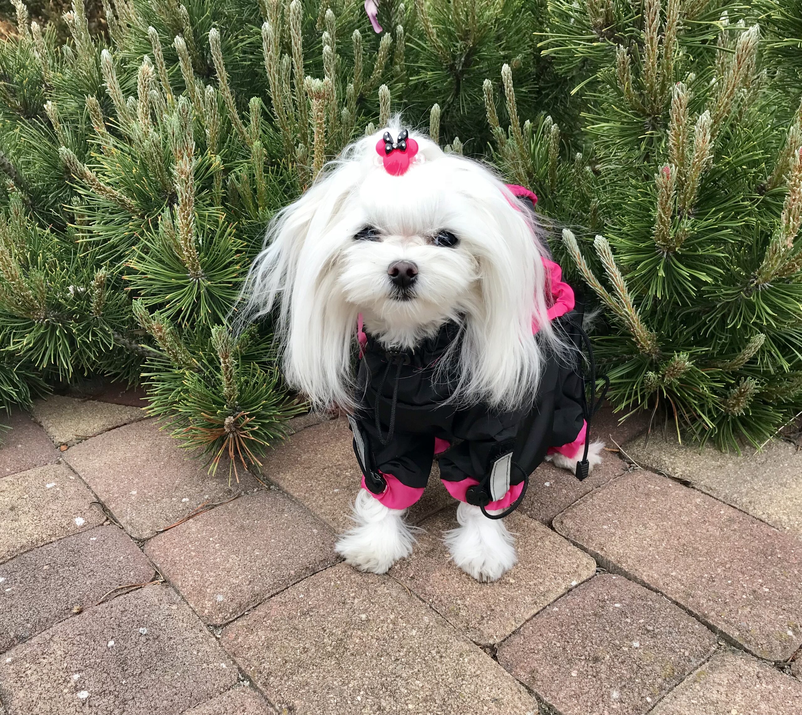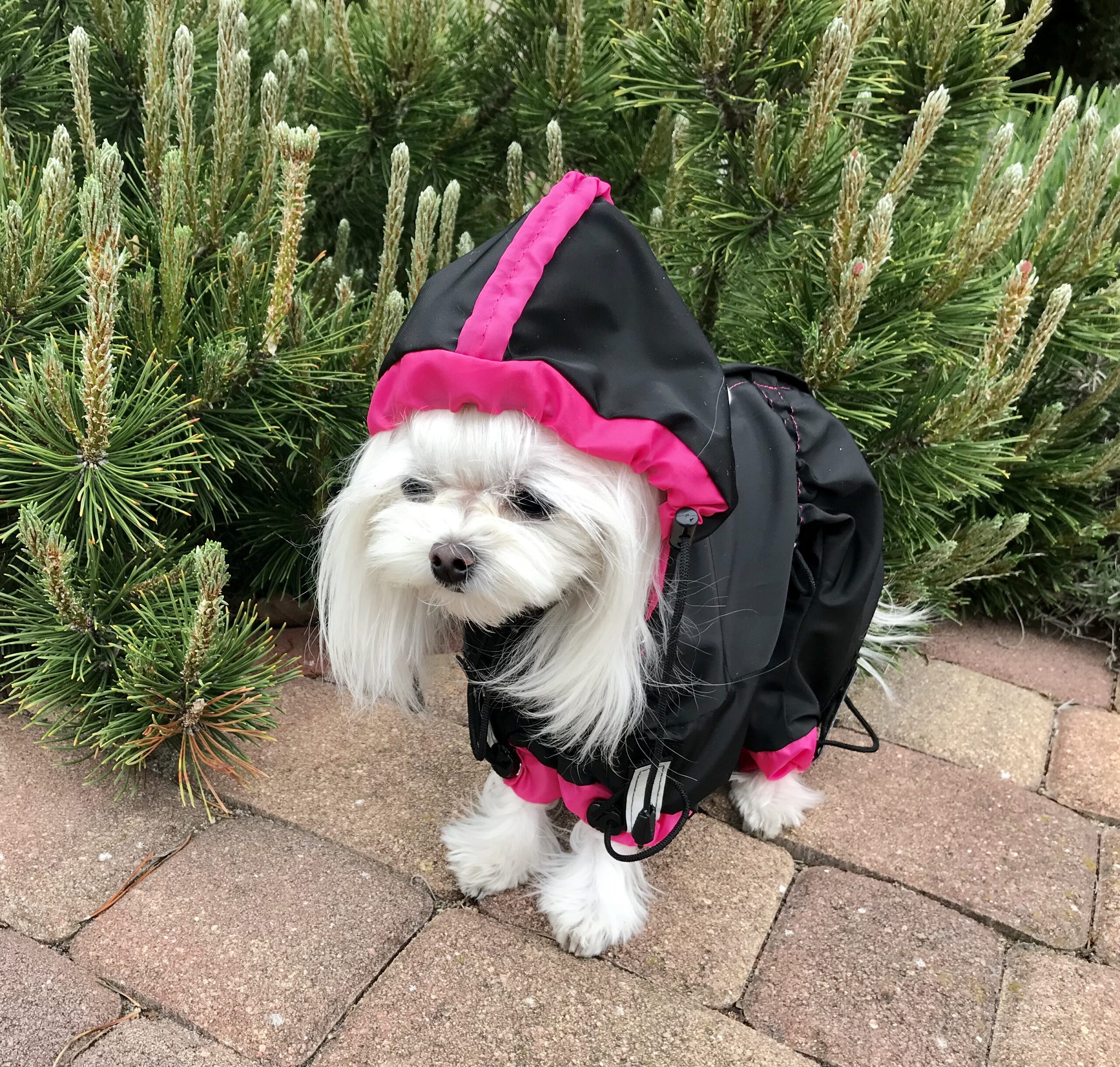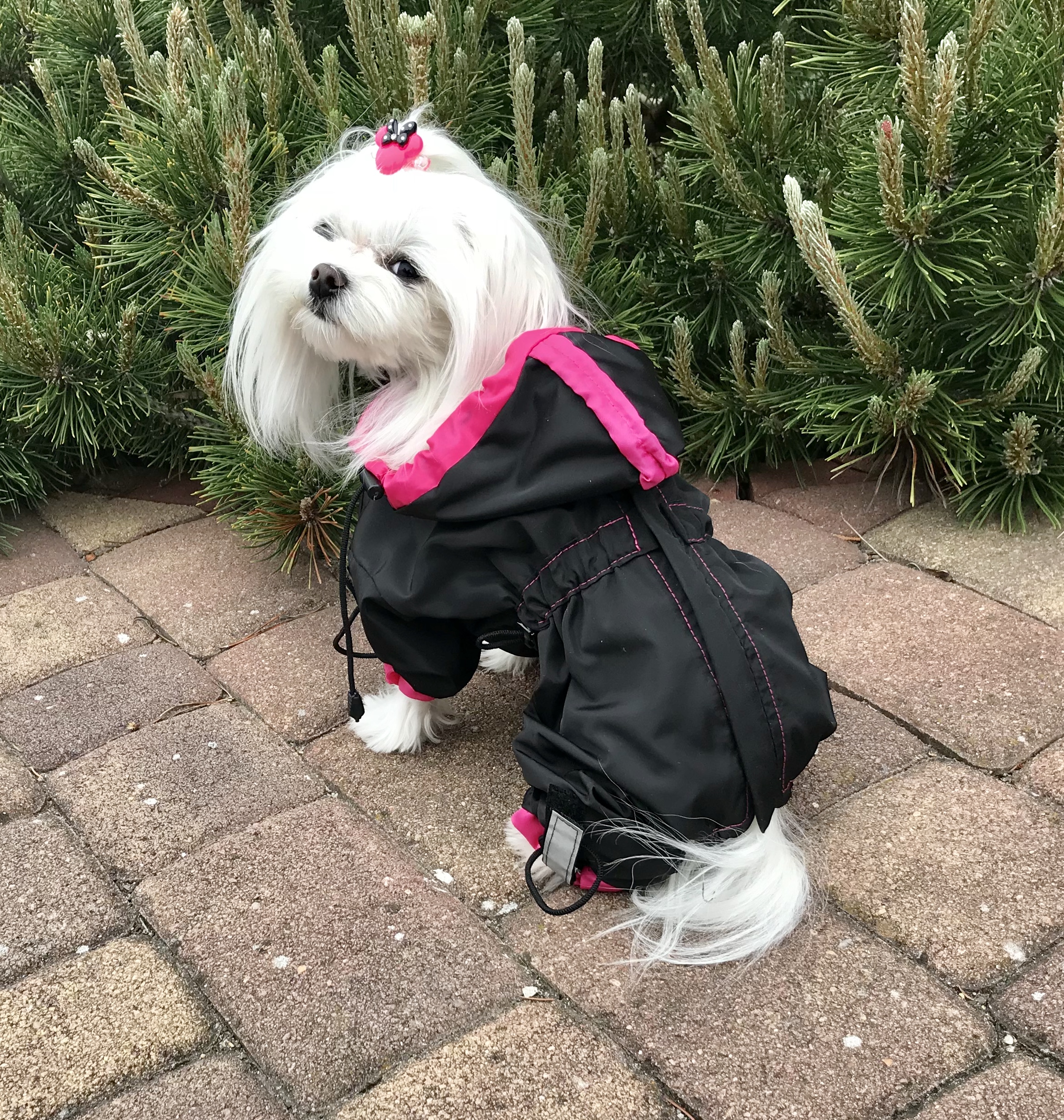 Das Mäntelchen ist super bei Schneewetter(verhindert die Schneeklumpen am Fell).
