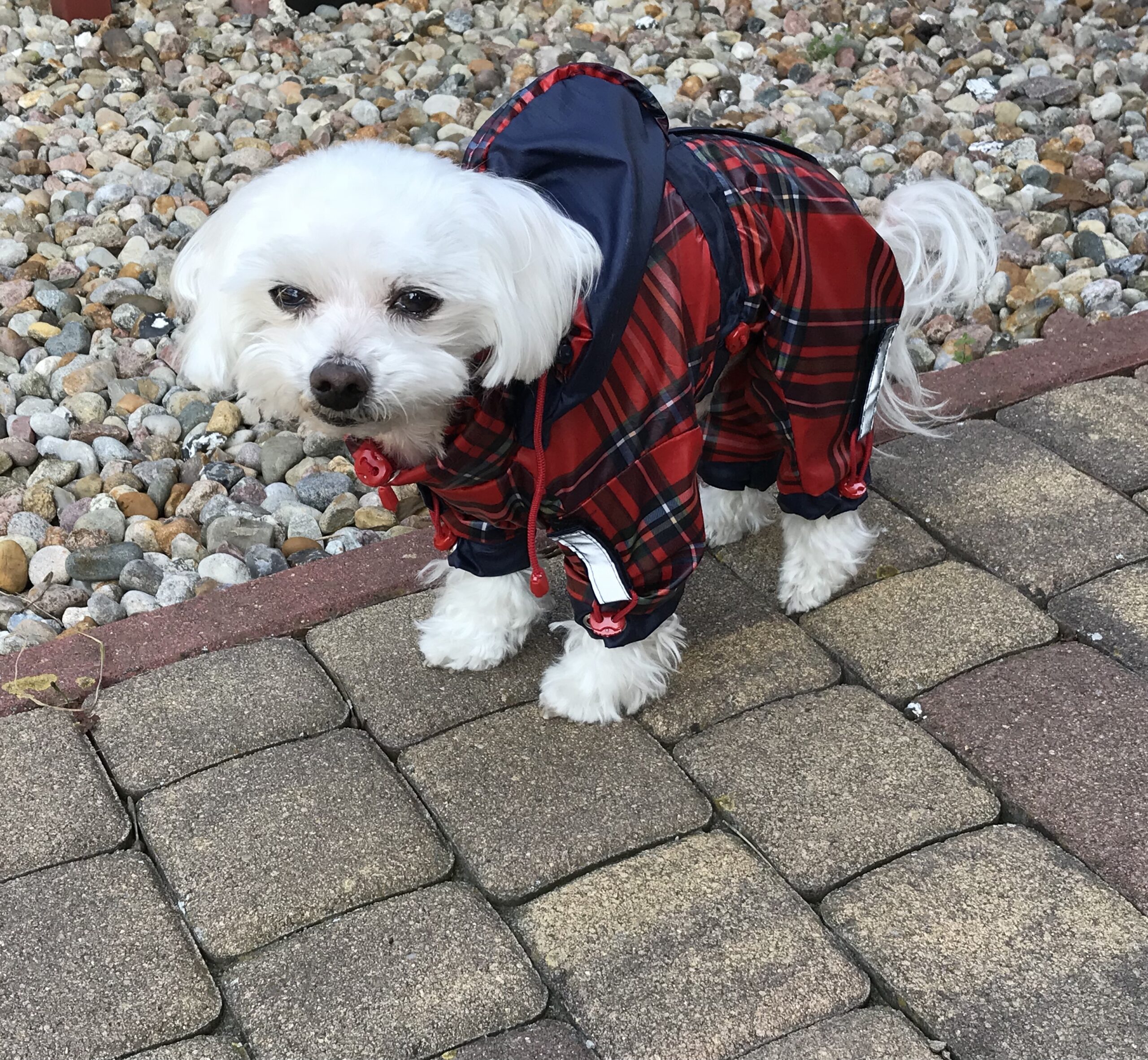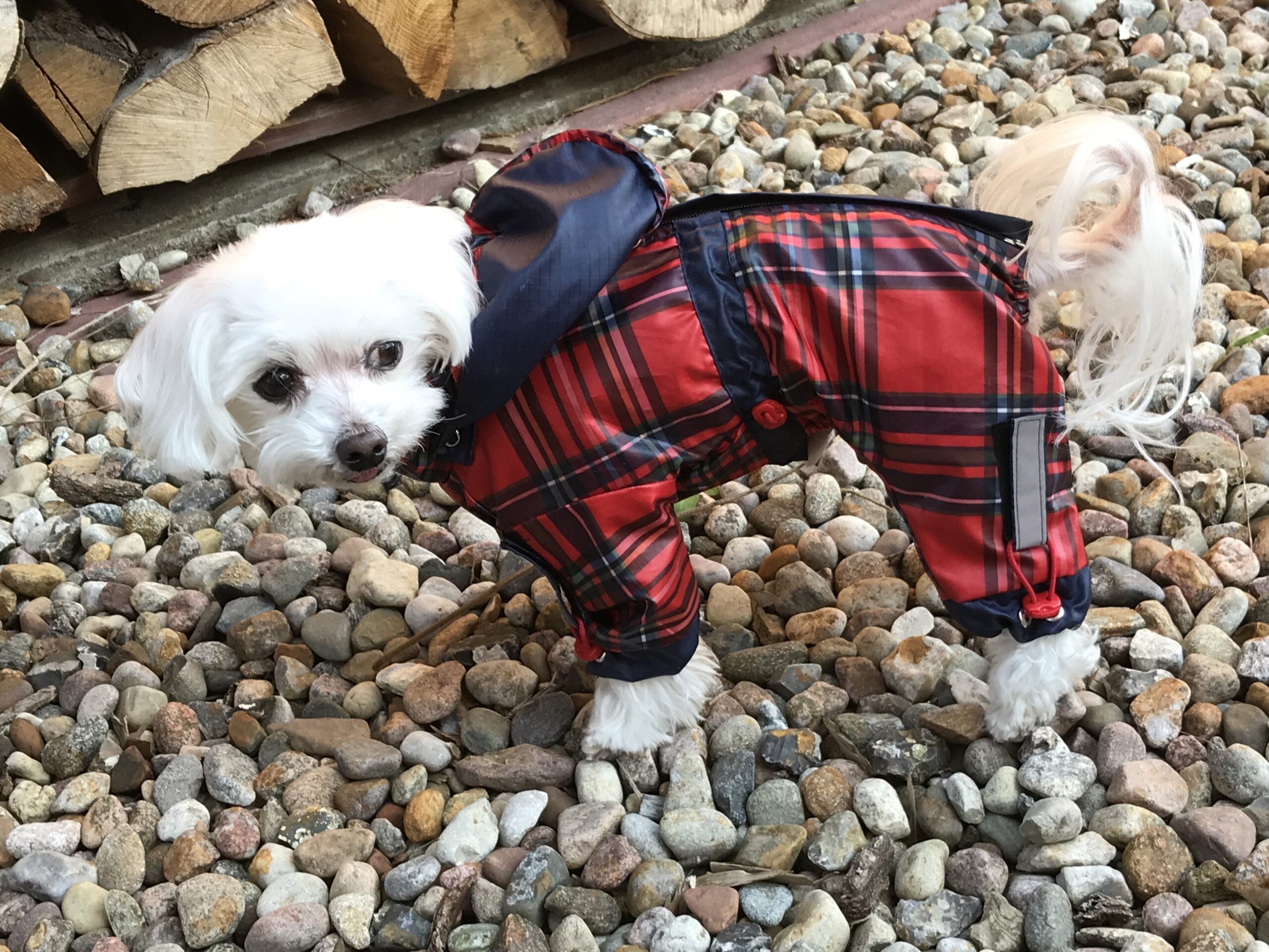 Das Mäntelchen ist super bei Schneewetter(verhindert die Schneeklumpen am Fell).