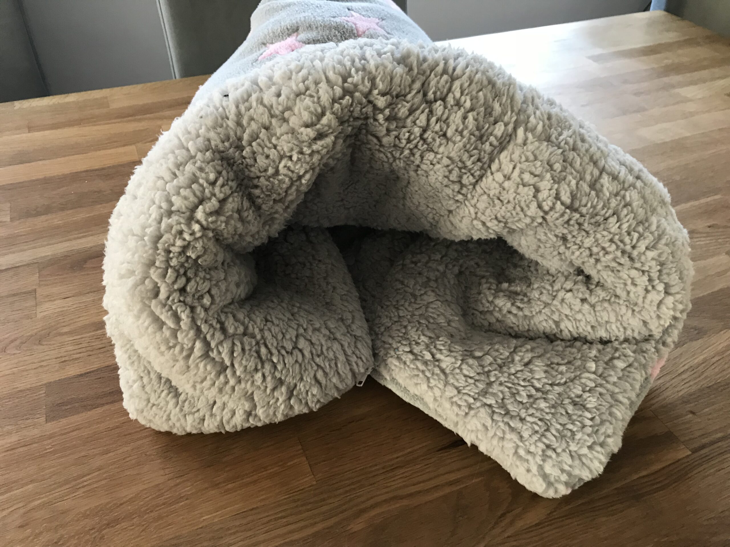 Bitte beim benuzten von dem Reisverschluss zuerst vorsichtig sein.Die kuschelige Seite hat langes Fell und kann am Anfang einklemmen.
