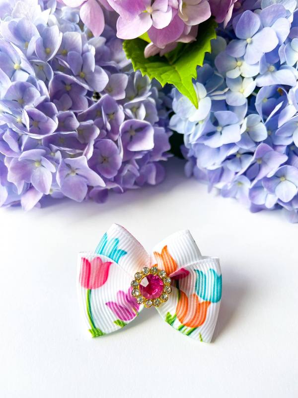 Die Schleife ist ca 4 x 4 cm groß.Die kleine Plastik Spange ist 2,5 cm lang