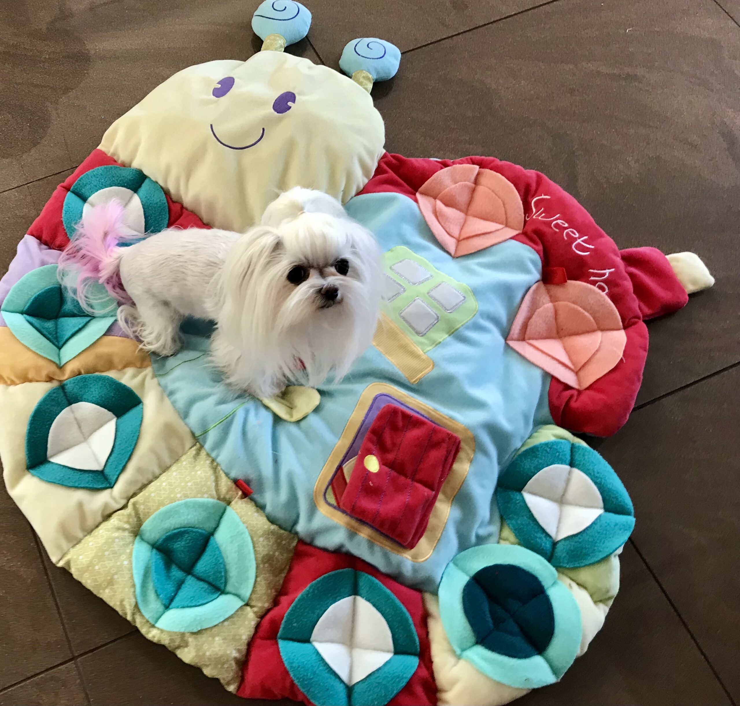 Wenn wir länger aus dem Haus gehen, befülle ich die Spielmatte mit Leckerlis – das beschäftigt die zwei eine Weile. Sie können auch Trockenfutter verstecken wenn der Hund z.B zu schnell aus der Schüssel frisst, wenn er sich mehr bewegen muss weil es zugenommen hat oder aber auch wenn er ein schlechter Esser ist wie meine Hunde – manchmal hilft das auch sehr gut.