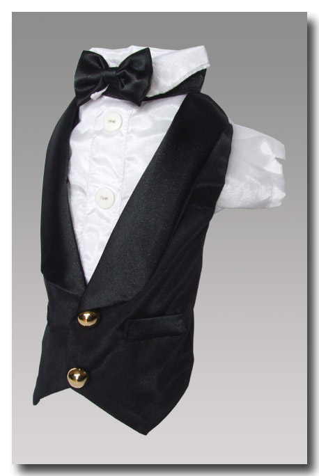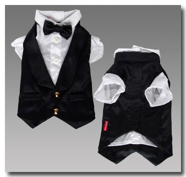 Model – CASINO-ROYALE mit FliegeDer Smoking wird dem Hund so angezogen,daß die Fliege am Rücken zu sehen ist.Zugemacht wird der Anzug am Bauch mit Klettverschluss.Einfach zum anziehen.
