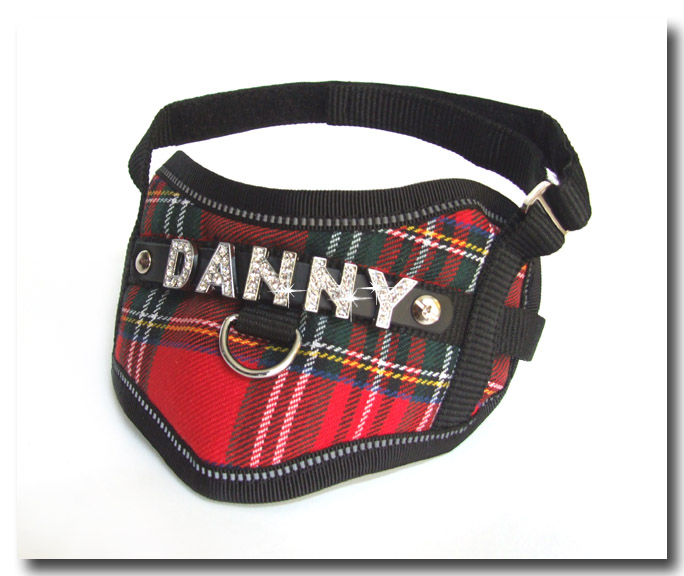Oben an dem Geschirr wird auf Wunsch HUNDENAME angebracht.Die Buchstaben mit blinkenden Strass-steinen passen auf das ca 1 cm breites Band.Sie können bis zu 6 Buchstaben wählen.