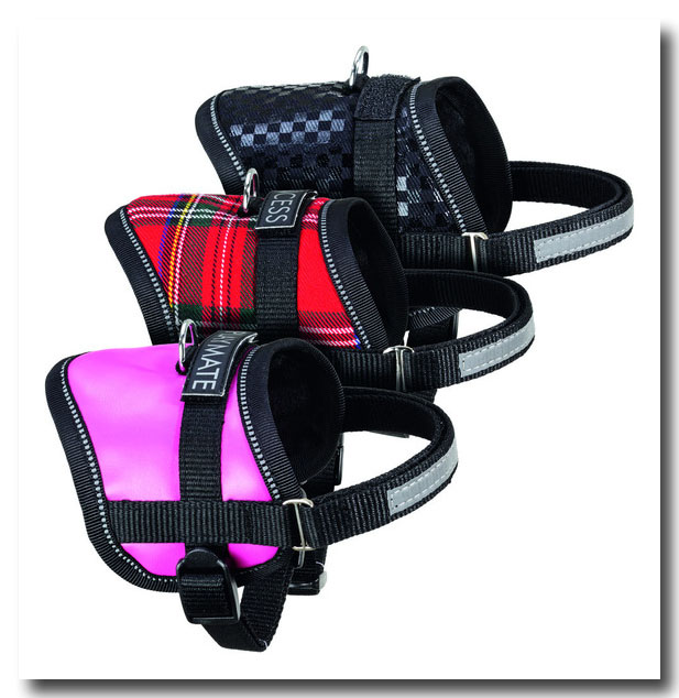 „Sattelgeschirr“ Der „Sattel ist von unten mit weichem Plüsch ausgekleidet.Oben gibt es D-Ring zum Anleinen Der Brustgurt des Geschirrs mit Reflektierstreifen verfügt über eine Klettfixierung
